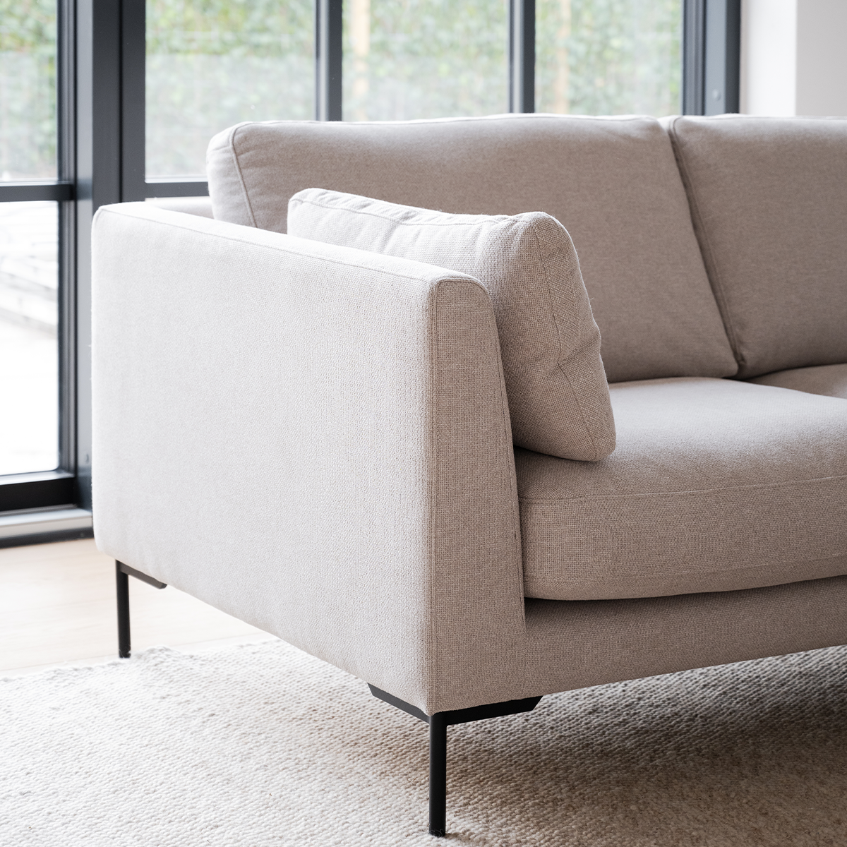 Dankzij de extra lange chaise longue mét dubbele rugleuning geniet je van ultiem comfort – zowel languit als zittend in de hoek. De luchtige uitstraling, rechte lijnen en afgeronde zwarte metalen poten geven de bank een stijlvolle, moderne uitstraling. De zitting is voorzien van duurzame nosag-veren (zigzagveren), die zorgen voor stevige ondersteuning en langdurig zitcomfort. De losse rugkussens maken het geheel speels én comfortabel. Gemaakt in Europa met FSC®-gecertificeerd hout, dus ook een verantwoorde keuze.