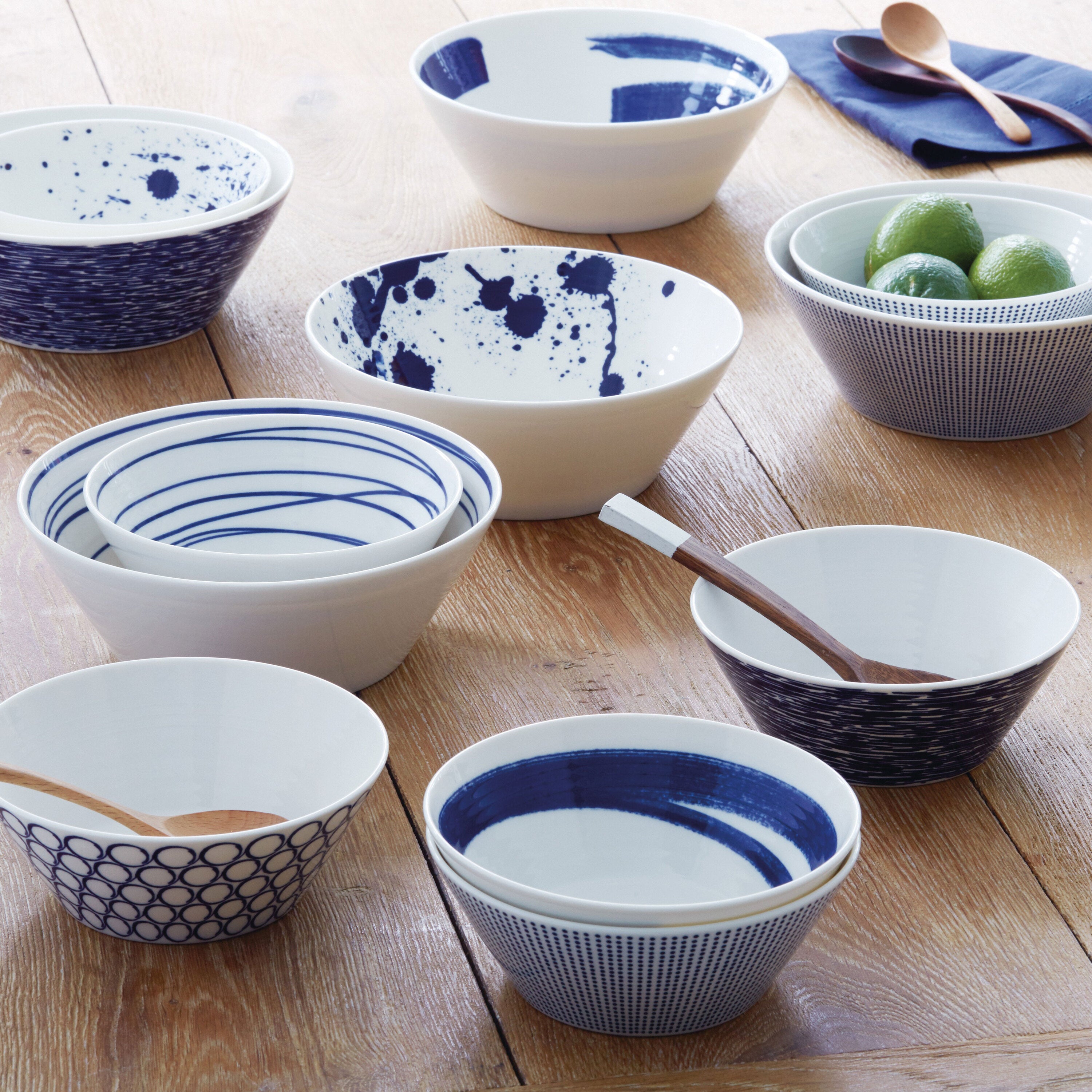 Royal Doulton Pacific Op het strand ontdek je schelpen, zie je golven en de diepblauwe zee. Het Pacific servies van Royal Doulton is gebaseerd op die prachtige momenten op het strand. Het witte servies is versierd met diep blauwe stippen, lijnen of verfspetters waarmee je gemixt ook een prachtige tafel dekt. Het servies is geschikt voor de vaatwasser en de magnetron.