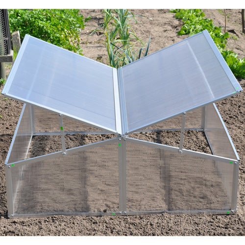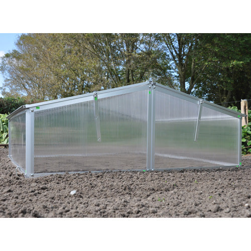Deze broeikas beschermt de groentes tegen, regen, wind, hagel, nachtvorst en ongedierte zoals slakken. Deze kas wordt met vier grondpennen in de volle grond vastgezet. Hij is in elkaar te zetten met 1 maat schroef en vierkante moeren.