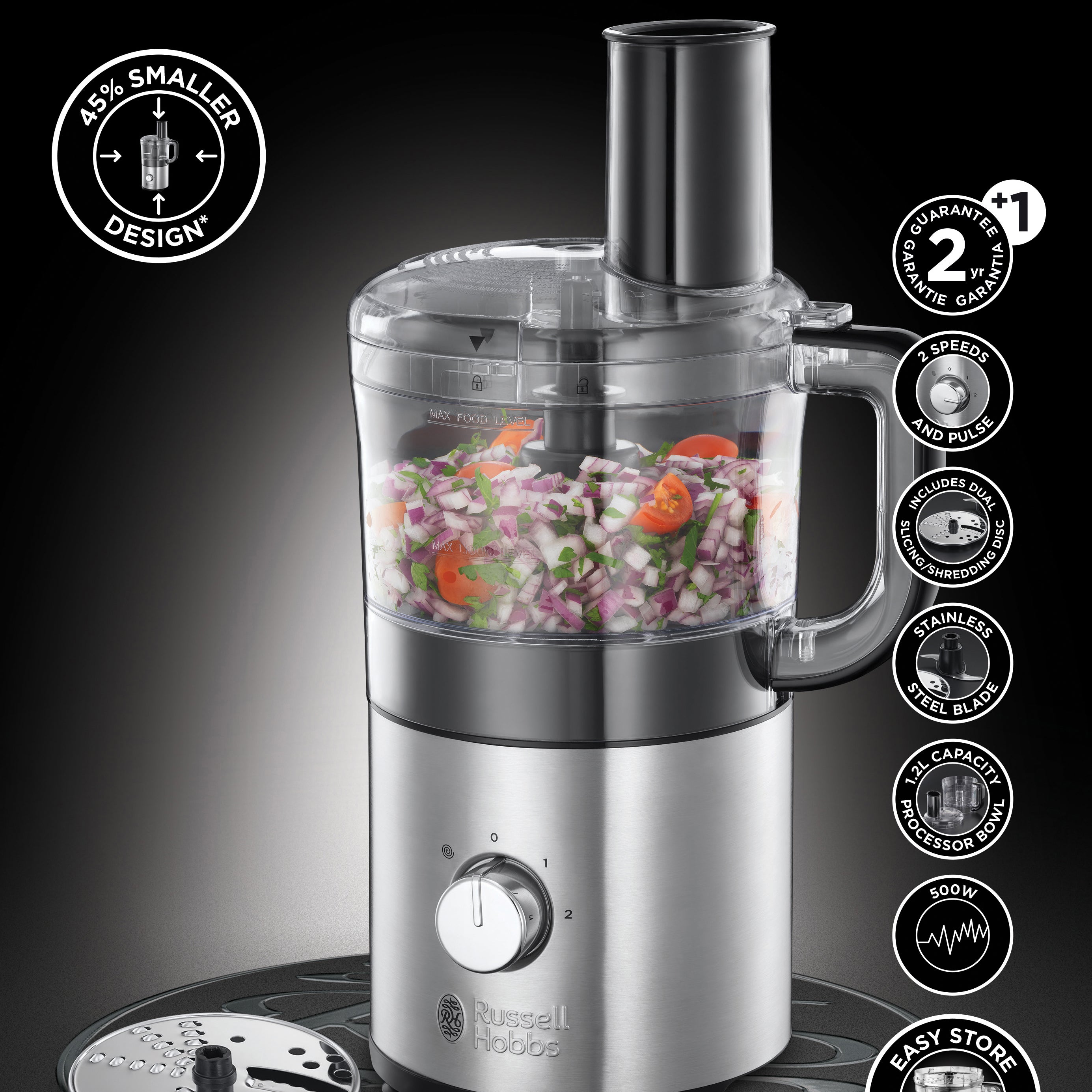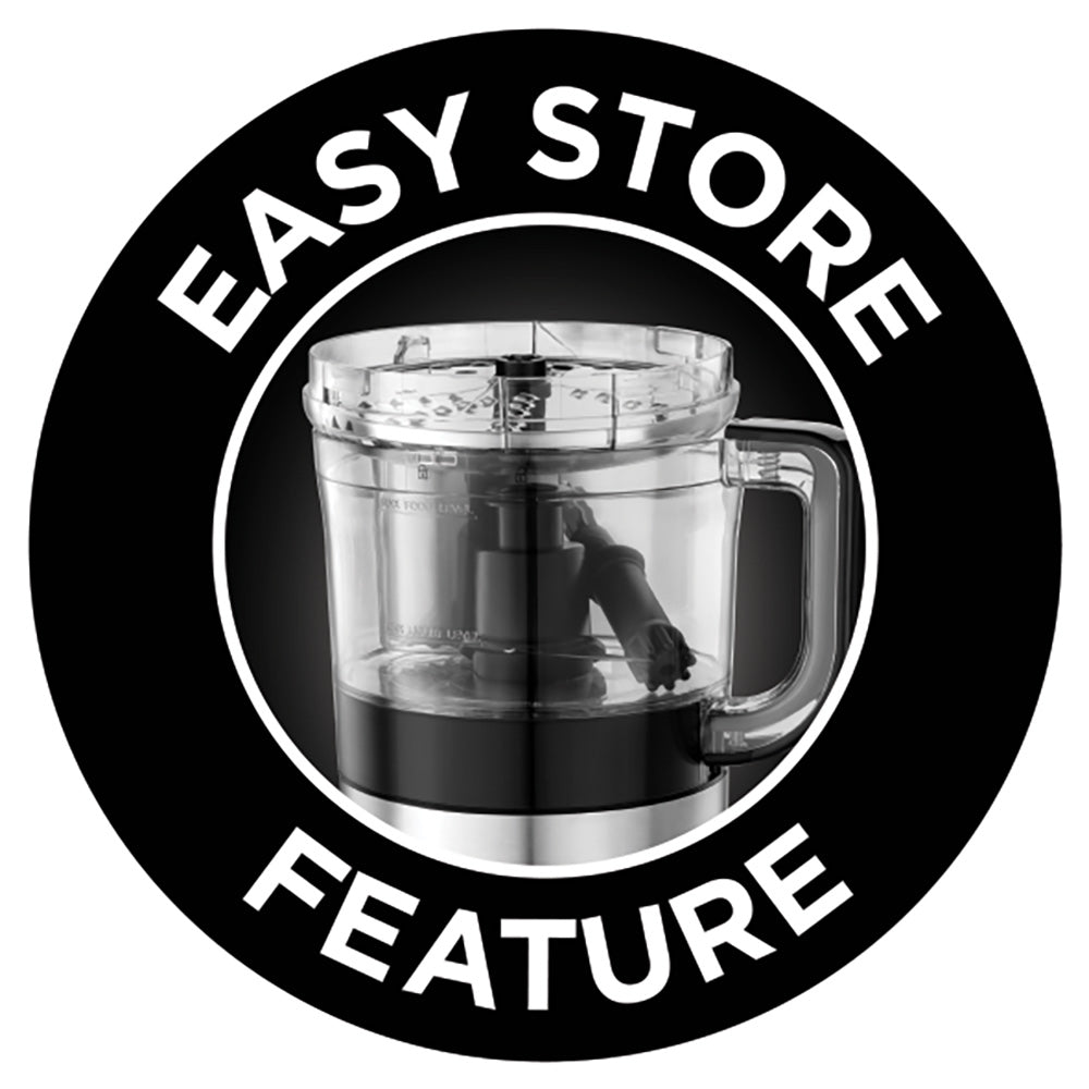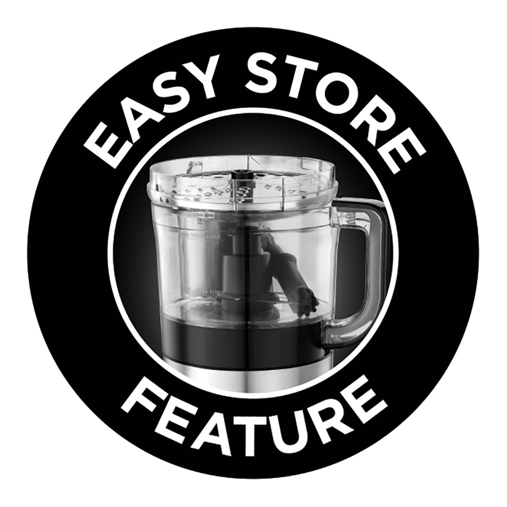 Russell Hobbs heeft een speciale serie ‘Compact Home’ waarbij de producten compact ontworpen zijn en ruimte besparen. Deze foodprocessor heeft een 45% kleiner ontwerp en een inhoud van 1,9 liter. Het heeft een grote kom met verschillende opzetstukken zoals onder andere een dubbele snij- en raspschijf. Hakken, raspen, mengen, mixen en snijden, de mogelijkheden zijn eindeloos. De opzetstukken passen op elkaar in de grote kom, waardoor je de foodprocessor makkelijk opbergt na gebruik.