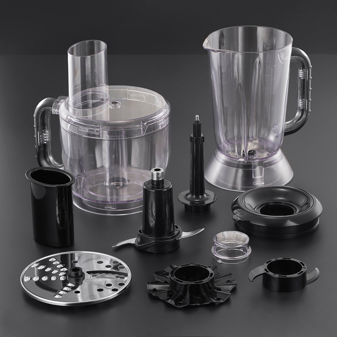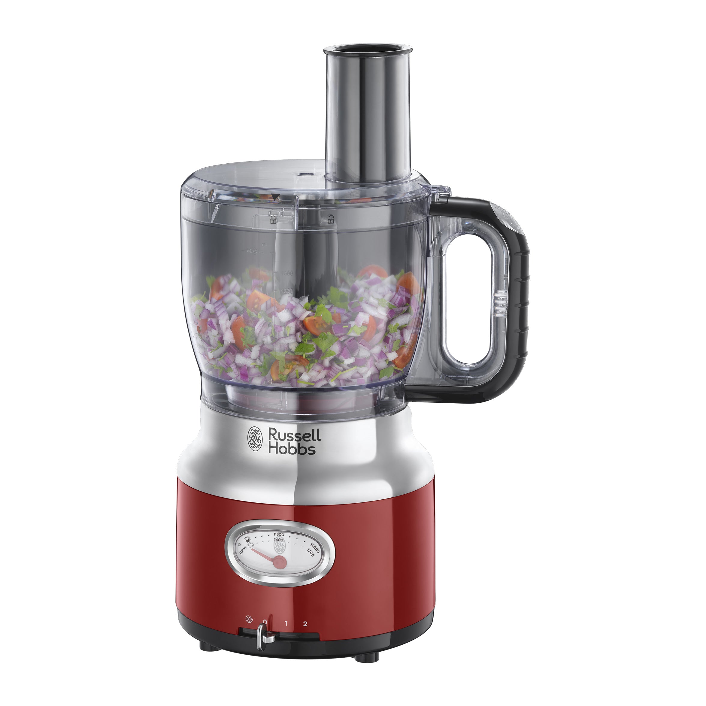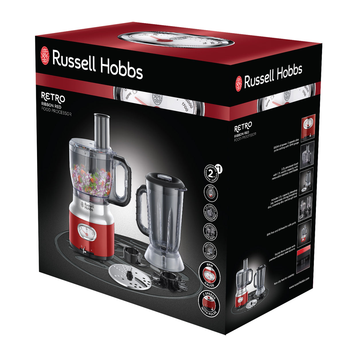 Russell Hobbs retro foodprocessor Deeg, pesto, geraspte kaas, smoothie, soep... Het maakt allemaal niet uit! Met de Russell Hobbs foodprocessor met blenderkan maak je alles snel en vakkundig tot moes, smeersel of soep! De processorkom heeft een bruikbare inhoud van 1,7 liter: dat is een hele hoop pesto. De retro foodprocessor is naast de standaard messen uitgerust met een omkeerbare snij- en raspschijf, een emulgeerschijf en een deegmes zodat jij de meest uiteenlopende gerechten klaarmaakt. De machine kan op twee snelheden draaien en heeft een pulseerstand om alle hardnekkige stukken fijn te maken.