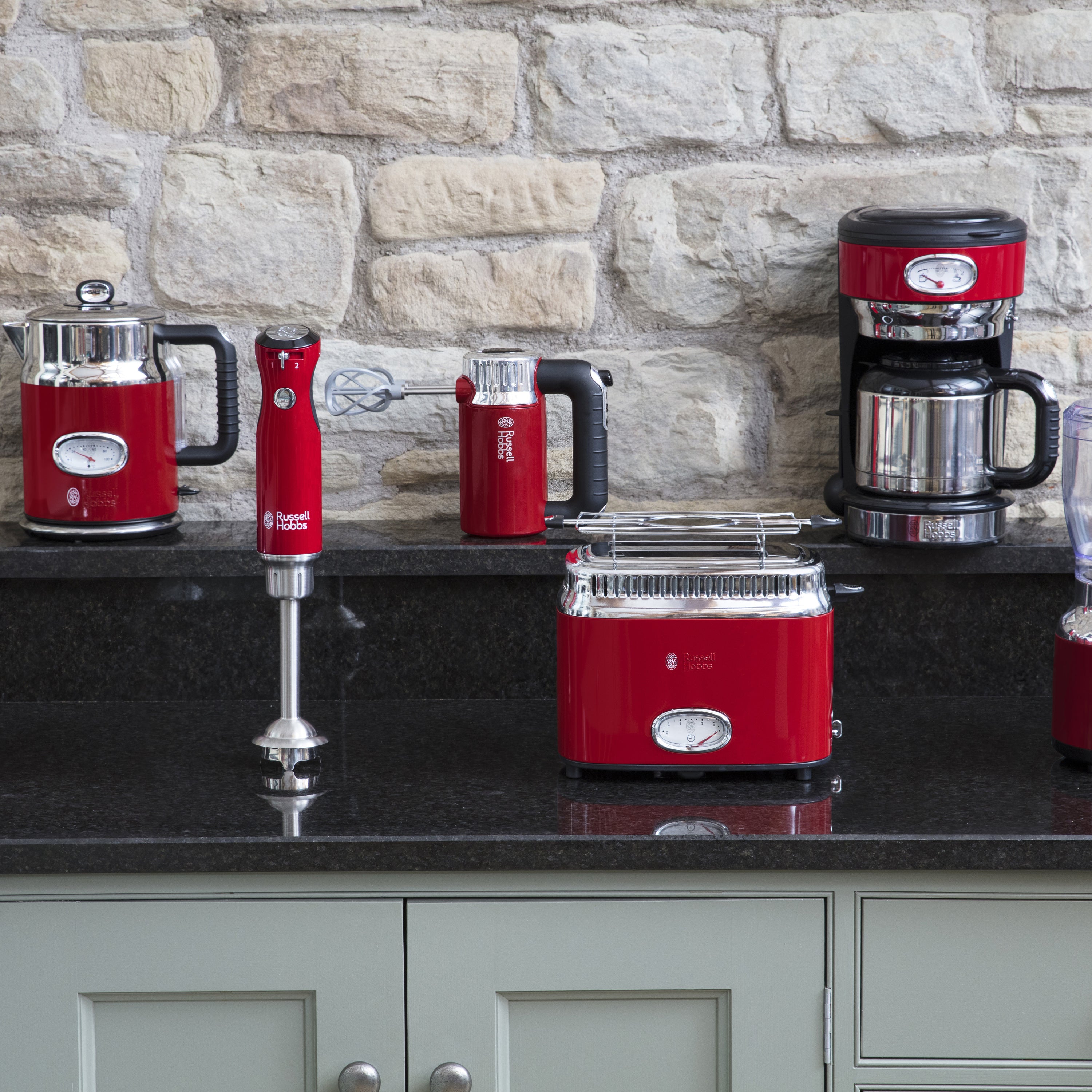 Stijlvolle toevoeging aan je keuken Het retro ontwerp van de Russell Hobbs retro foodprocessor doet meteen denken aan de vorige eeuw. Laat je echter niet voor de gek houden, het is een zeer moderne en krachtige keukenhulp! De klassieke kleuren en roestvrijstalen accenten voelen authentiek en staan prachtig in een retro keuken. Het analoge display toont met een ouderwets wijzertje het aantal toeren per minuut dat de machine maakt. Het staat voor de blender en voor de foodprocessor apart aangegeven zodat je goed ziet hoe snel hij gaat. De antislipvoetjes van de Russell Hobbs retro foodprocessor zorgen ervoor dat de machine stevig op je aanrecht staat. Alle onderdelen die met je eten in aanraking komen zijn BPA-vrij.
