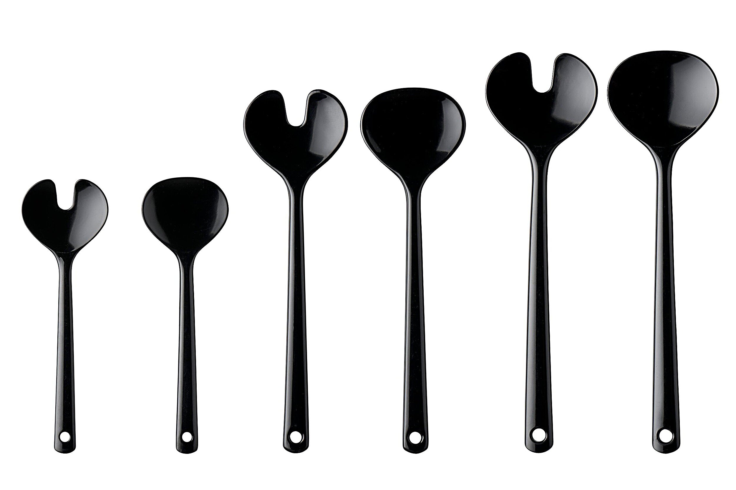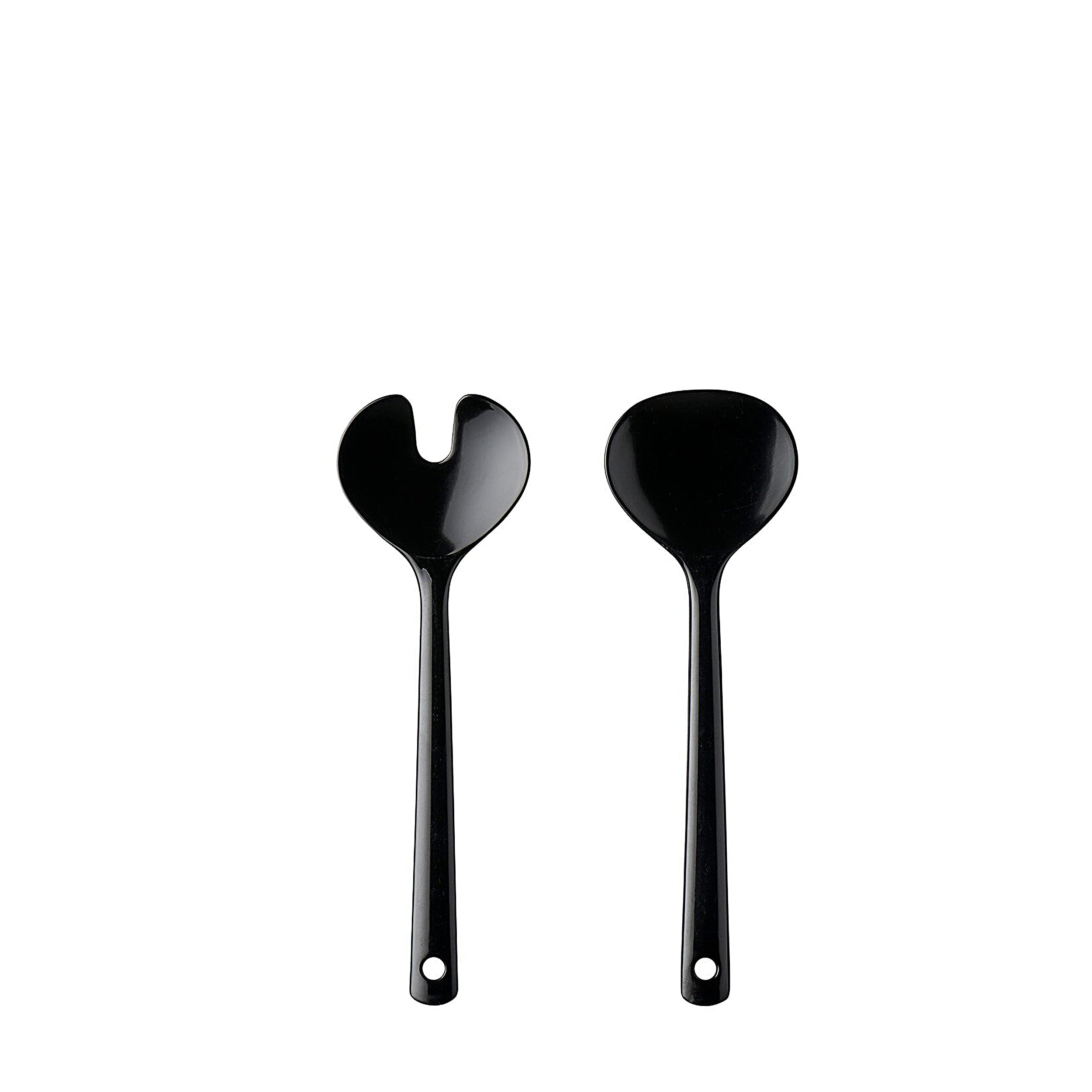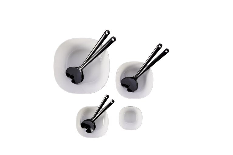 Slacouvert Synthesis in de kleur zwart. Dit 2-delige saladebestek bestaat uit een kleine slalepel en slavork en past perfect bij de Synthesis saladeschalen. Het saladebestek is licht van gewicht en mag na gebruik in de vaatwasser.