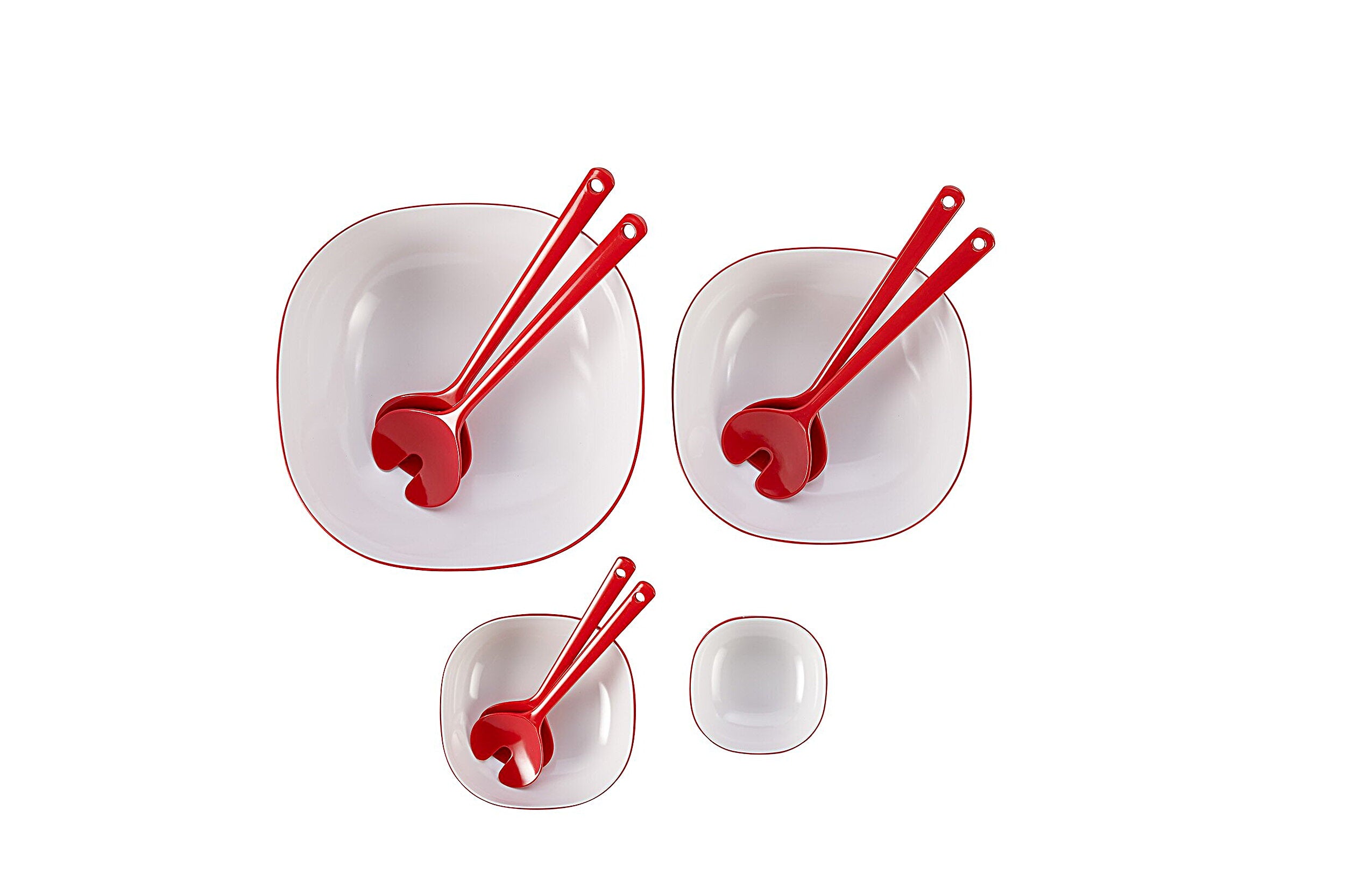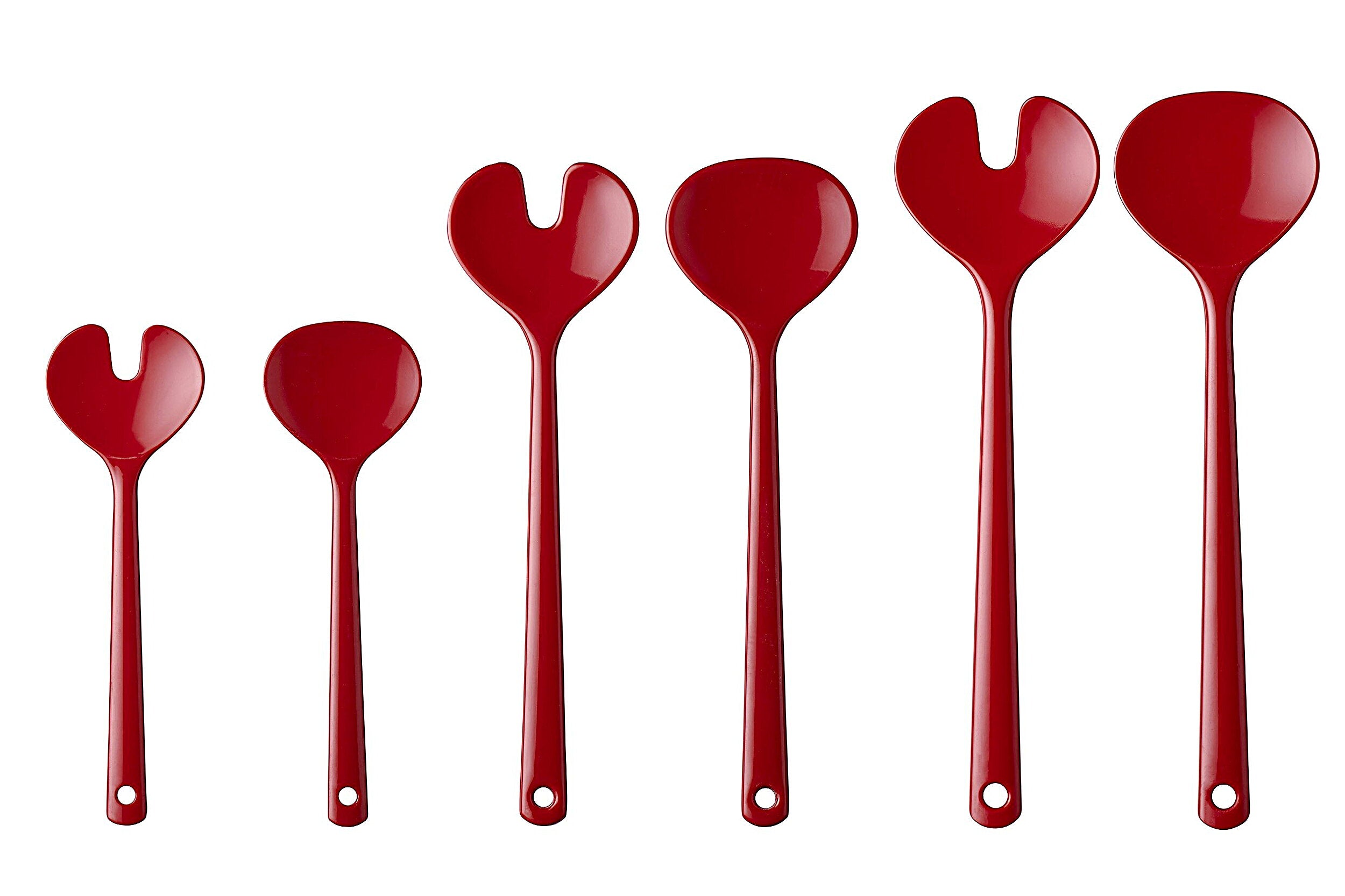 Slacouvert Synthesis in de kleur luna rood. Dit 2-delige slabestek bestaat uit een grote slalepel en slavork en past perfect bij de rode saladeschaal Synthesis 2.5 of 4.0 liter.