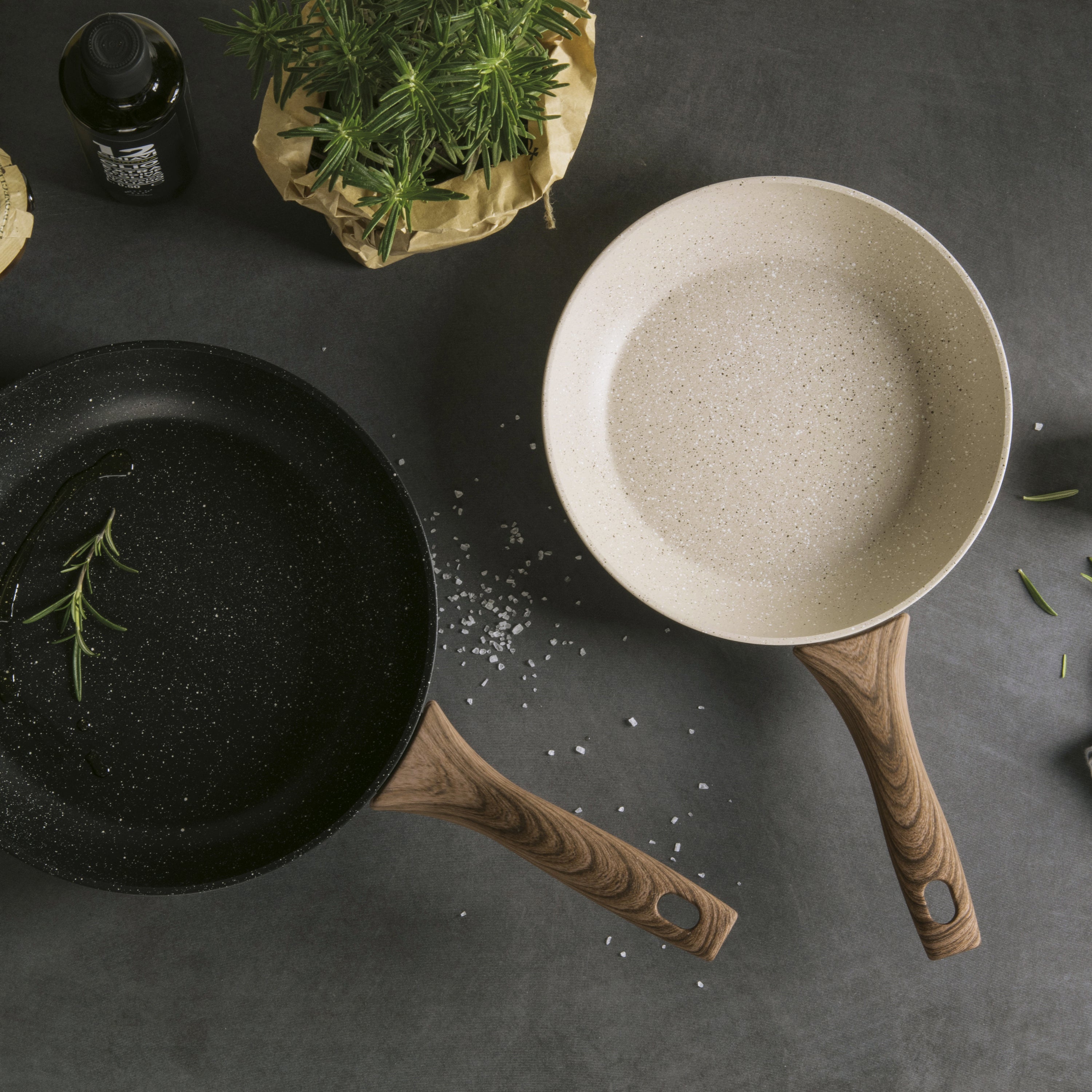 De Sambonet pannen zijn gemaakt van gegoten aluminium en hebben een krasbestendige mineralen antibaanbaklaag die vrij is van nikkel, zware metalen en PFOA. De pannen zijn opgebouwd uit vijf lagen: