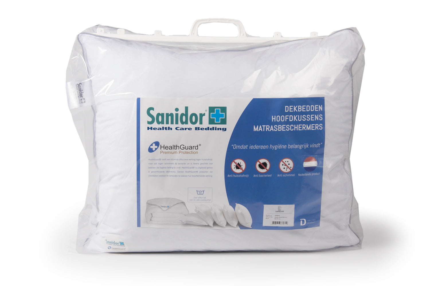 Sanidor anti bacterieel, anti huisstofmijt, anti schimmel heerlijk zacht hoofdkussen! Heerlijk anti allergie hoofdkussen. Dit nieuwe ontwikkelde HealthGuard hoofdkussen heeft een blijvende effectieve werking tegen huisstofmijt, maar ook tegen schimmels & bacteriën. Dit kussen is geschikt voor iedereen die hygiëne belangrijk vindt. HealthGuard® is uitgebreid getest in gecertificeerde laboratoria. Sanidor HealthGuard® producten zijn uitstekend wasbaar en behouden na wassen hun beschermende werking. Het kussen is wasbaar op 60 graden voor extra hygiëne.
