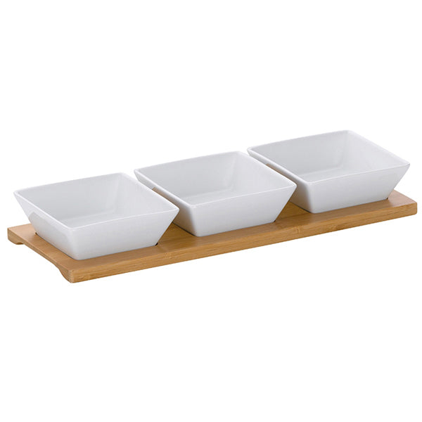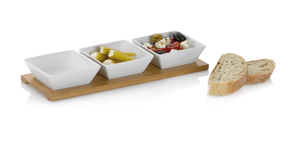 Borrelnootjes, olijfjes, stukjes komkommer, radijsjes. Zo kunnen we nog wel even doorgaan met benoemen van hetgeen we tijdens gezellige avondjes op tafel zetten. Maar hoe vaak komt het niet voor dat je op je gasten indruk wilt maken en er nét even geen dezelfde schaaltjes beschikbaar zijn? Zoek dan maar niet verder, want met deze schaaltjes set van Kela heb je 3 porseleinen schaaltjes op een schitterende bamboe tray.