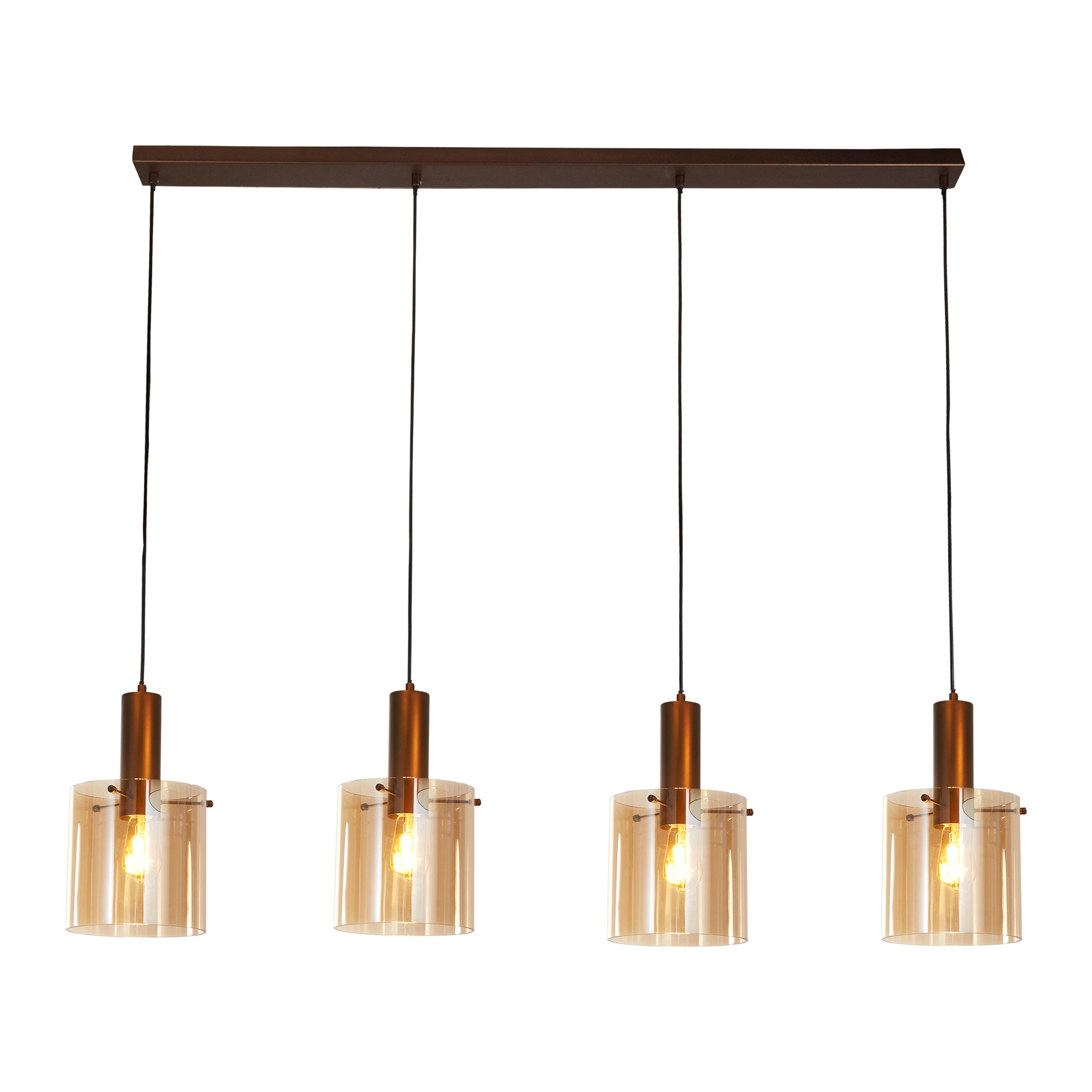 - Amberkleurige glazen kappen geven een warme gloed