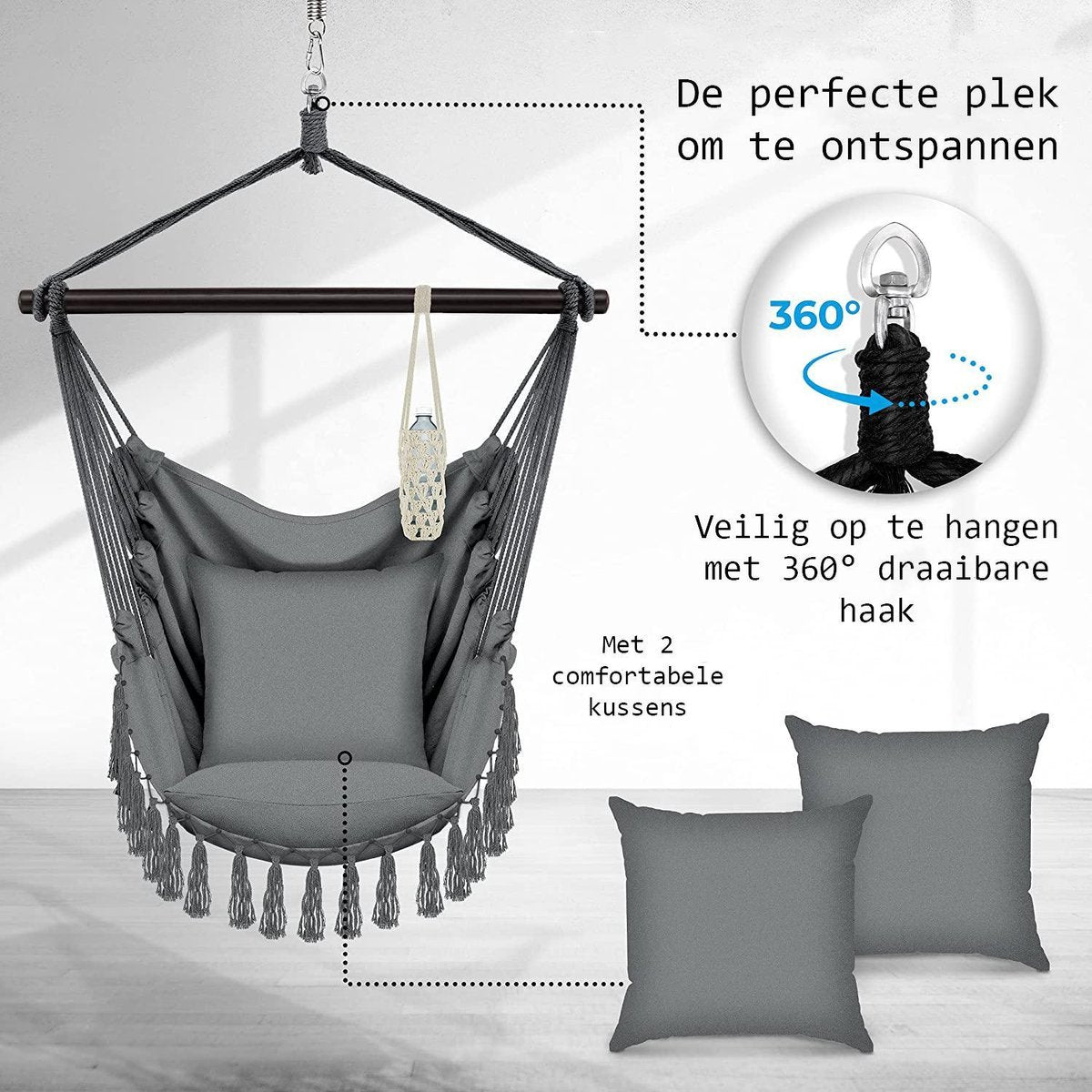 Heerlijk ontspannen doe je in deze hangstoel van Sens Design. De stoel heeft een moderne look en is gemaakt van zeer duurzaam materiaal dat UV en vuil-bestendig is. Hierdoor is de hangstoel ook uitermate geschikt voor gebruik buitenshuis. Hang de stoel in de woonkamer, op het terras, balkon of in de tuin, voor urenlang relaxplezier. De vele accesoires bij deze stoel, maken de stoel helemaal af, en een must voor jouw huis of tuin! Vele accessoires, aan alles is gedacht! Wanneer je in deze hangstoel aan het relaxen bent, hoef je je nooit af te vragen waar je je drankje kunt plaatsen, of te zoeken naar je favoriete boek. De hangstoel heeft een hangtasje aan het frame, waar je je flesje in kwijt kunt. Een opbergvak in de stof van de stoel, is speciaal geplaatst voor het bewaren van je telefoon, tablet of boek. En wanneer je de stoel opbergt of vervoert, komt de opbergtas goed van pas.Ook heeft deze stoel 2 heerlijk grote en zachte kussens om het relaxen nog aangenamer te maken. De dwarsbalk waaraan de stoel hangt, heeft inkepingen zodat de stoel er niet af kan glijden. Deze balk is bovendien zeer robuust, waardoor de hele stoel een draagkracht van 150kg heeft. Houd er met ophangen rekening mee dat de bevestiging aan het plafond of boom, deze draagkracht ook aan moet kunnen! Specificaties