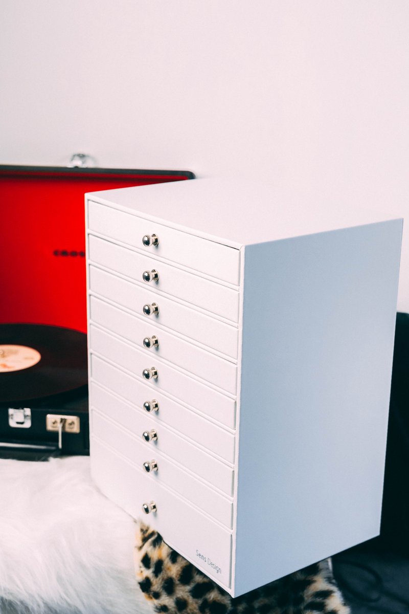De Sens Design luxe juwelendoos/kast is gemaakt van geborsteld leer en daardoor zeer comfortabel en voelt zacht aan. De binnenvoering is gemaakt van grijs fluweel zodat jouw sieraden optimaal worden beschermd! Grote opslagruimte Dit juwelenkastje heeft een enorme capaciteit voor het opbergen en heeft maarliefst 6 vakken met allemaal een andere indeling. Hierdoor kun je de verschillende type sieraden bij elkaar sorteren.De juwelendoos is gemaakt van MDF en heeft daardoor een lange levensduur en houd het gewicht laag waardoor hij gemakkelijk te verplaatsen is. Doordat hij wel stevig is, voorkomt het dat hij wegglijd of omvalt.De stijlvolle en elegante juwelendoos is heel erg leuk om te krijgen en staat in iedere ruimte in huis. Specificaties