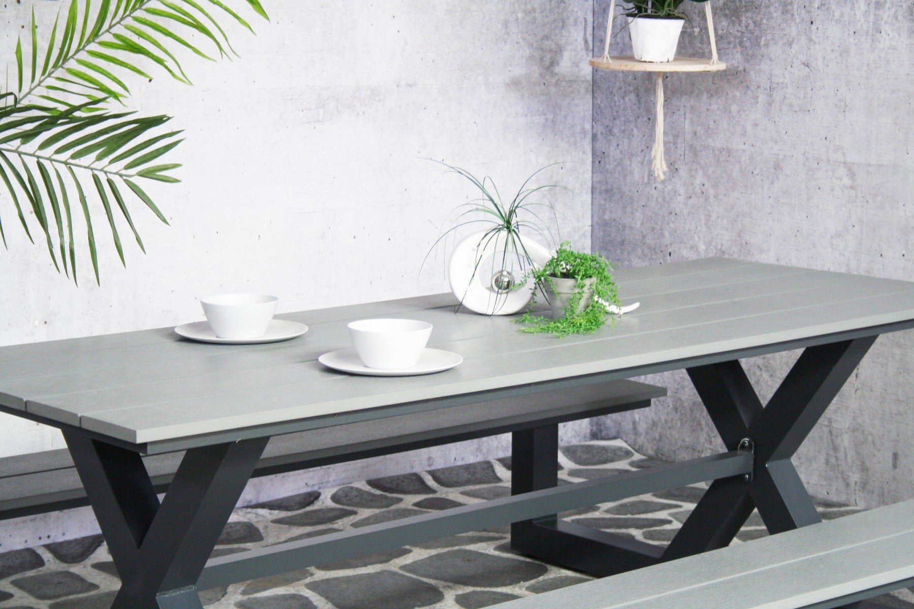- Gemaakt van aluminium met een polywood blad en zitting; kunststof dat op hout lijkt
