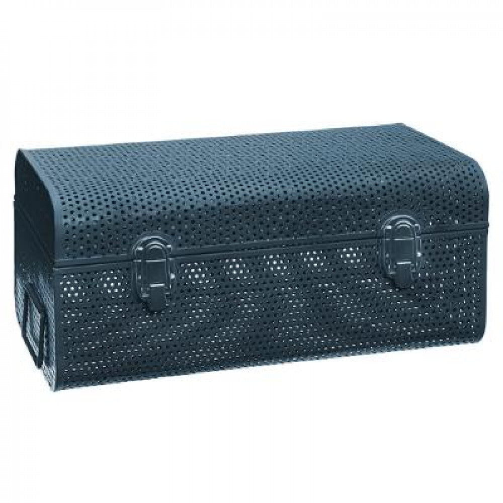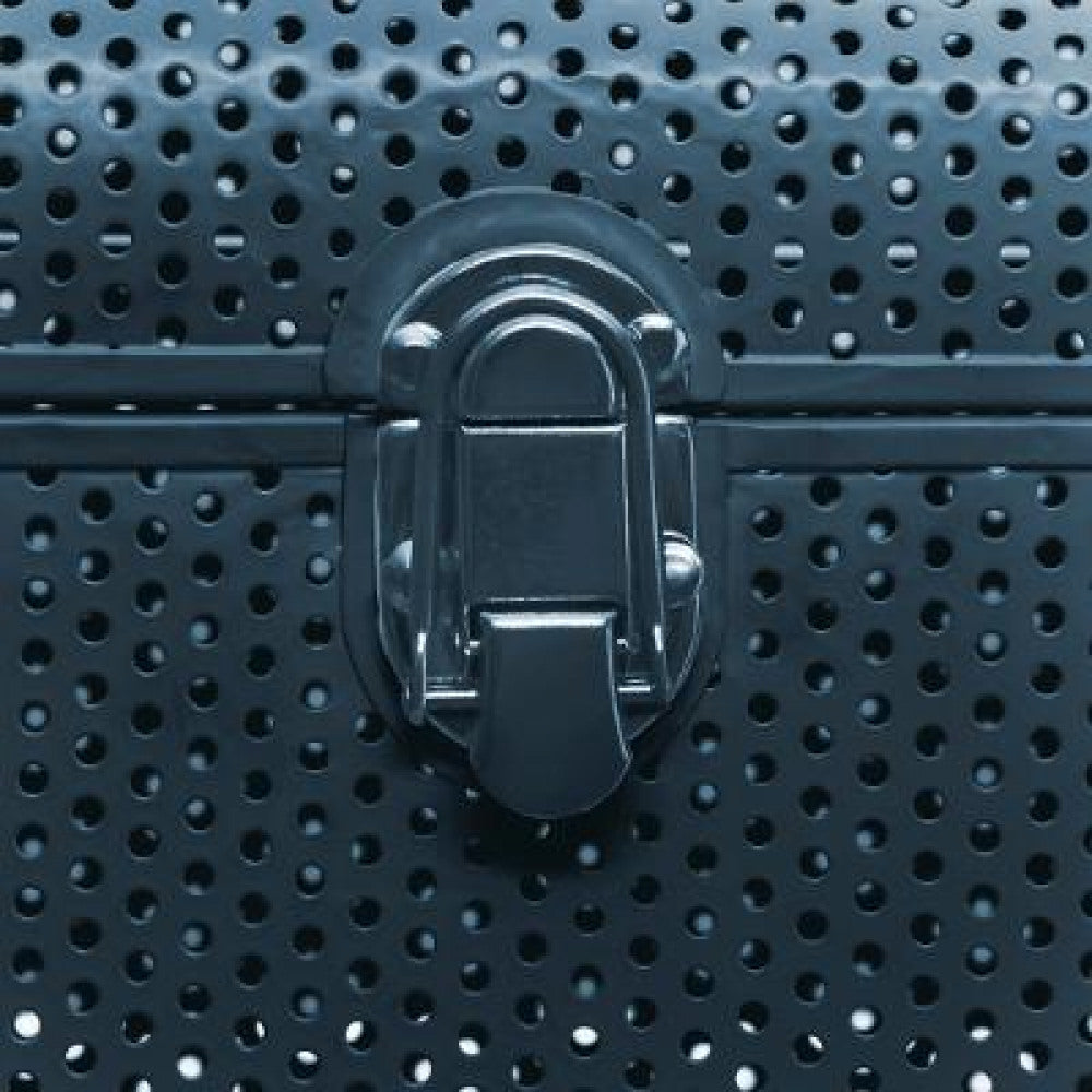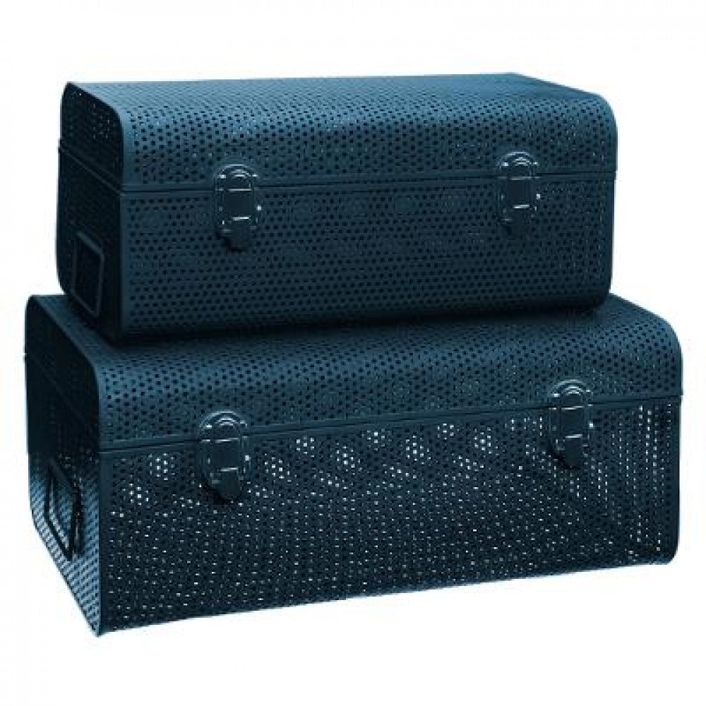 Set van twee Petrol Blauwe geperforeerde metalen Opbergkisten met afgeronde hoeken, met handgrepen aan elke kant en 2 sluitingen aan de voorkant. Plek tekort om jouw spullen op te bergen? Een opbergkist is de oplossing! Je kunt je spullen erin opbergen en daarnaast staat het ook nog eens mooi in je interieur.