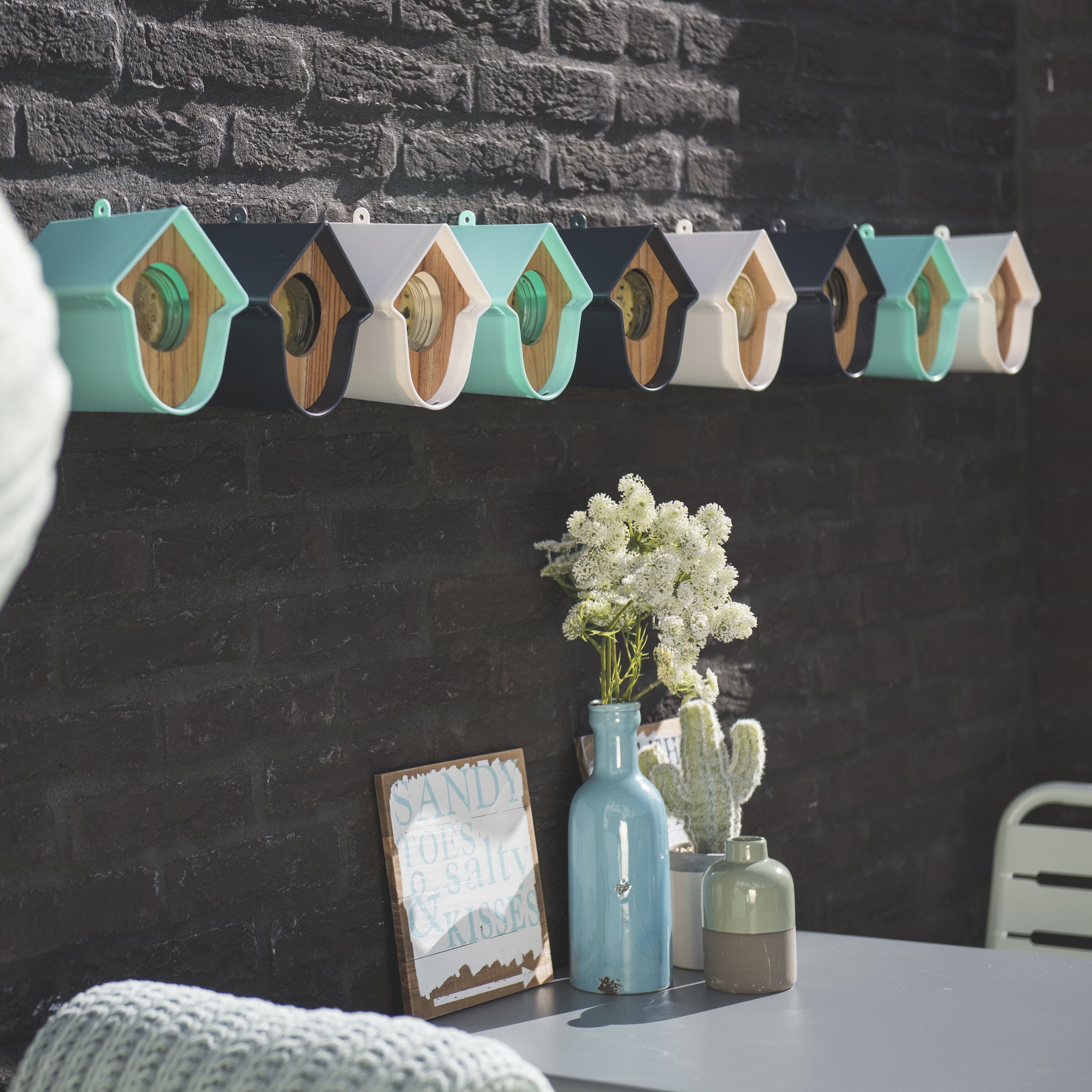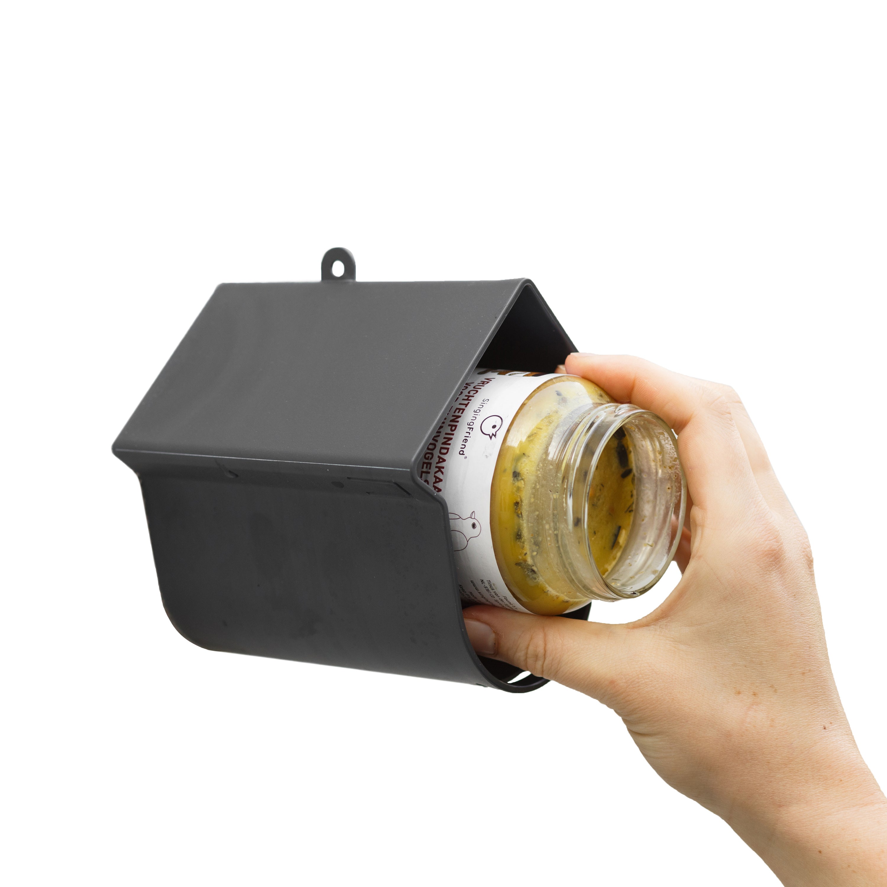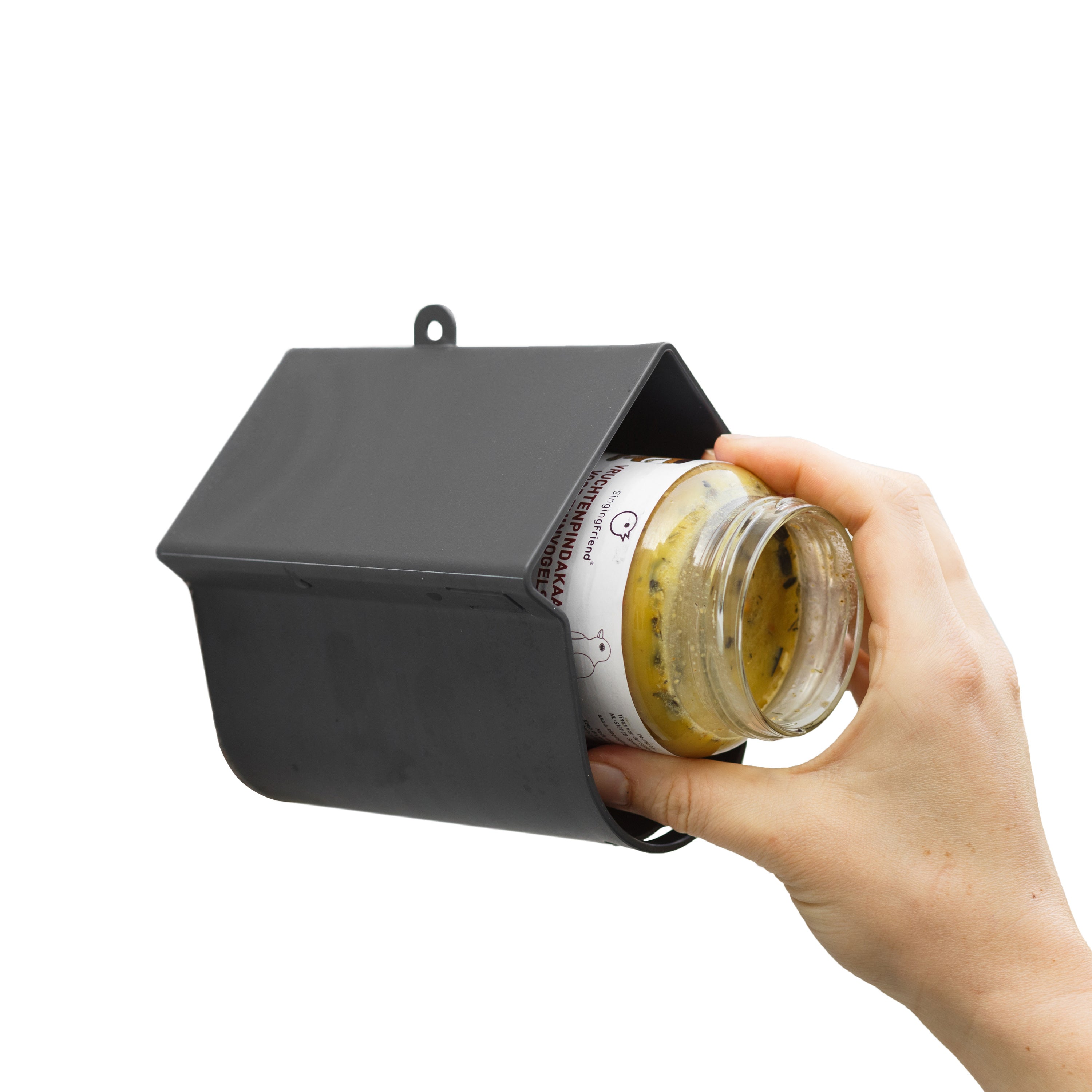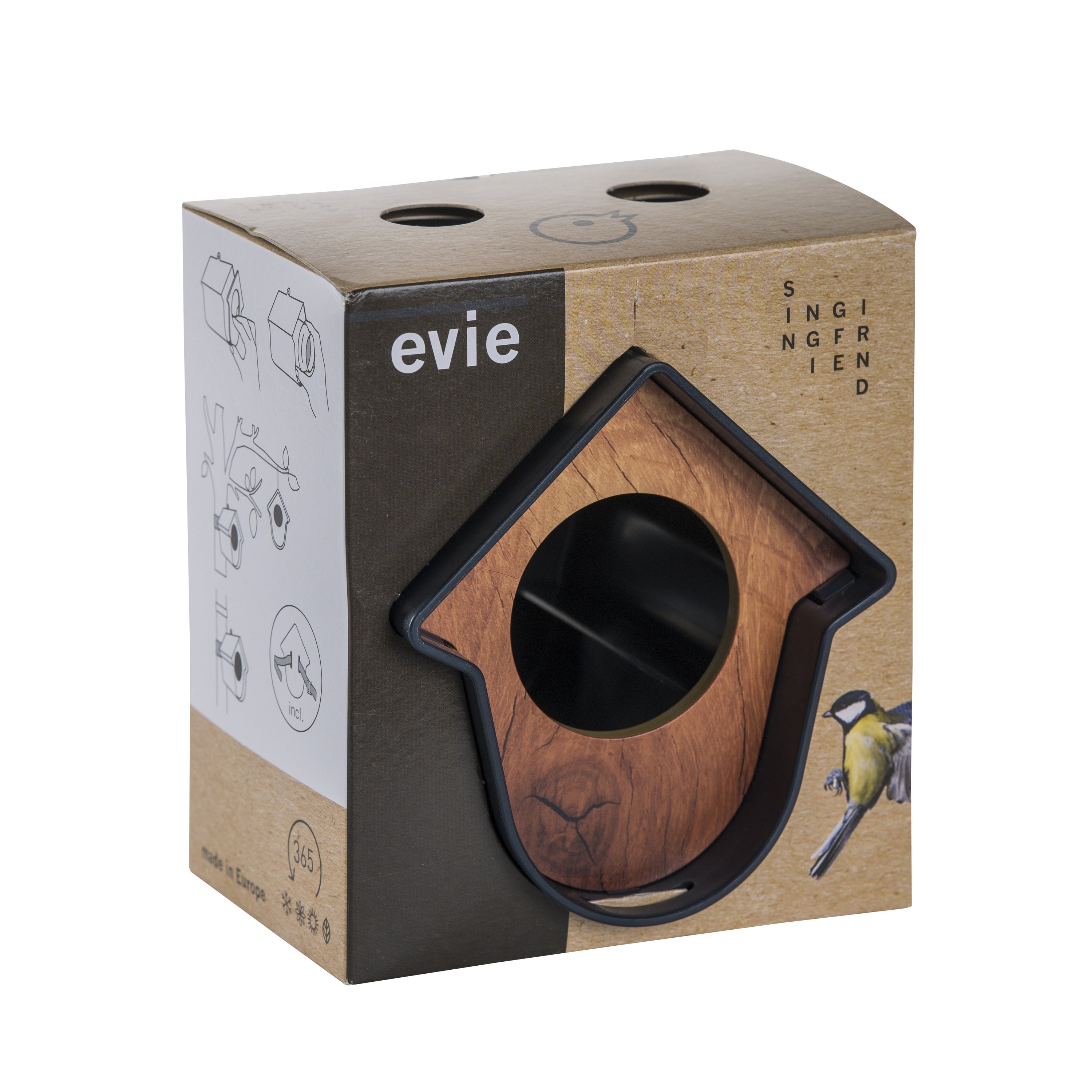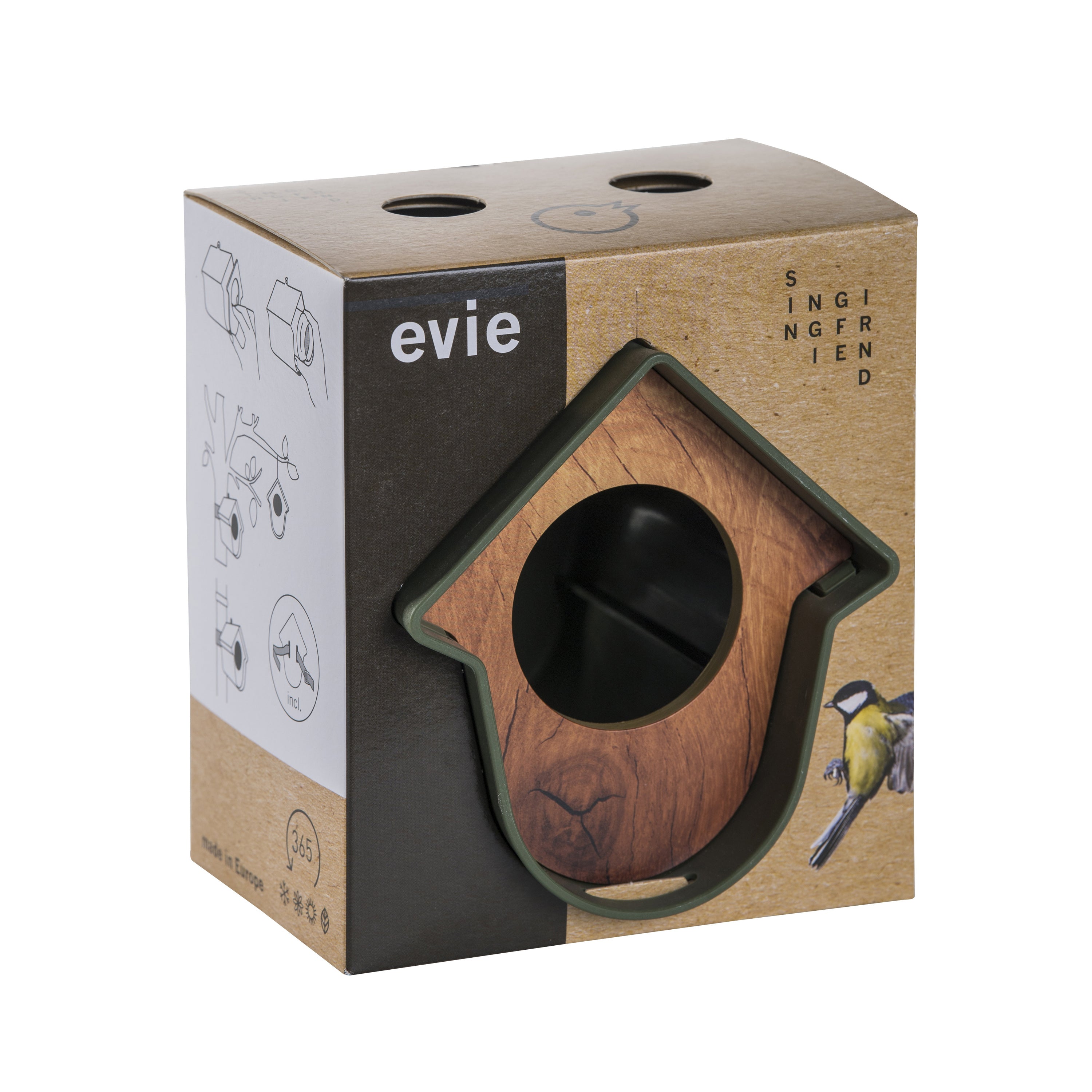 Eenvoudige bevestiging Je bevestigt de Evie eenvoudig aan je schutting, regenpijp of een boom. Hiervoor wordt klittenband meegeleverd, maar je kunt hem ook met schroeven (excl.) bevestigen of met een haakje in de boom hangen. Het plaatsen van de pindakaaspot (niet meegeleverd) is trouwens heel eenvoudig: haal het frontje eruit, plaats de pot in het huisje en klik het frontje terug. Gebruik wel altijd echte vogelpindakaas, deze bevat namelijk weinig zout. Geef je de vogels liever ander voer? Vul het huisje dan met vetbollen, pinda's of een stuk appel.