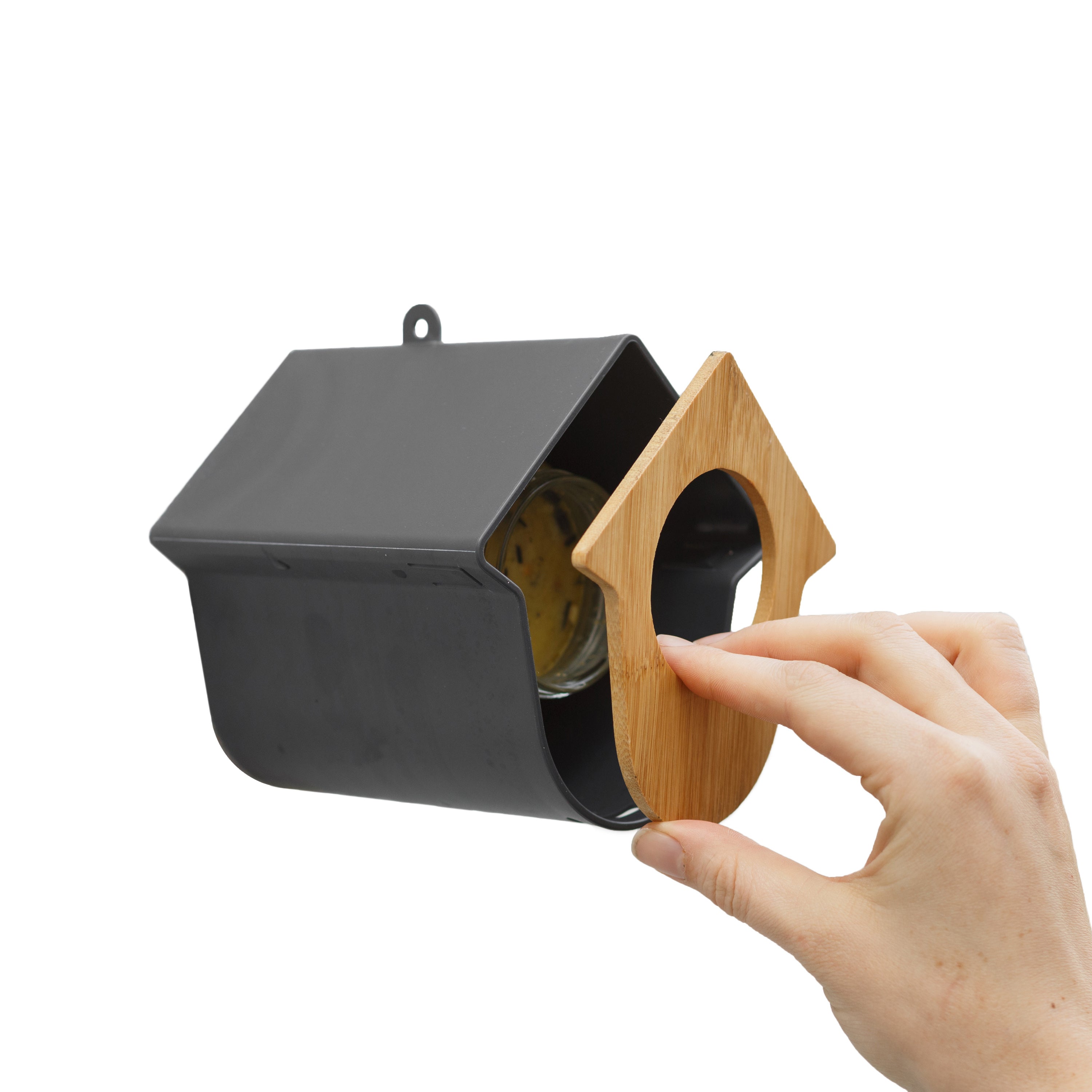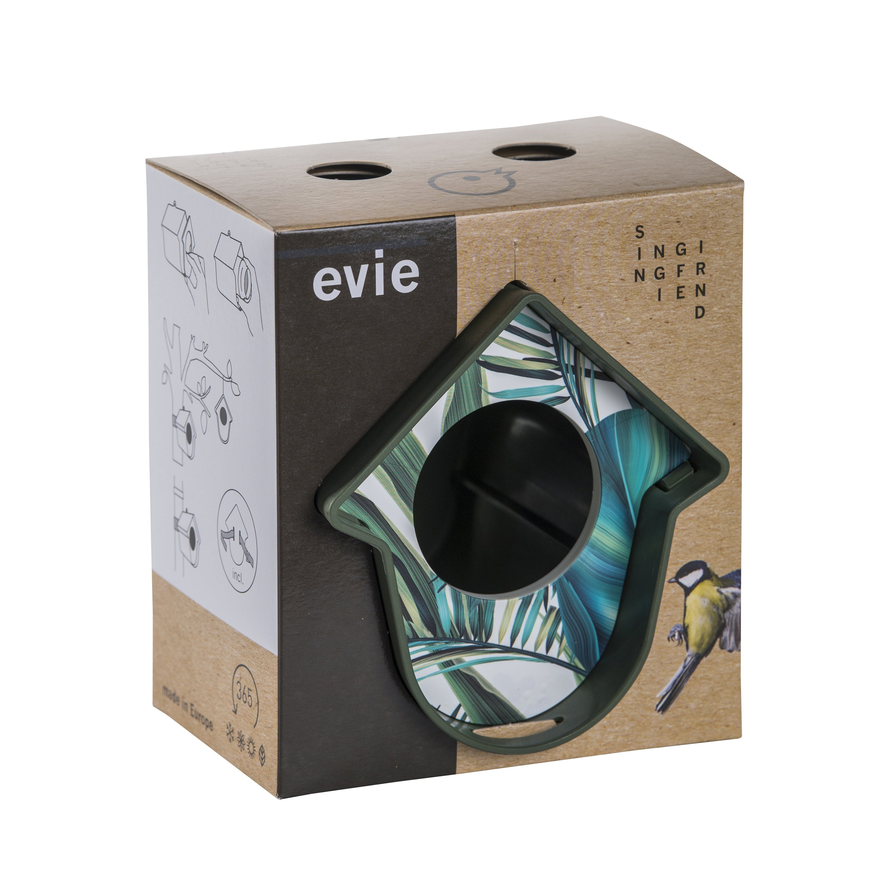 Eenvoudige bevestiging Je bevestigt de Evie eenvoudig aan je schutting, regenpijp of een boom. Hiervoor wordt klittenband meegeleverd, maar je kunt hem ook met schroeven (excl.) bevestigen of met een haakje in de boom hangen. Het plaatsen van de pindakaaspot (niet meegeleverd) is trouwens heel eenvoudig: haal het frontje eruit, plaats de pot in het huisje en klik het frontje terug. Gebruik wel altijd echte vogelpindakaas, deze bevat namelijk weinig zout. Geef je de vogels liever ander voer? Vul het huisje dan met vetbollen, pinda's of een stuk appel.