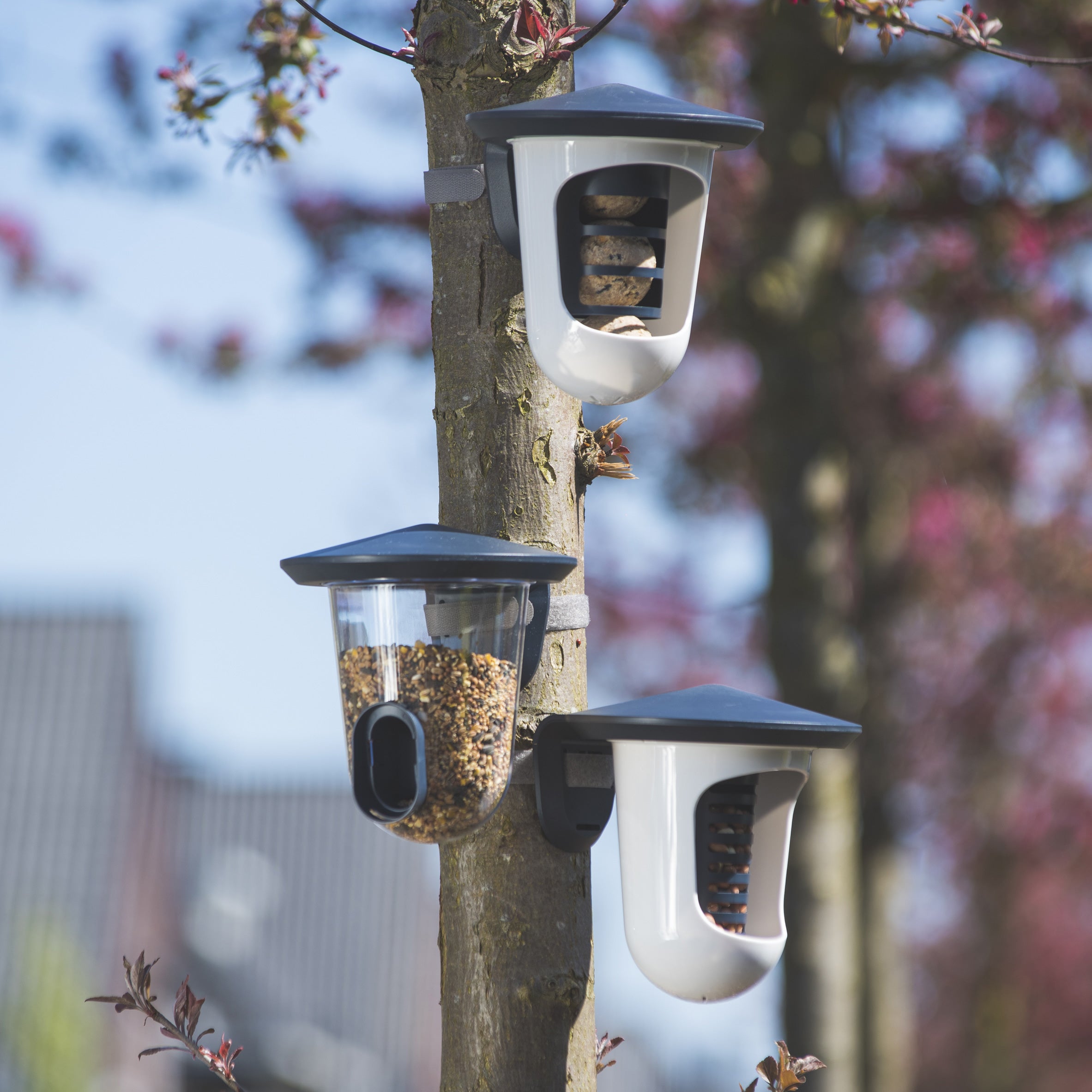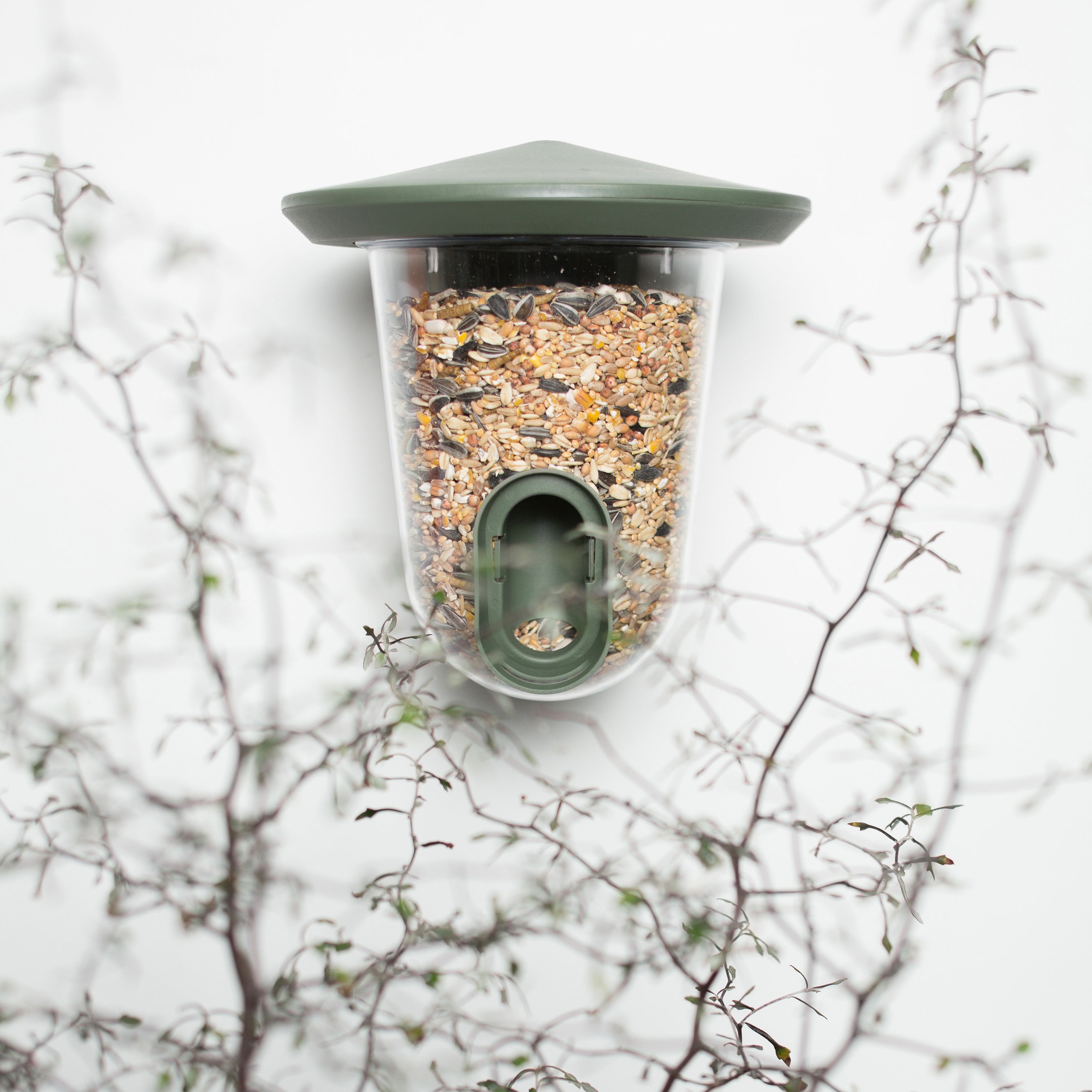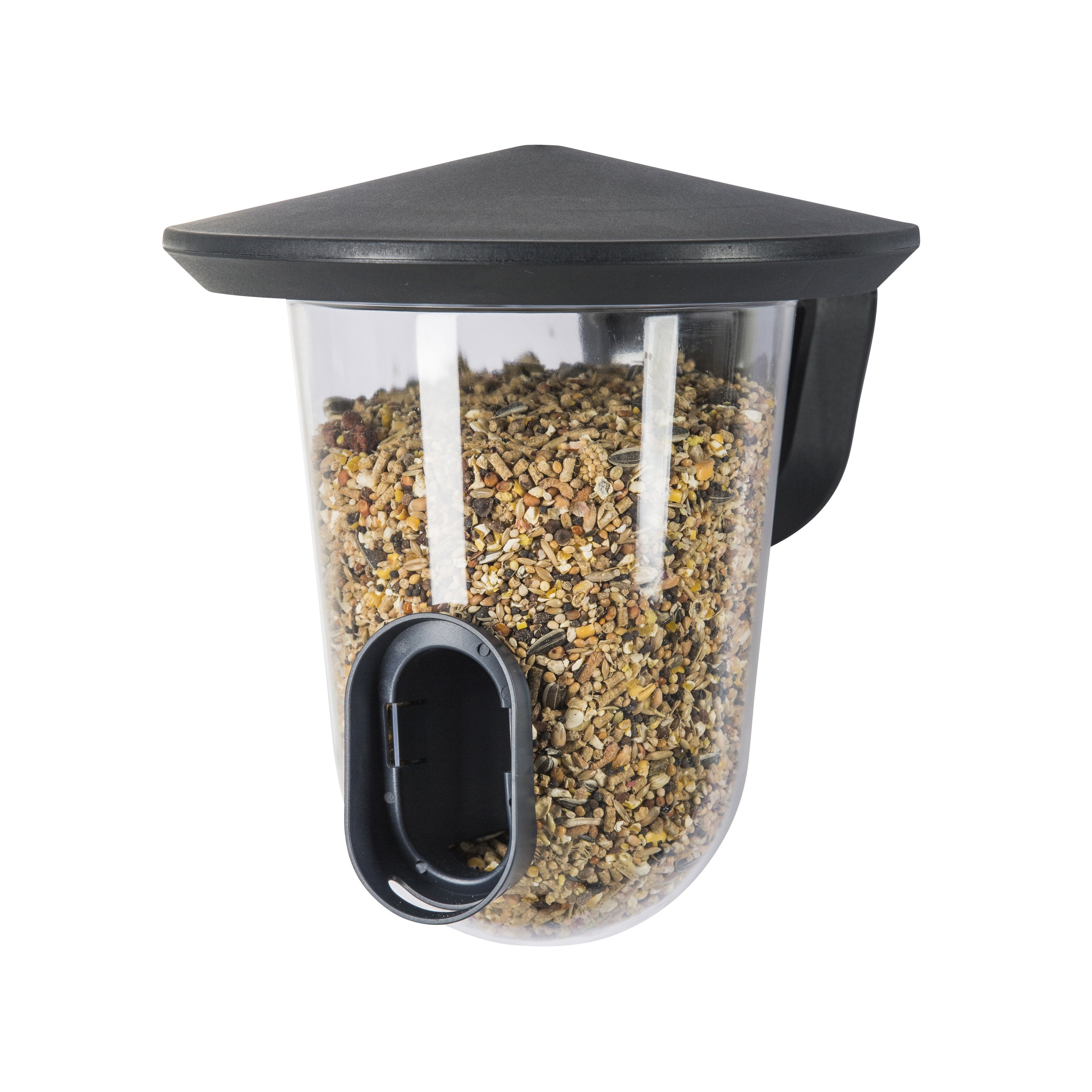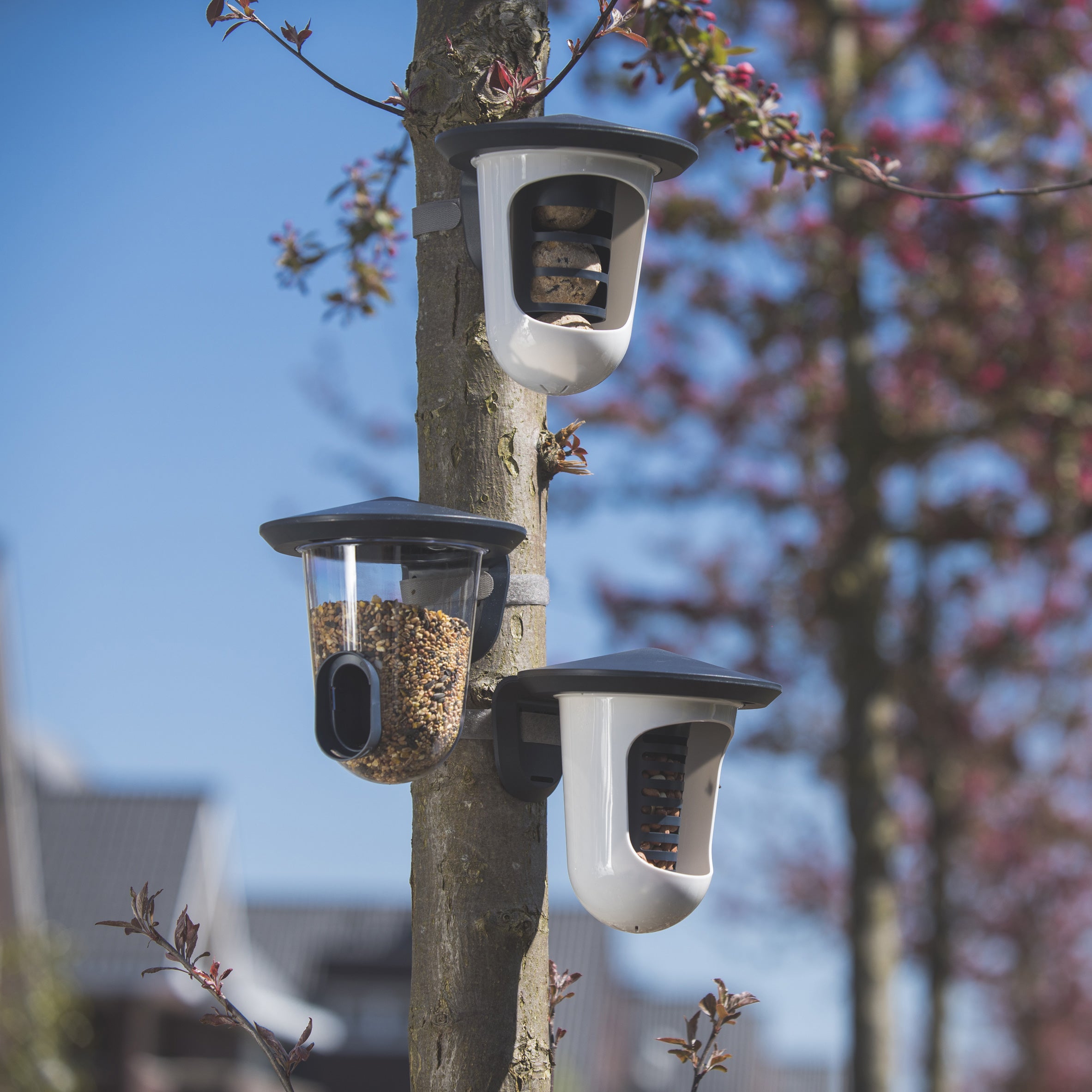 Eenvoudige bevestiging Je bevestigt de feedR eenvoudig aan je schutting, regenpijp of een boom. Hiervoor wordt klittenband meegeleverd, maar je kunt hem ook met schroeven (excl.). Is het voer op? Dan draai je de transparante bak van het dakje en vul je hem eenvoudig met nieuw voer. Daarnaast maak je hem zo heel makkelijk schoon! De feedR heeft een relatief kleine opening, waardoor er voornamelijk kleine vogeltjes zoals mussen, koolmezen of vinken op afkomen.