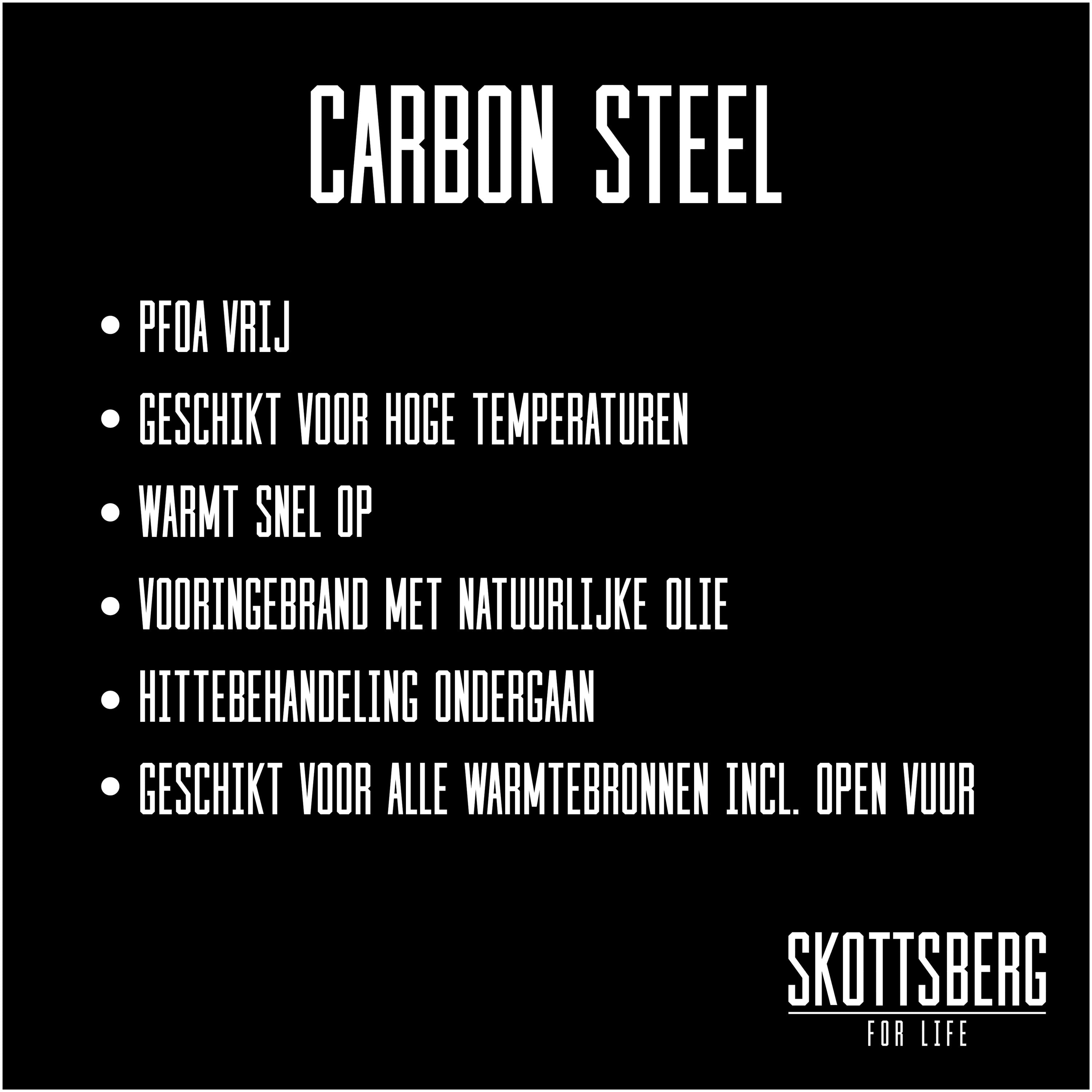 De Skottsberg Carbon Steel wokpan heeft de look van een antiaanbaklaag en wordt gewaardeerd om een aantal bijzondere eigenschappen. De wok is pre-seasoned, dat wil zeggen; de pan is 2 keer ingebrand met plantaardige olie en reageert als een antiaanbakpan. Daarnaast heeft de bodem van de wokpan de perfecte dikte (2,5 mm) om te voorkomen dat de bodem van de pan kromtrekt op inductie. De steel van deze wokpan is hol en neemt de hitte van de pan niet over.