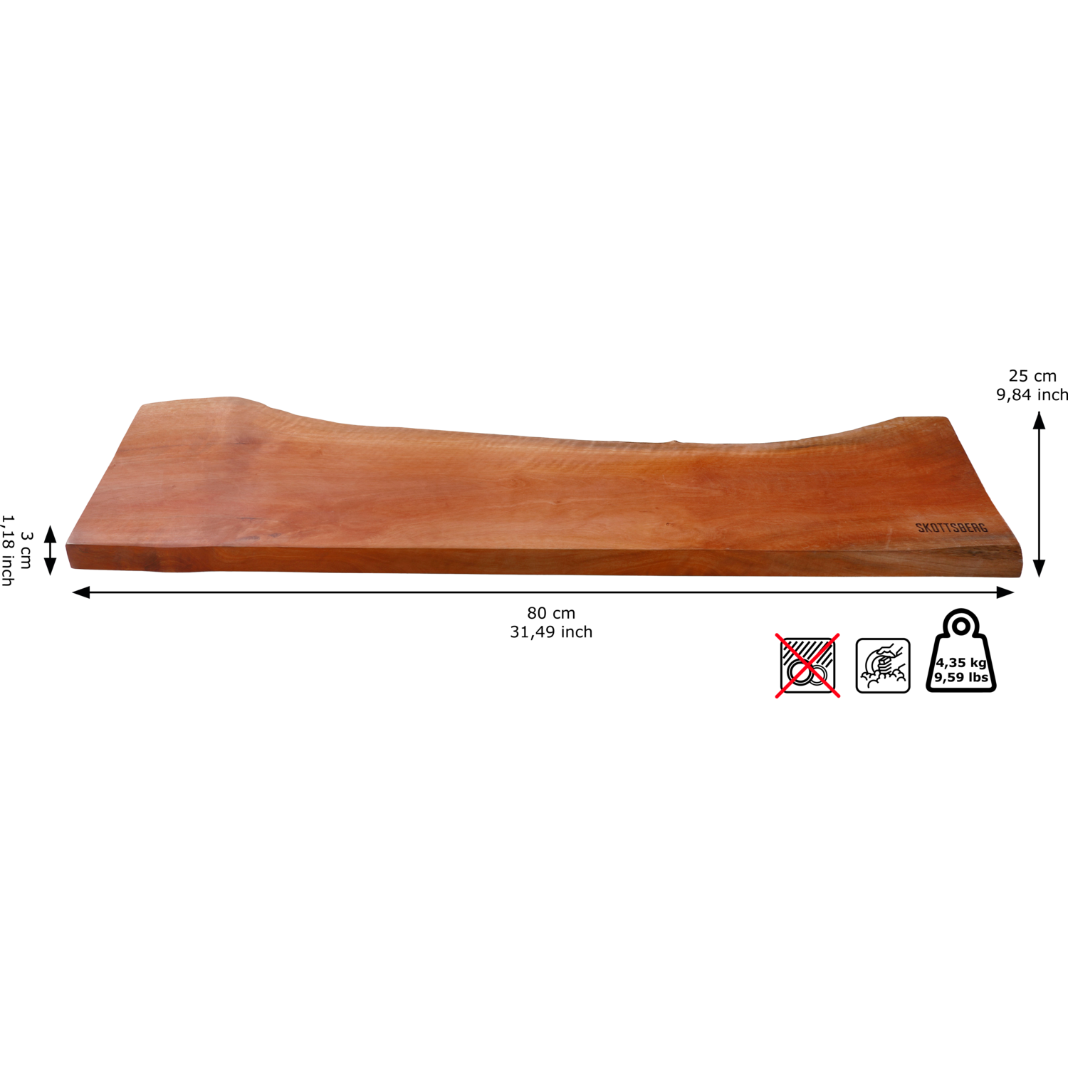 Belangrijkste kenmerken: · Product: 1 serveerplank · Afmeting: 80 x 25 x 3 cm · Kleur: Bruin · Materiaal: Longan Wood (fruitboom) · Vaatwasmachinebestendig: Nee Over Skottsberg® Bij Skottsberg geloven we dat een pan geen wegwerpartikel is, maar een vriend waarmee je nieuwe avonturen gaat beleven en waarmee je geniet van het leven. Wij willen dat jouw Skottsberg net zo bij je past als je favoriete afgetrapte sneakers. Een Skottsberg is persoonlijk, een pan waarvoor een pan bedoeld is: het bereiden van je favoriete gerechten. Of je hem nu op open vuur, in de oven of op een fornuis gebruikt. En of je nu een expert bent of voor het eerst gaat bakken en braden: er is een Skottsberg voor elke kok.