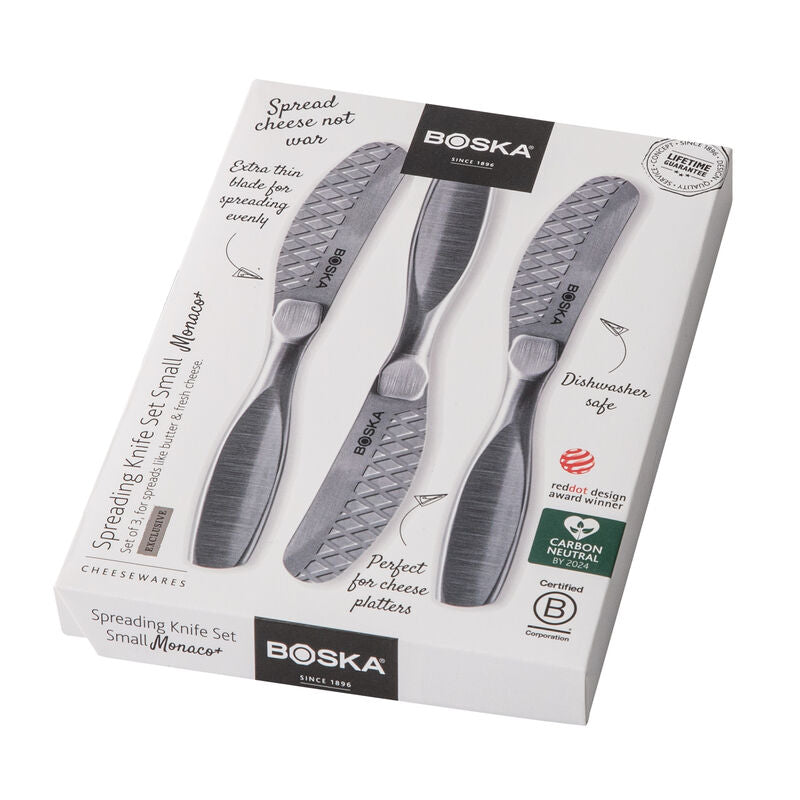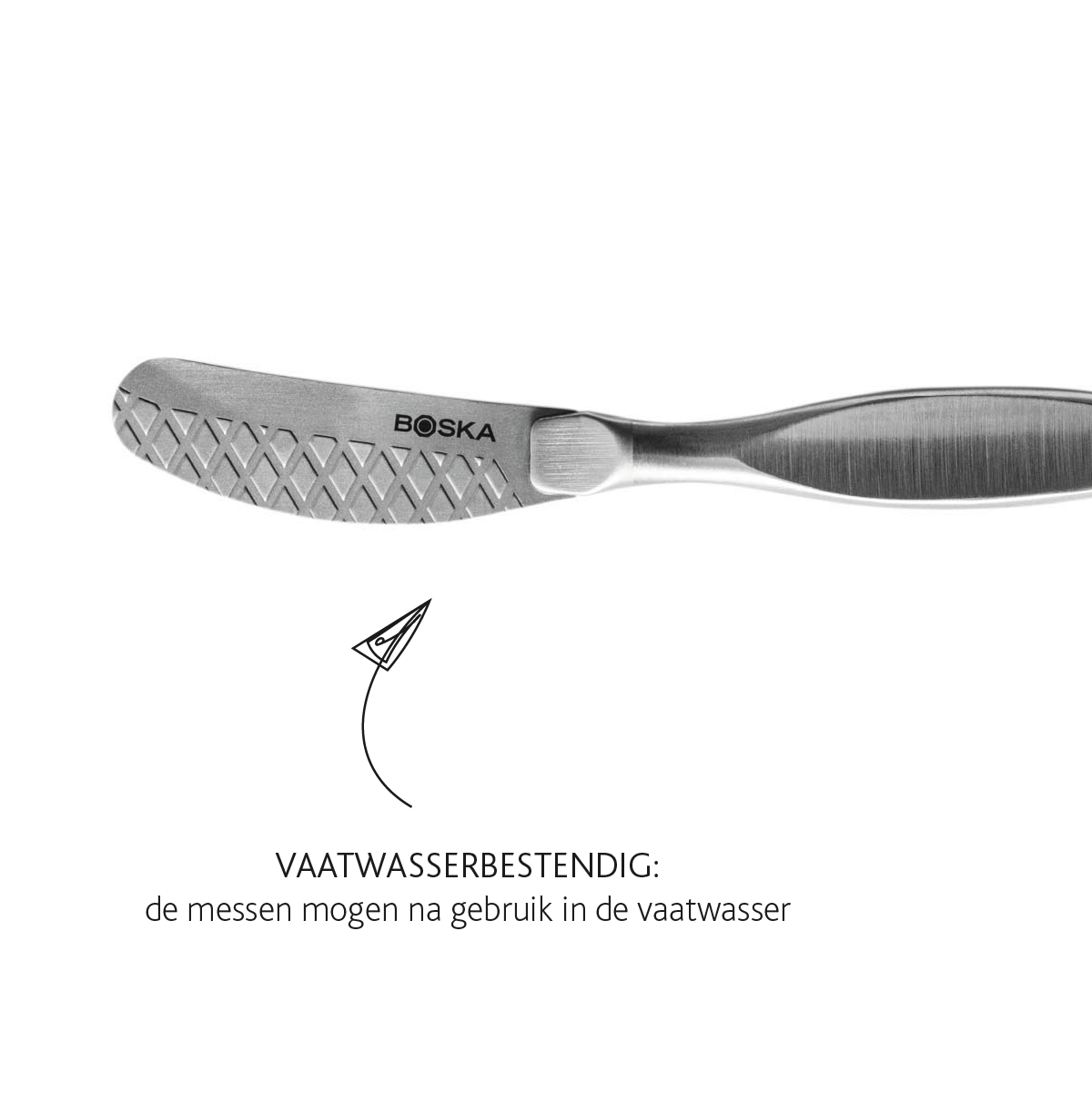 Smeer aïoli, verse kaas en andere spreads in stijl met de Smeermessenset Small Monaco+. Deze 3 compacte messen zijn van hoogwaardig roestvrijstaal gemaakt. Vaatwasserbestendig en zeer gebruiksvriendelijk door het diamantpatroon en extra dunne lemmet. Perfect voor elk borrelmoment. Messenset voor elk type spread Van eenvoudige kruidenboter tot luxe, smeerbare kazen; met deze smeermessenset smeer je alles in stijl. Het lemmet van deze compacte messen bevat een uniek diamantpatroon en is extra dun. Hierdoor gaat smeren zeer soepel en zijn de mesjes fijn in gebruik. Hoge kwaliteit en stijlvolle smeermessen De kaasmessen uit deze set zijn gemaakt van een hoge kwaliteit roestvrijstaal. Het handvat ligt prettig in de hand, wat het smeren extra fijn maakt. Naast de hoge kwaliteit materialen bevatten deze messen ook een stijlvol en compact design. Een perfecte manier om je borrelplank helemaal af te maken. Vaatwasserbestendige messen Na gebruik zijn de 3 mesjes zo weer schoon. Doordat ze volledig van roestvrijstaal gemaakt zijn, mogen de smeermessen in de vaatwasser. Zo zijn ze weer helemaal klaar voor een volgend gebruik. Met welke heerlijke spreads ga jij je familie en vrienden verrassen?
