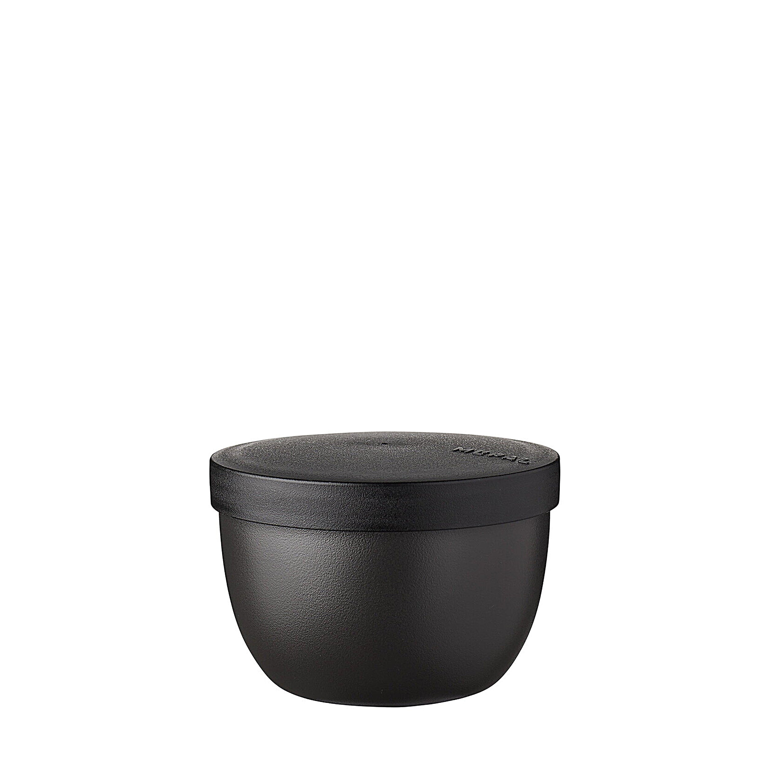 Mepal Snackpot Ellipse 350 ml in Nordic black. Speciaal ontworpen voor iedereen die eigenlijk altijd wel trek heeft; een handig lekvrij potje dat zo je tas in gaat. Vul je snackpot met snoeptomaatjes, lekkere nootjes of reepjes paprika en je hebt altijd een kleine energieboost bij de hand. Natuurlijk ook ideaal te gebruiken voor een kleine leftover van gisteren. De snackpot mag, zonder deksel, in de magnetron en mag na gebruik gewoon in de vaatwasser. Extra fijn: de deksels van de verschillende fruit- & veggie, snack- en lunchpotten zijn onderling uitwisselbaar. Nooit meer zoeken naar het juiste dekseltje dus!