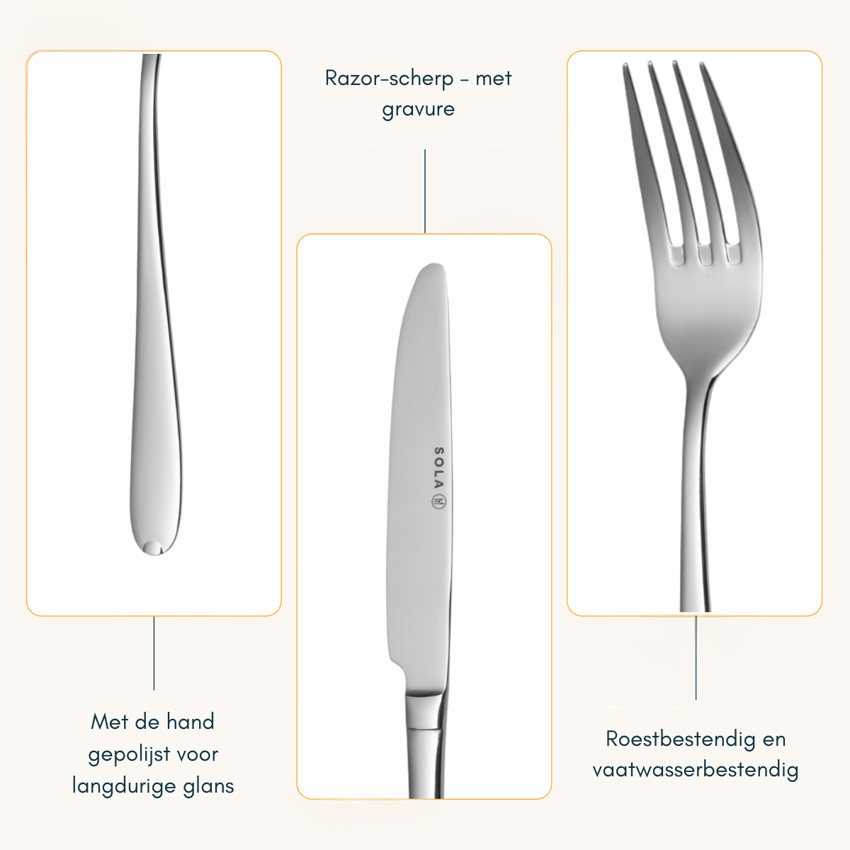 Sola bestek fleurie is gemaakt van zilverwit 18/10 edelstaal. Zilverwit edelstaal 18/10 is een staallegering van 18 delen chroomstaal en 10 delen nikkel. Door deze samenstelling is het bestek roestvrij en vaatwasser geschikt.