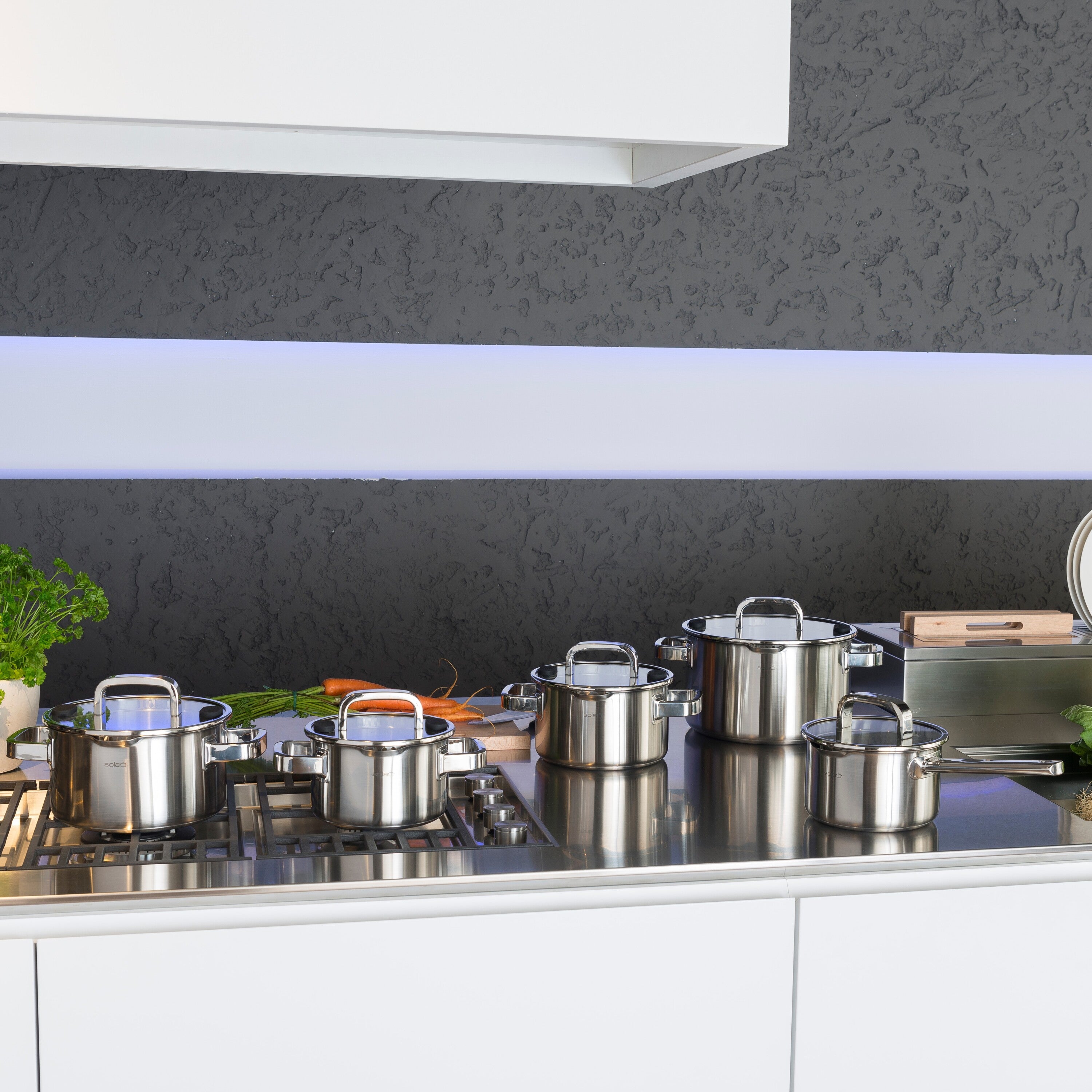 - Pannen met luxe, licht matte finish en gemaakt van zilverwit edelstaal 10/18