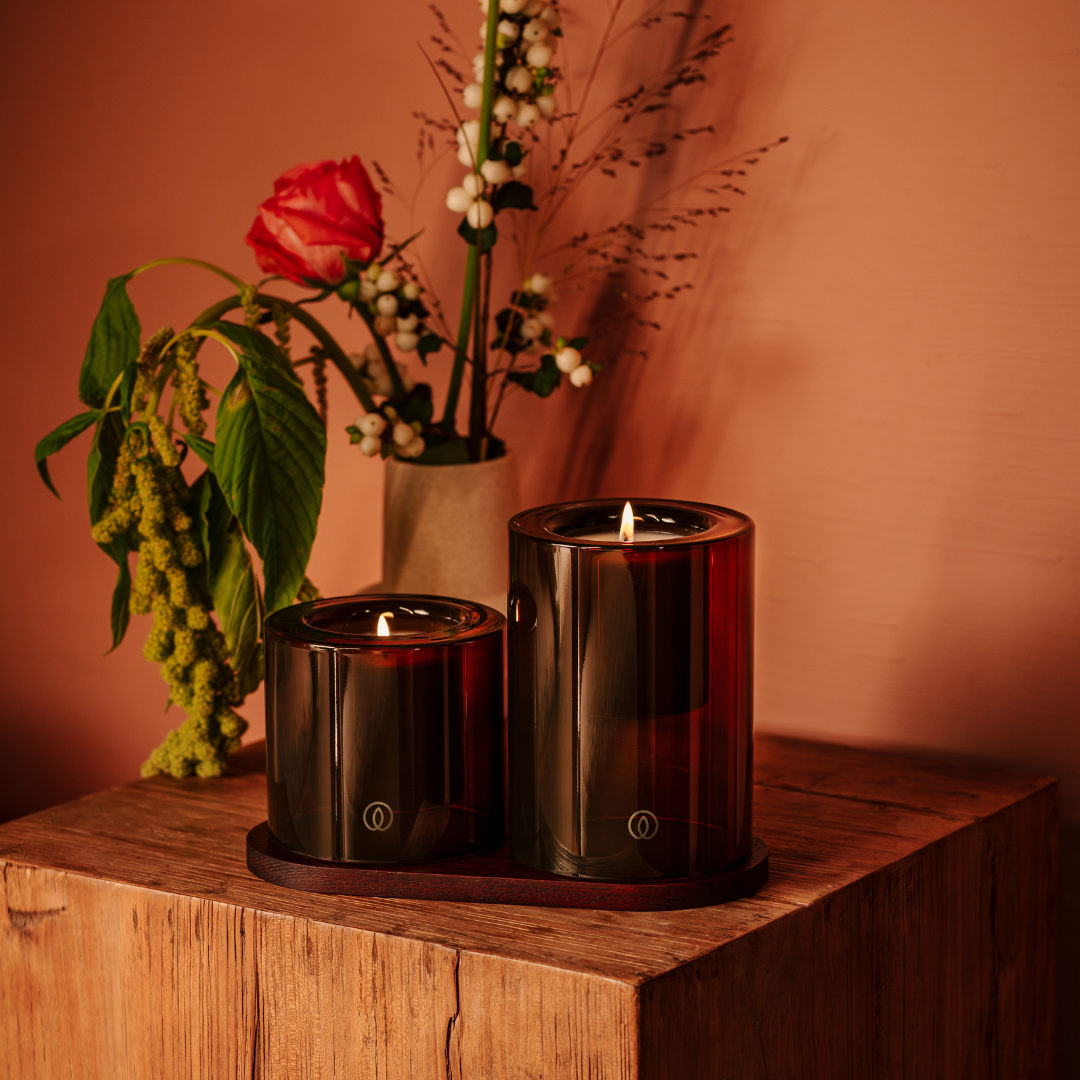 - 2 Delight geurkaarsen, small en large met houten decoratieschaal. Het dubbelwandige, rookbruine glas zorgt voor een warme gloed in elk interieur.