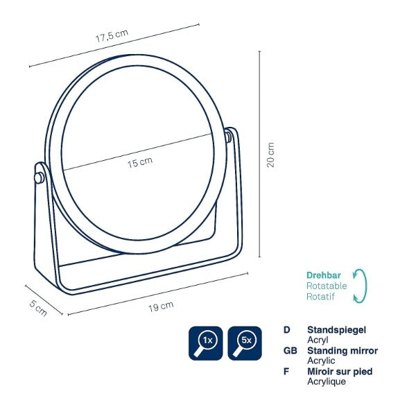 Spiegel, Staand, ø 15 cm, Draaibaar, 5x Vergrotend, Acryl – Kela | Via