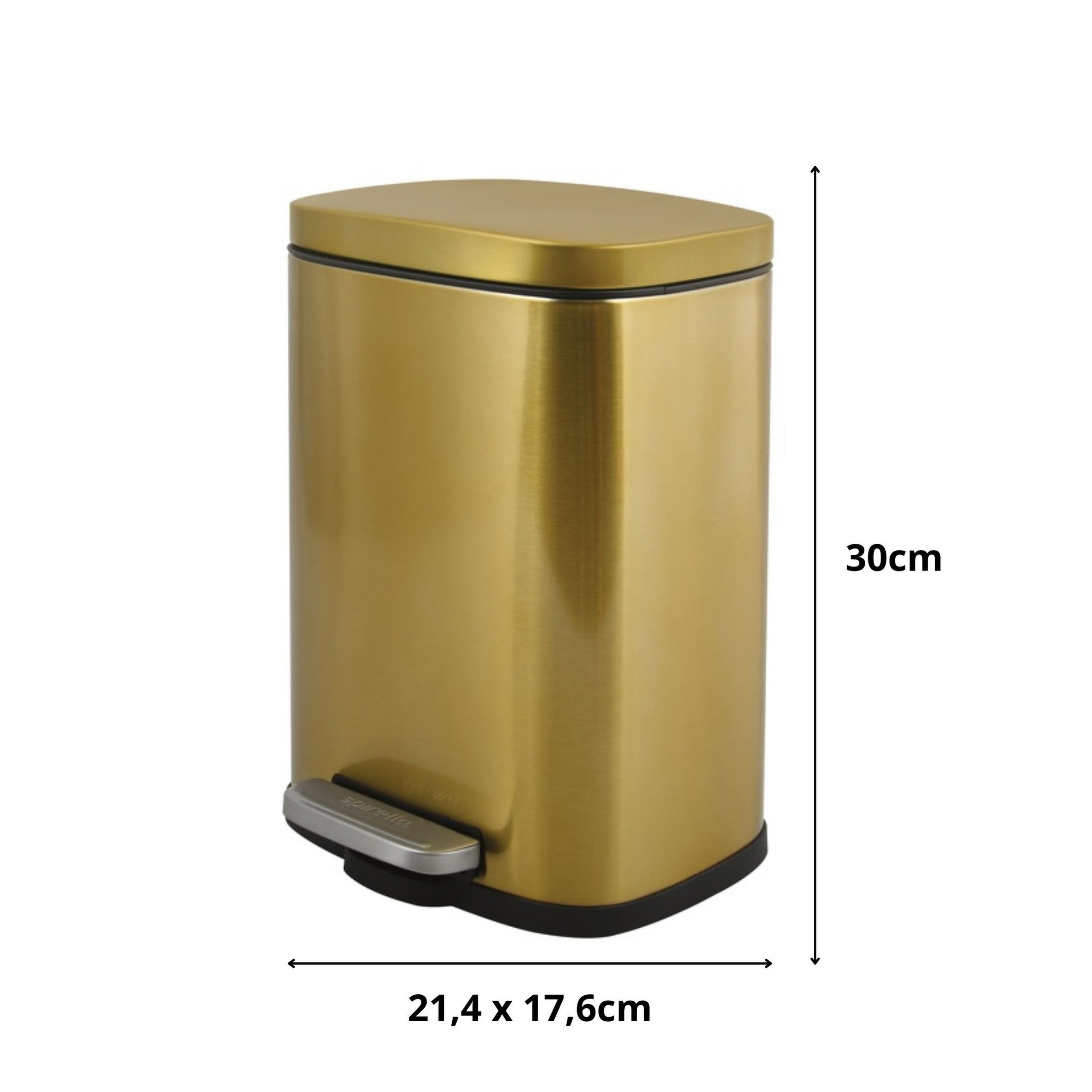 Pedaalemmer/prullenbak model Venice voor in de badkamer en/of toilet, klein model met inhoud 5 liter. Kleur: goud. Deze prullenbak is gemaakt van metaal en de deksel heeft een soft-close sluit systeem. Afmetingen zijn ongeveer L21 x H30 cm. Deze kleine pedaalemmers hebben een handige uitneembare binnenbak gemaakt van gerecycled plastic. Zeer goede kwaliteit materialen zijn gebruikt om deze kleine pedaalemmer een luxe uitstraling te geven.
