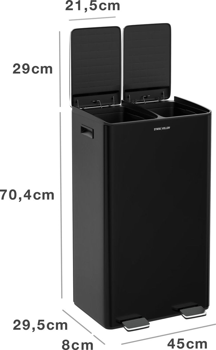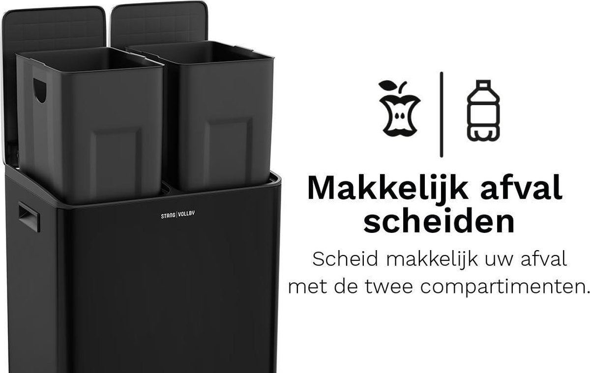 Afval scheiden in stijl is zeer eenvoudig met deze StangVollby design prullenbak! Deze pedaalemmer is voorzien van 2 vakken met een inhoud van 30 liter. Deze afvalemmer is perfect voor in de keuken van grotere huishoudens. De