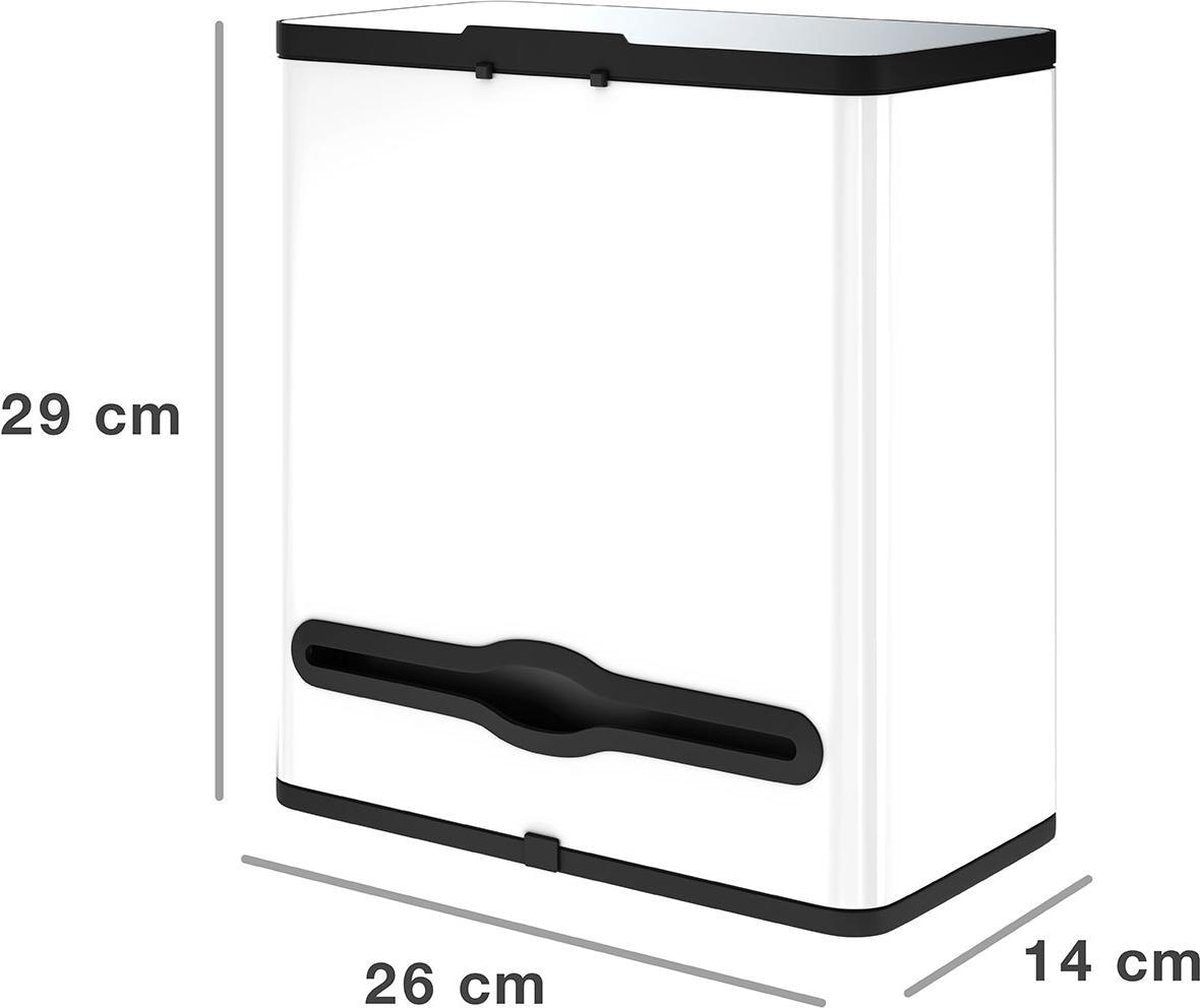Geschikt voor kleine ruimtes Tijdloos design Vervaardigd uit hoogwaardig RVS materiaal 4 liter binnenemmer gemaakt uit vormvast sterk PP-kunststof Compartiment voor een keukenrol Zachte binnenring Geurloos Gemakkelijk te reinigen 2 ophangmethodes inbegrepen Afmetingen: 26cm × 14cm × 29cm (B×D×H)