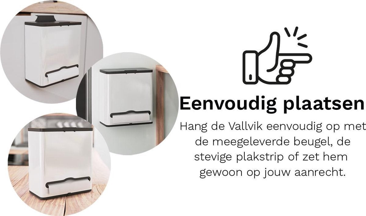 - MAKKELIJK OP TE HANGEN – Er worden 2 ophangmethodes meegeleverd waarmee je de Vallvik op diverse manieren kunt ophangen. Door middel van de beugel hang je hem gemakkelijk op aan een aanrechtkastje! Tevens wordt er een stevige plakstrip meegeleverd om het afvalbakje gemakkelijk aan de muur te bevestigen. Door zijn tijdloze design is hij ook gewoon op uw aanrecht of bureau te plaatsen.