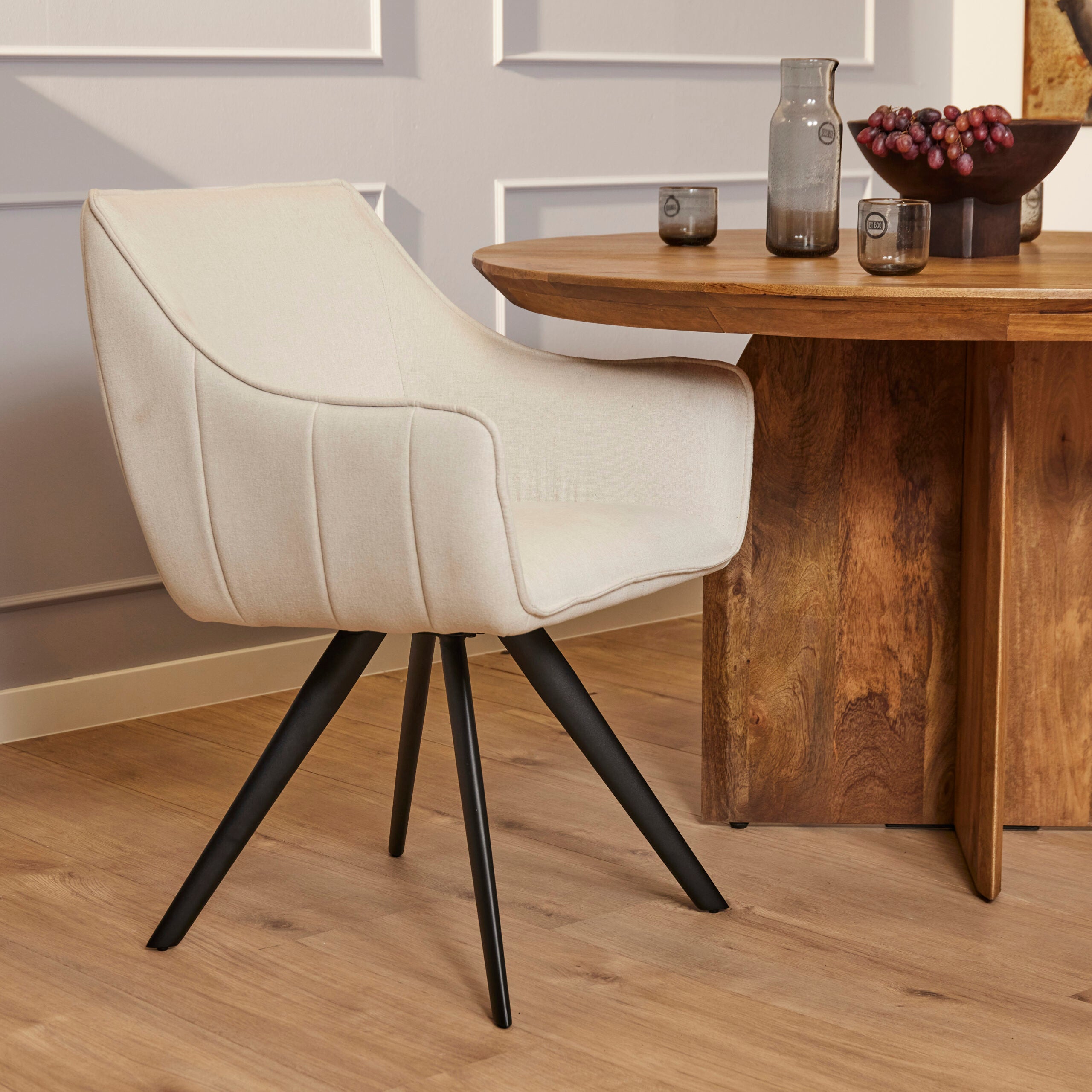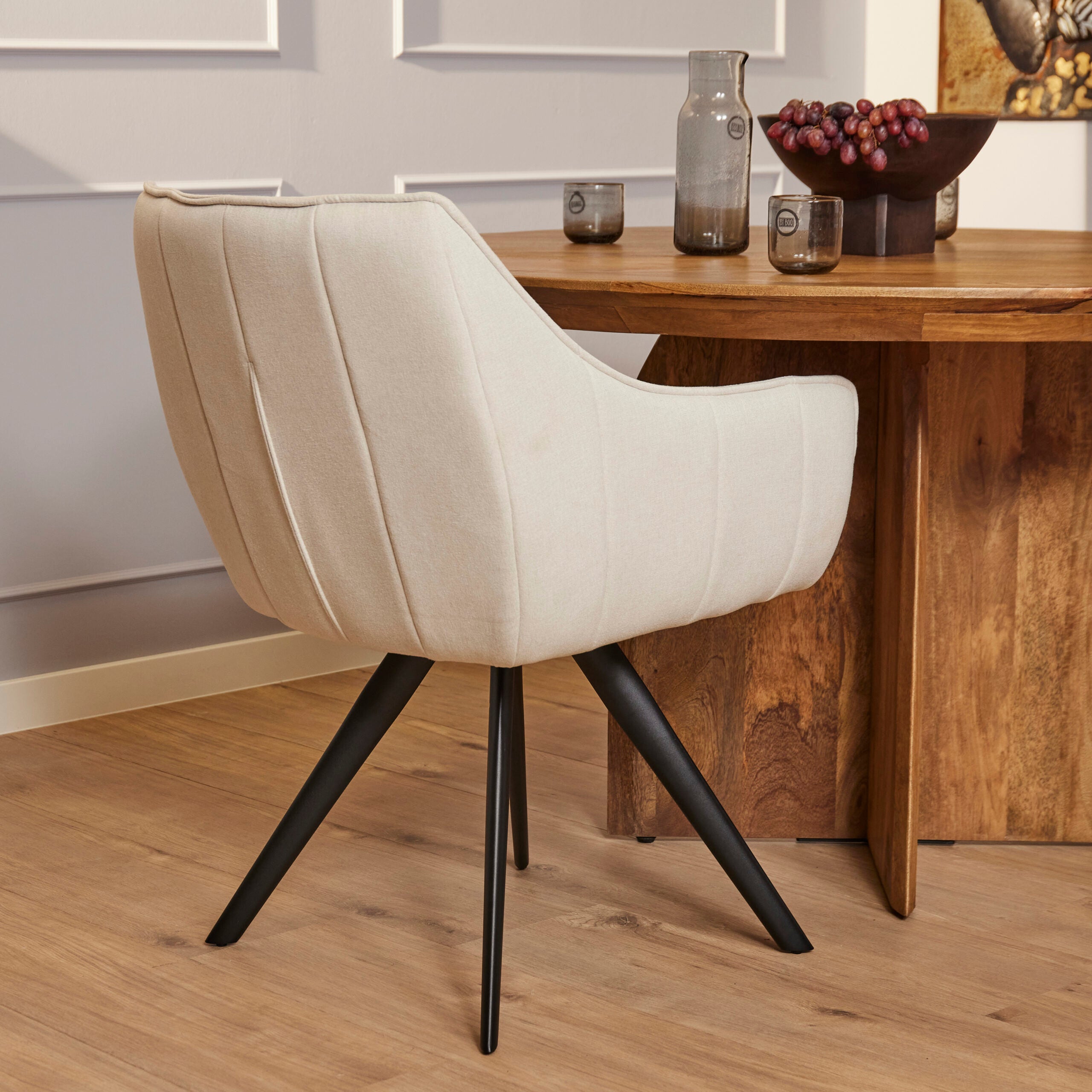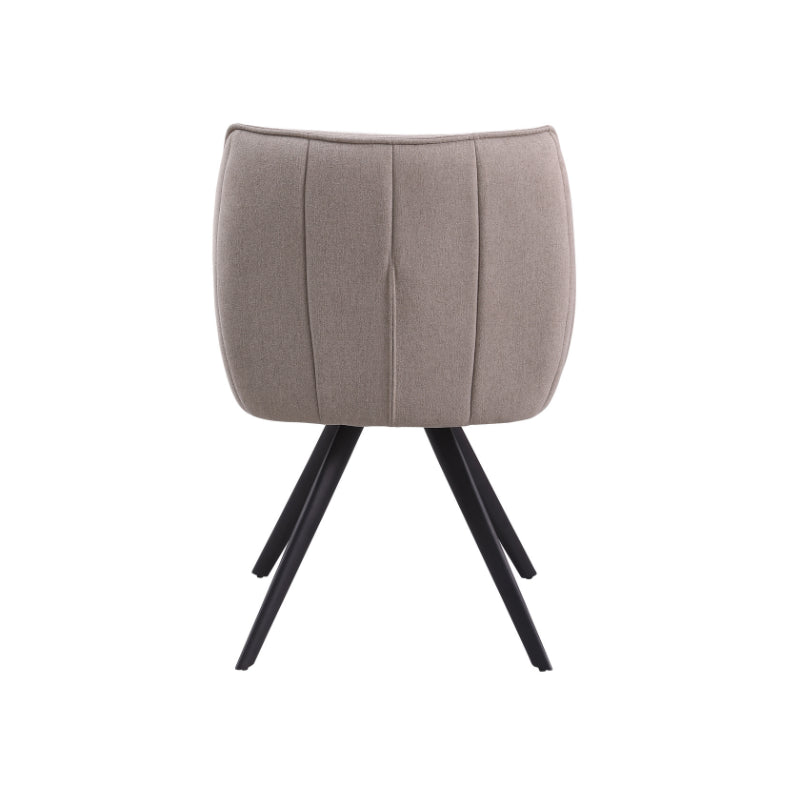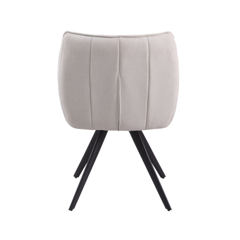 Eetkamerstoel Luca Sand is bekleed met de Nea-stof een geweven stof. De stoel is 180 graden draaibaar en heeft een return memory functie. De stoel is voorzien van een metalen zwarte poot.