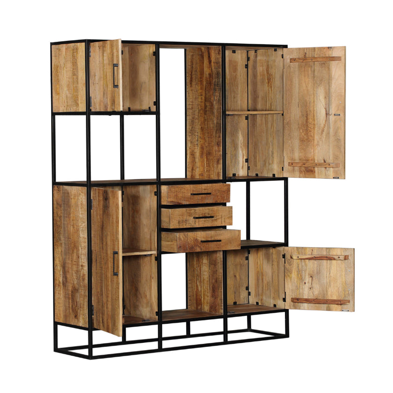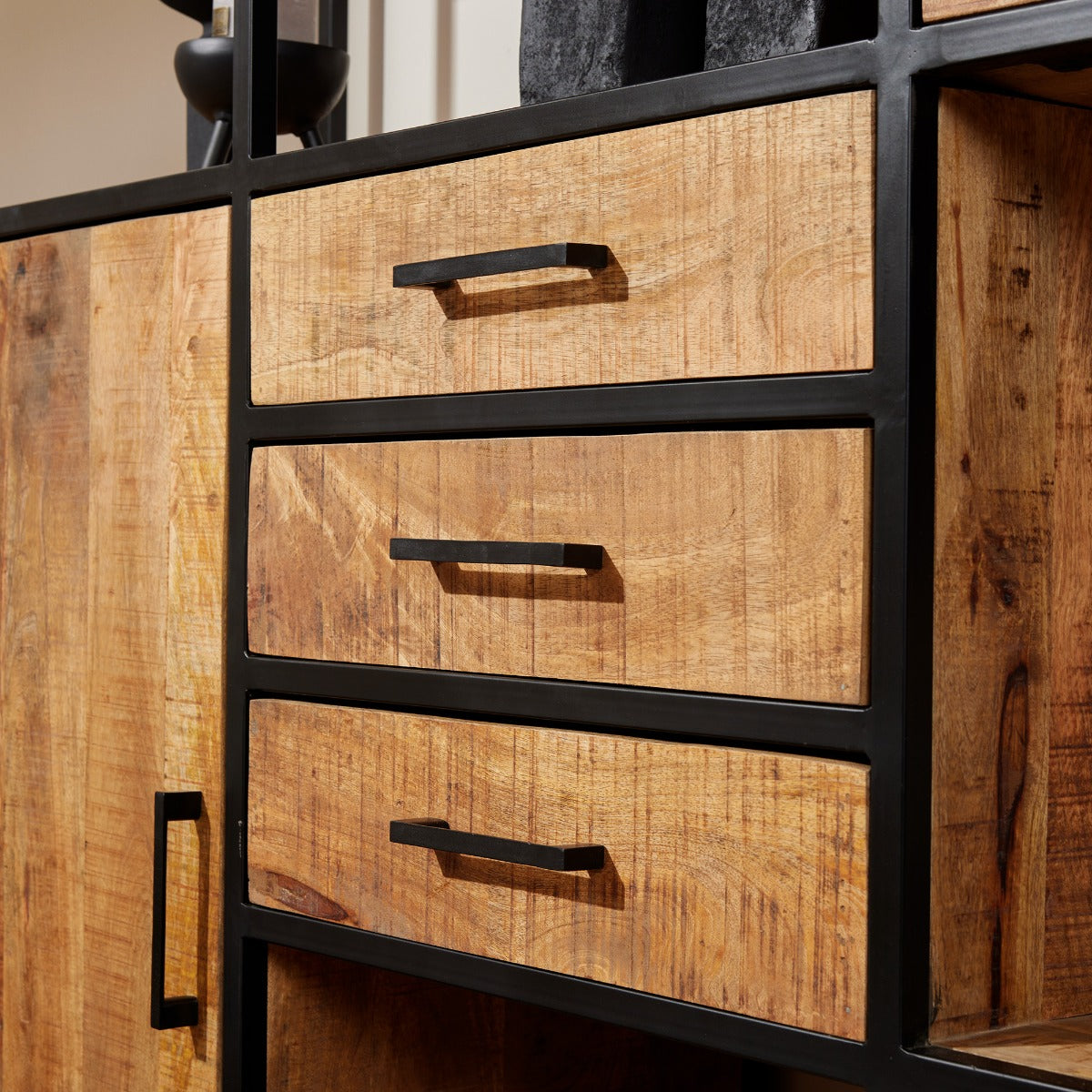 - De combinatie van het zwarte metaal en het bruine hout geeft de kast een industriële look