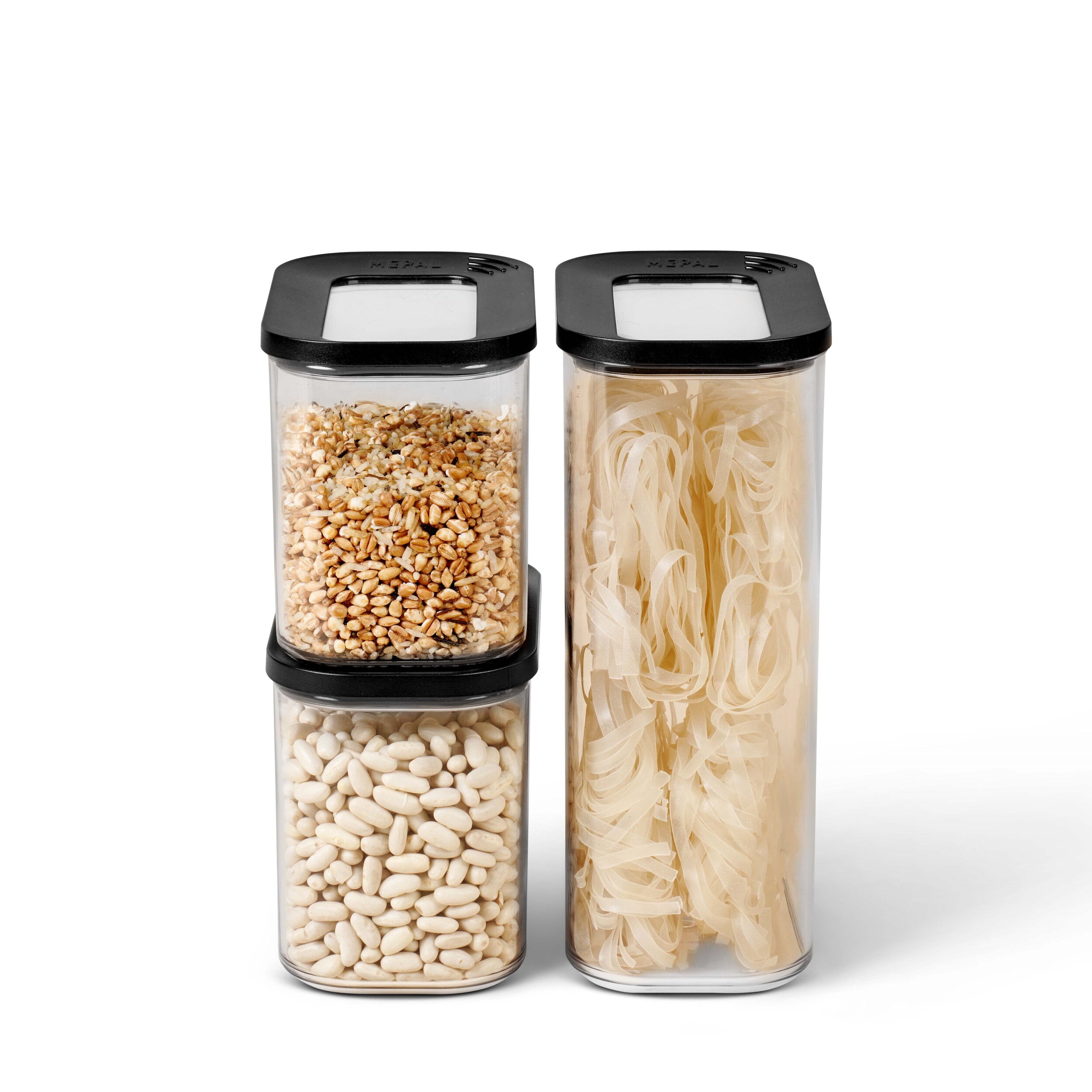 3-delige starterset met Modula bewaardozen. Deze handige Modula set bestaat uit: 1 x 2000 ml en 2 x 1000 ml. De zwarte afdichtring zorgt voor een perfecte afsluiting, waardoor de dozen geschikt zijn voor het bewaren van droge etenswaren zoals koffie, meel, chips, kruiden en pasta. De Modula bewaar- en opbergdozen van Mepal liggen goed in de hand en zijn makkelijk te openen. Bovendien zijn ze stapelbaar en vaatwasmachinebestendig. Hoe veeleisend je ook bent: Modula bewaardozen zijn erop berekend!