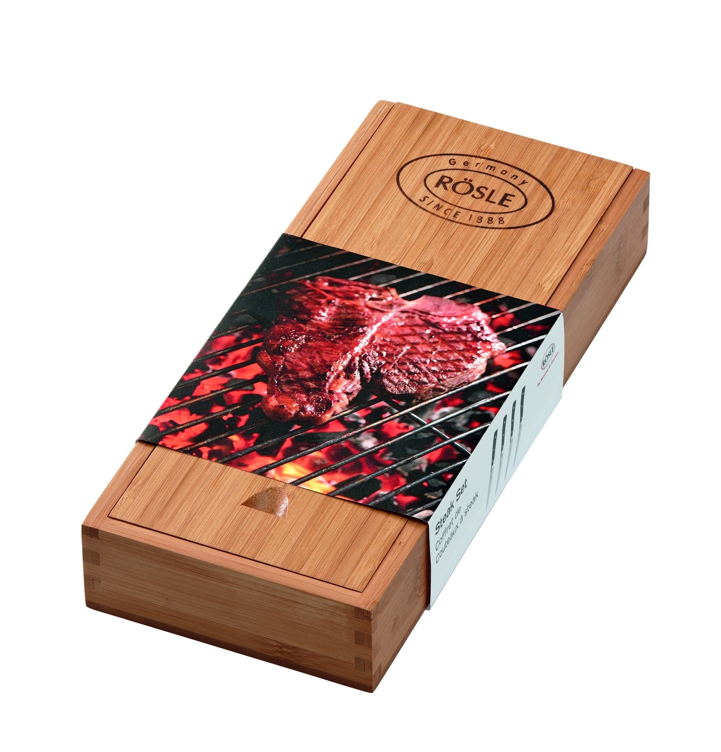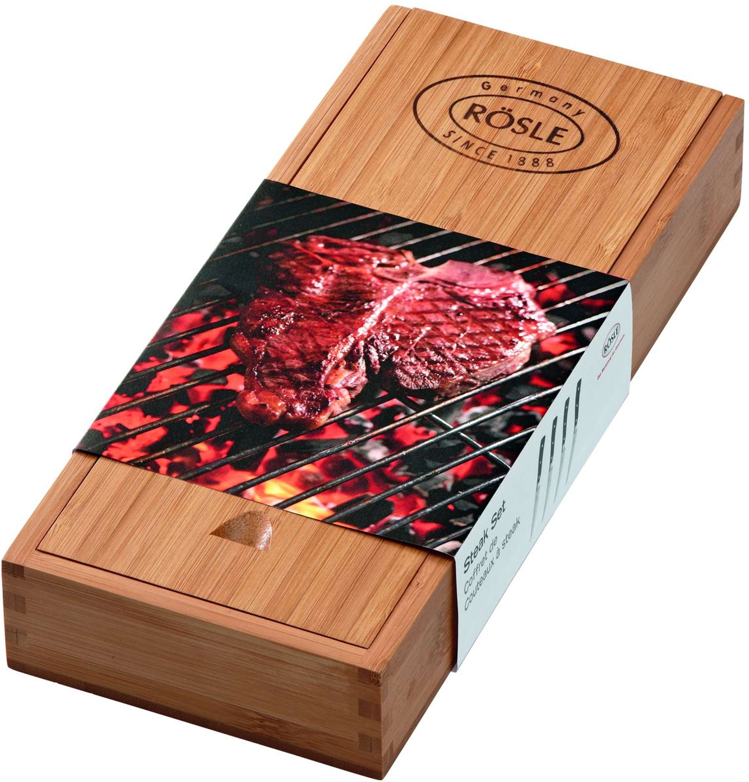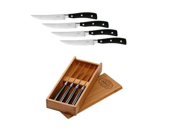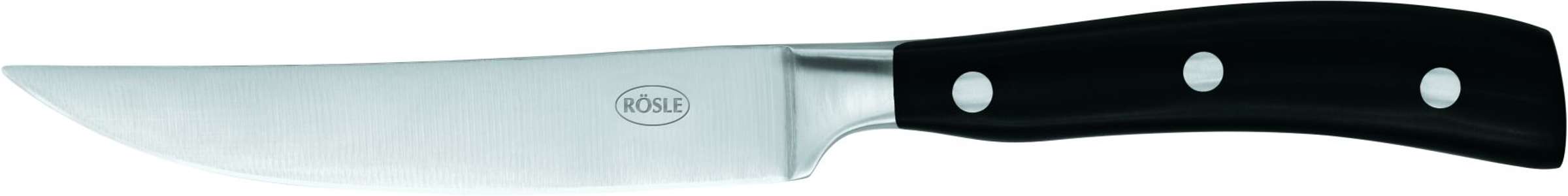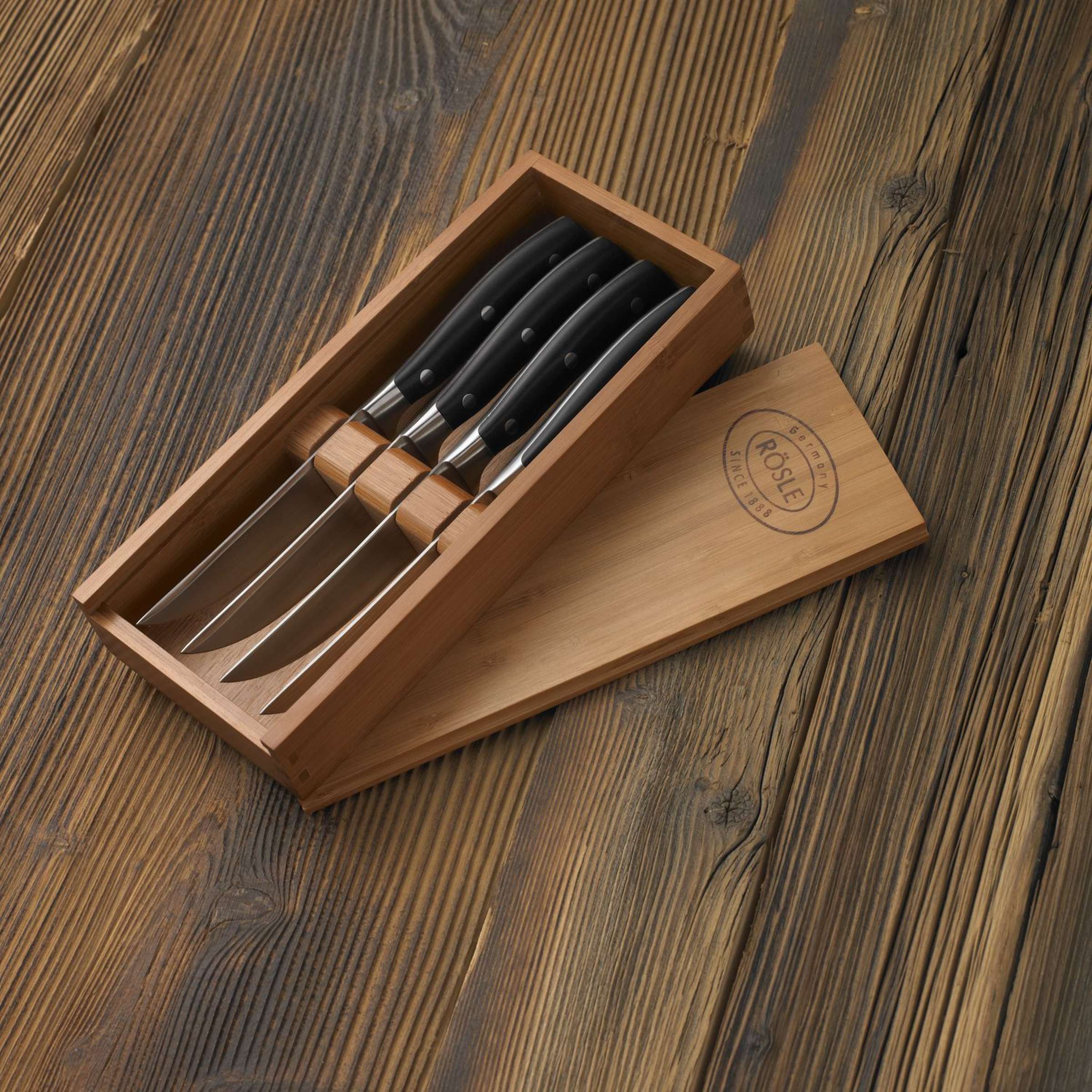 Steak Messenset van het merk Rösle. Deze set bestaat uit 4 steakmessen, geleverd in een houten opbergbox. De messen zijn gemaakt van staal en het heft is gemaakt van zwart kunststof met 3 studs.