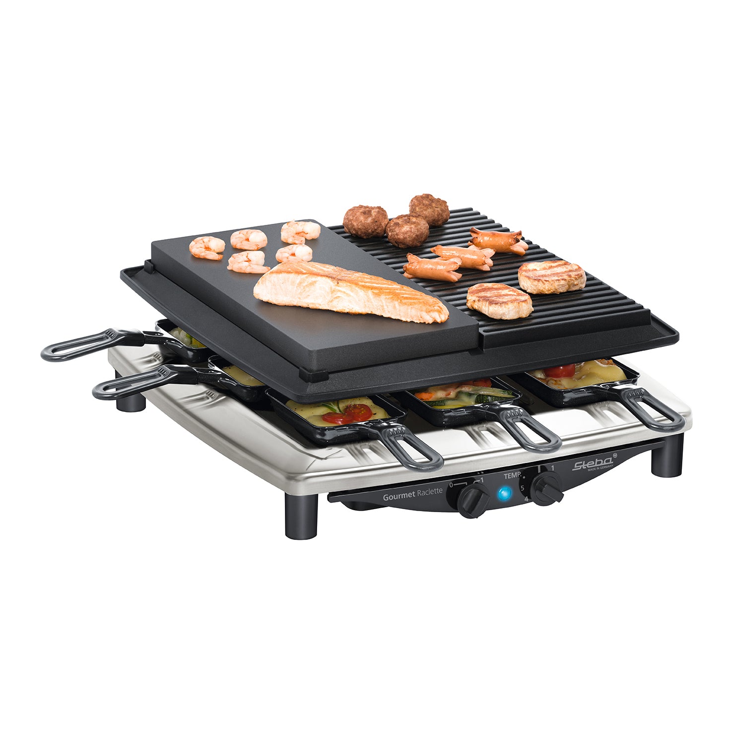 Steba RC4 Steengrill & Gourmet Met dit hoogwaardige gourmetstel ben je van alle markten thuis. Niet alleen gewoon gourmetten, maar ook grillen en steengrillen doe je gezellig met de hele familie op dit gourmetstel. De temperatuur van het stel is traploos in te stellen zodat je altijd de goede temperatuur te pakken hebt. Dit stel je apart in voor de gourmetpannetjes en voor de grillplaten, heel handig! De acht pannetjes zijn krasbestendig en mogen in de vaatwasser. Ook de steengrill is krasbestendig. De grillplaat van gegoten aluminium heb je in een mum van tijd weer schoon door de anti-aanbaklaag. Overtollig vet wordt opgevangen in de opvangbak. Ook nog handig: het snoer rol je op in de bodem van het gourmetstel.