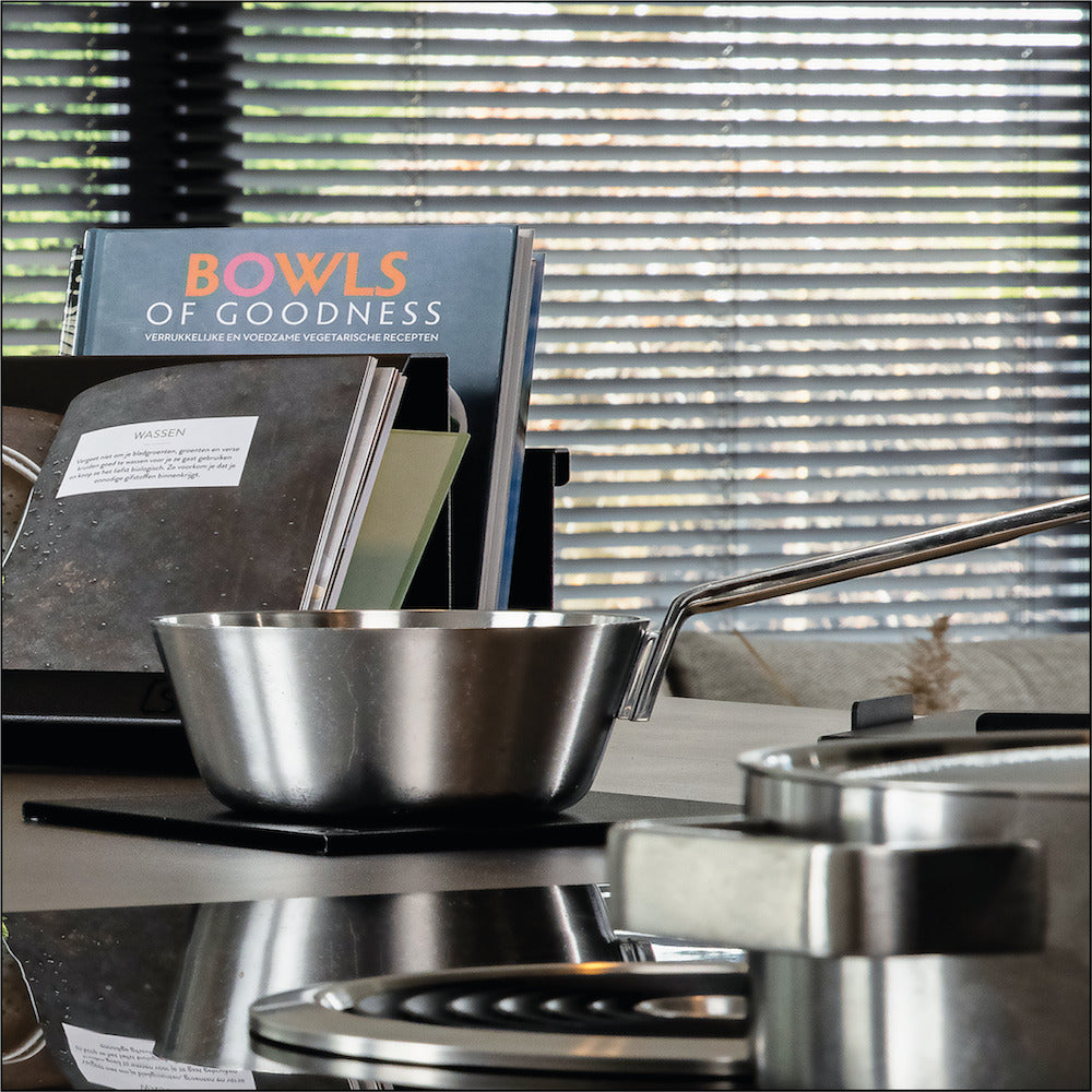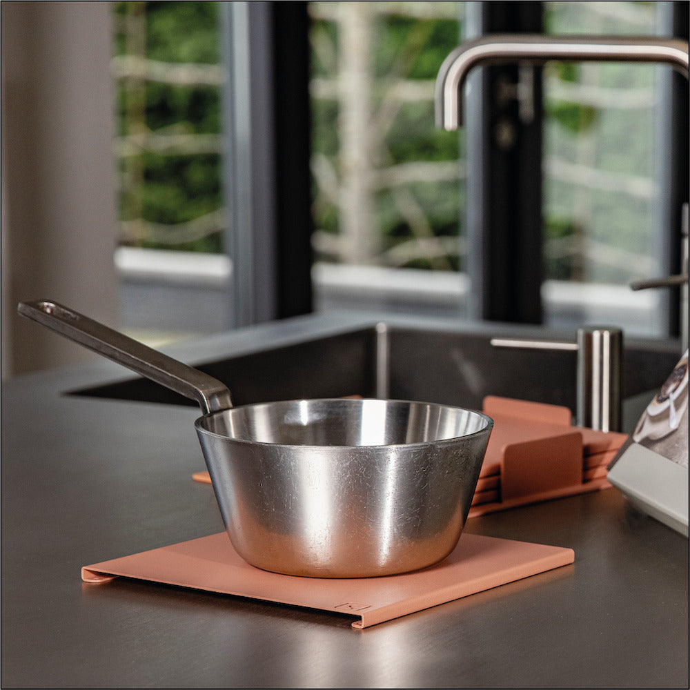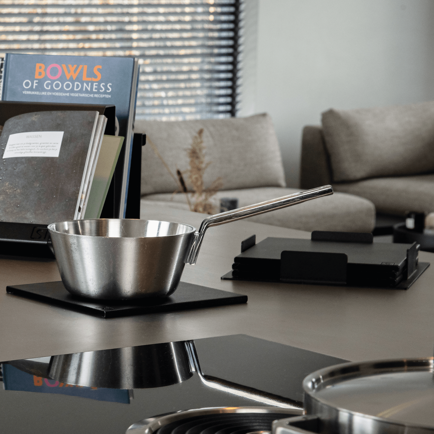 De set bestaat uit vier eenvoudig te reinigen onderzetters van hittebestendig staal met anti-kras noppen. Ze worden geleverd met een handige houder om ze stijlvol op te bergen.De Oni Onderzetter voor pannen is gemaakt uit één plaat van hoogwaardig staal met een poedercoating. Dit maakt de onderzetters en de houder duurzaam en makkelijk schoon te maken. De onderzetters zijn 20 × 20 × 1 cm. De totale set is 22 x 22 x 7 cm.Net als de beroemde artiesten hebben we ons eigen palet van kenmerkende kleuren samengesteld. De kleuren zijn zorgvuldig uitgekozen en zijn perfect te combineren. Ons unieke palet bestaat uit de volgende kleuren: • RAL 9005 - Gitzwart • RAL 1013 - Parelwit • RAL 8028 - Terrabruin • RAL 7030 – Steengrijs • RAL 3012 – Beige Rood Liever een andere kleur? Neem dan contact met ons op voor een van de vele mogelijkheden. Wij ontwerpen en produceren al onze producten met de grootste zorg zodat je zo lang mogelijk van onze producten kan genieten. Daarom geven wij op al onze producten drie jaar garantie.