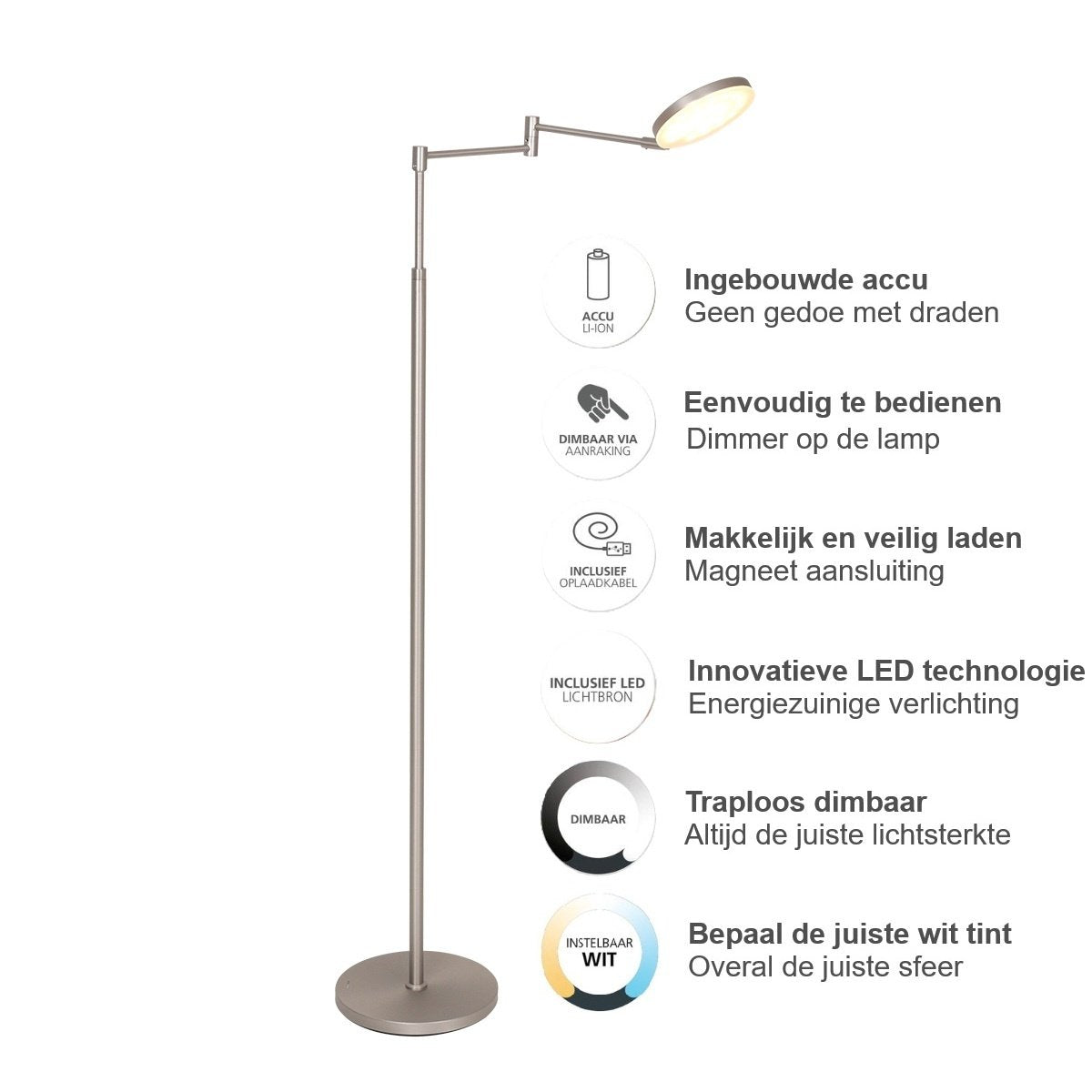 De oplaadbare, dimbare en lichtkleur instelbare vloerlamp met een zijarm, is een perfecte aanvulling op elk eigentijds interieur.