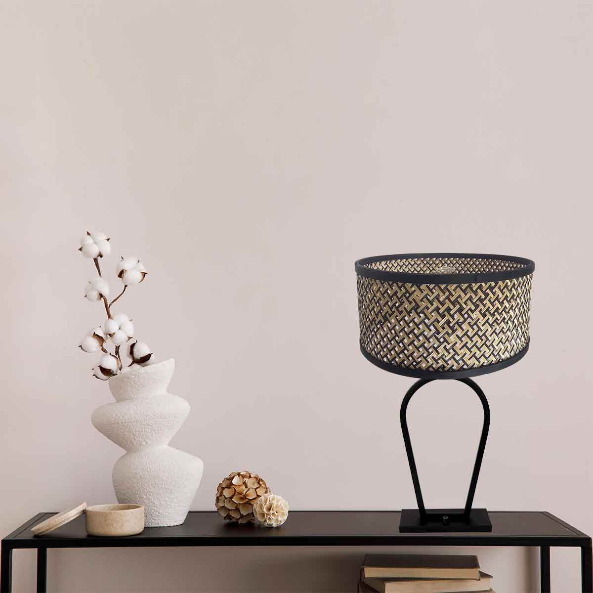 Materiaal: De tafellamp is vervaardigd uit een combinatie van bamboe en metaal. Bamboe staat bekend om zijn milieuvriendelijkheid en duurzaamheid, terwijl metaal zorgt voor een stevige en stabiele constructie. Deze materialen zorgen samen voor een lamp die zowel functioneel als esthetisch aantrekkelijk is.