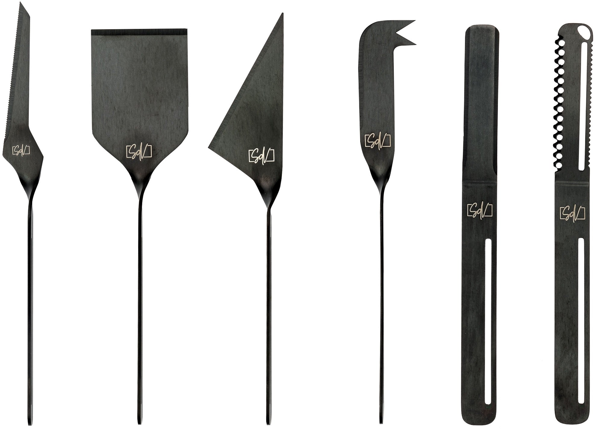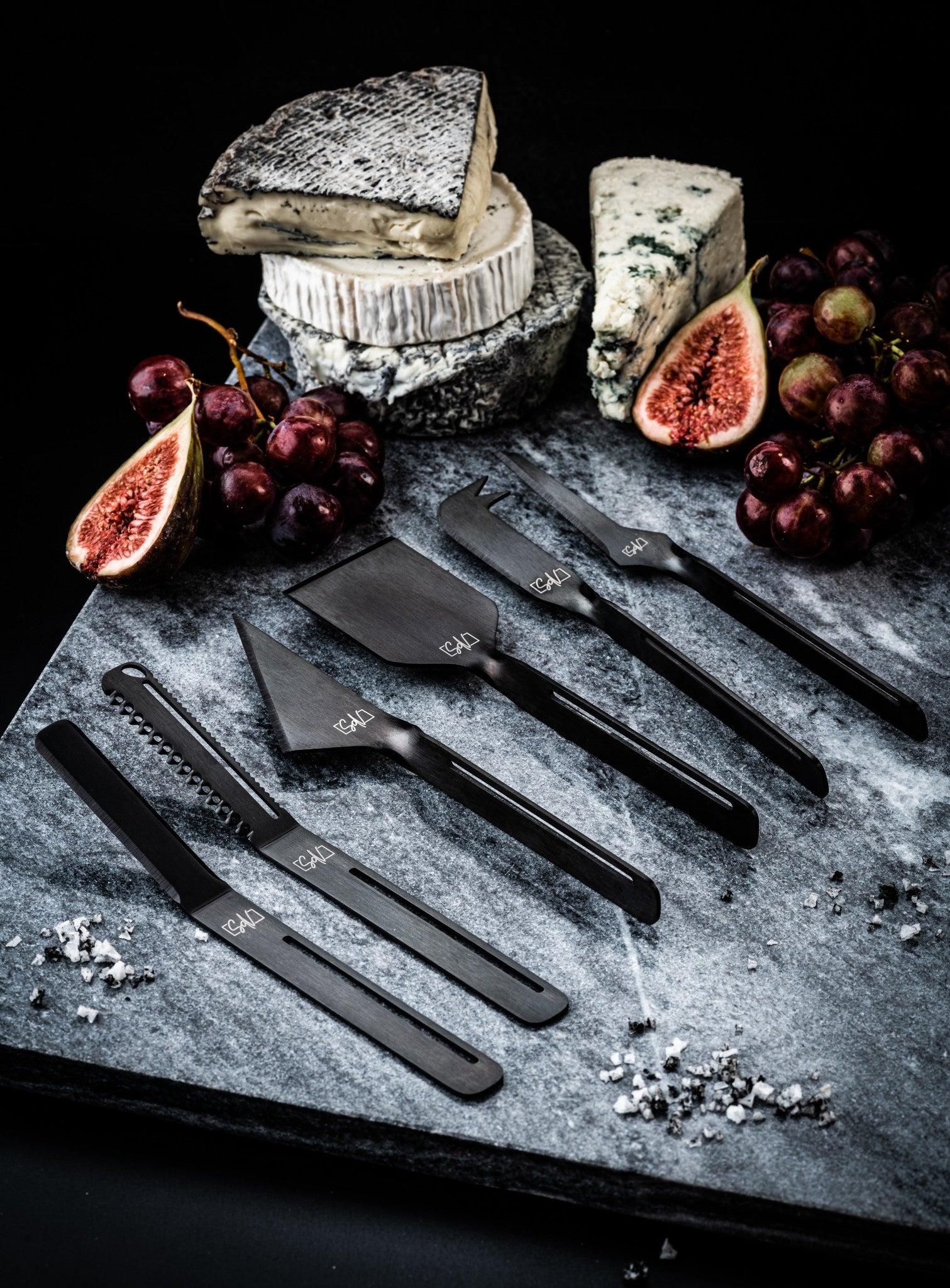 Style de Vie 6-delige kaasmessenset, zwart met stonewash afwerking. Bestaat uit 4 kaasmesjes en 2 botermesjes.