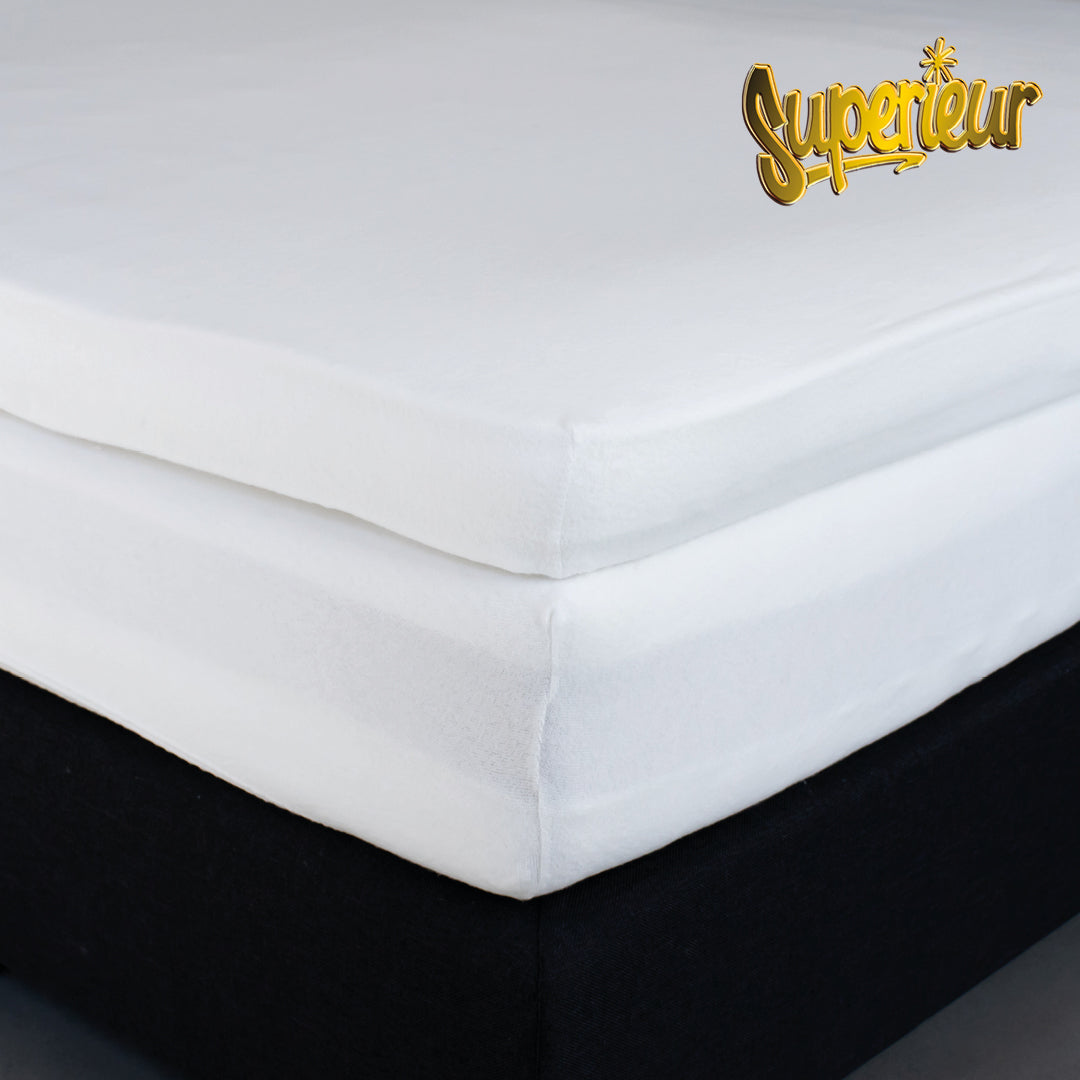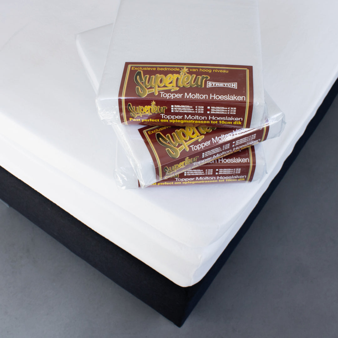 Hét subleieme Superieur© Toppermolton topmatras hoeslaken; de ideale bescherming van uw waardevolle topmatras. Gebruik deze heerlijke topper molton oplegmatrasbeschermer voor onder uw topmatras hoelaken, voor optimale bescherming en 'n voortreffelijk comfort. Deze Topper-Molton houdt uw topper fris, proper en hygiënisch en topconditie. Zware kwaliteit met ronduit perfecte pasvorm, ook voor toppers tot 10cm dik. Dit molton topperhoeslaken is vervaardigd van extra dik en geruwd katoen, zodat de molton optimaal vocht absorbeert. Voorzien van elastiek rondom, voor eenvoudig en strak opmaakgemak. Vervaardigd van contactdraden van 100% puur katoen, gebleekt (dus niet geverfd, want geverfd katoen neemt minder transpiratievocht op), zorgvuldig geblend met High-tec elastische Elastofan© inslagdraden. Ze houdt uw matras gegarandeerd in perfecte conditie.