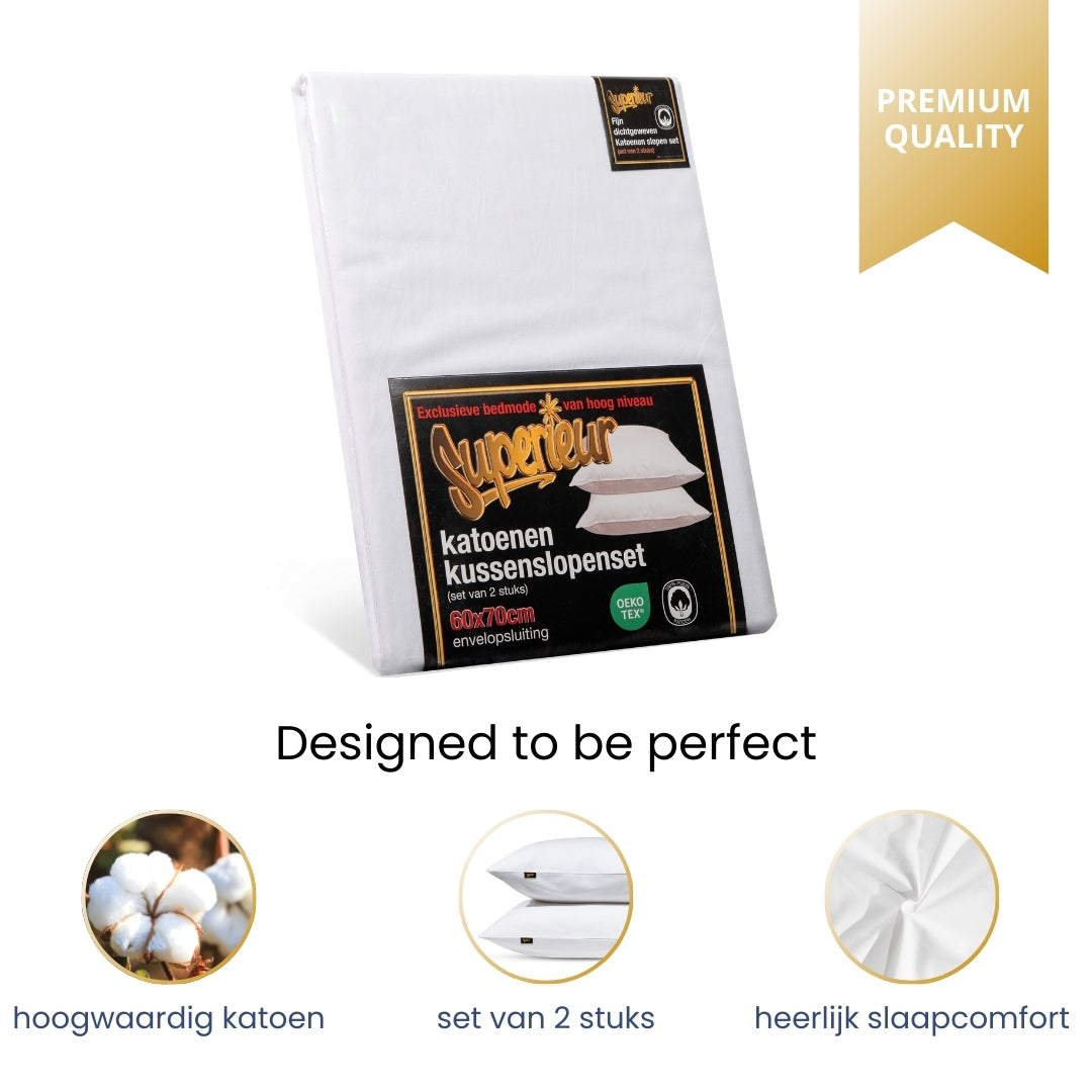 Ervaar het ultieme slaapcomfort met de luxe kussenslopen van Superieur. Deze kussenslopen zijn vervaardigd met pure klasse en afgewerkt in 100% puur natuurlijk katoen. De fijnste, bekroonde katoengarens van topkwaliteit zorgen voor een heerlijk frisse, ademende, huidvriendelijke en duurzame slaapervaring. Dankzij de perfecte pasvorm en hoogwaardige afwerking geniet u jarenlang zorgeloos van een comfortabel en stijlvol bed.