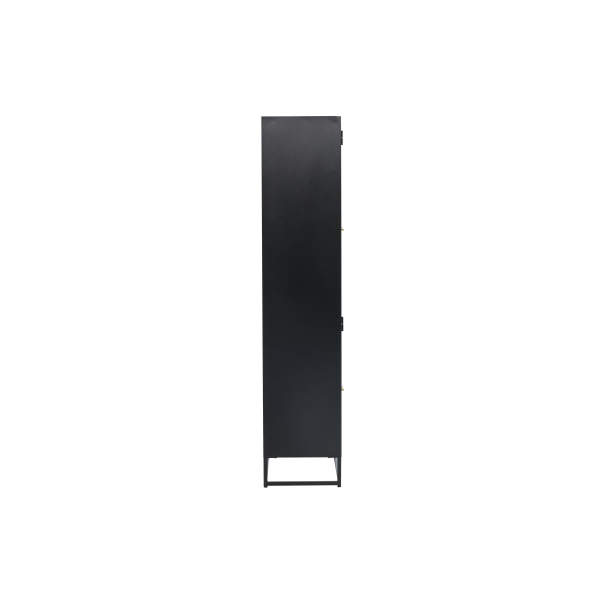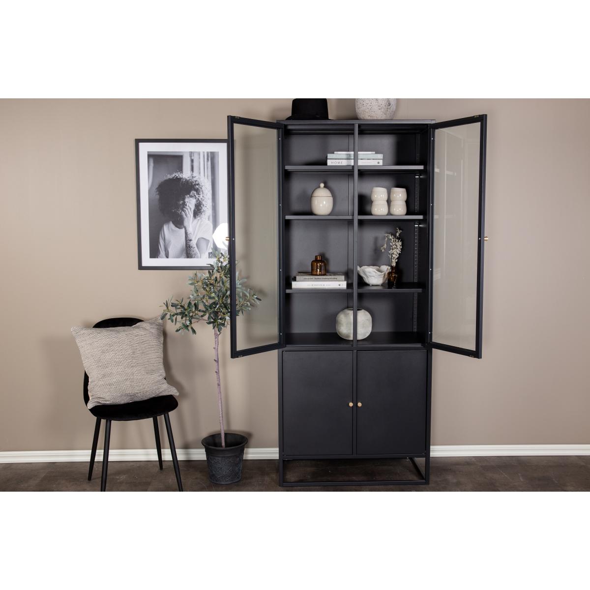 Noma vitrinekast - 80 x 190 cm - zwart is een hoge kast van zwart staal die een mooie balans biedt tussen open en gesloten opbergruimte. De bovenste glazen deuren geven de kast een lichte en luchtige uitstraling, terwijl de onderste deuren minder decoratieve items netjes uit het zicht houden. Dankzij de zwarte afwerking heeft de kast een gedurfde maar elegante uitstraling, waardoor hij in verschillende ruimtes tot zijn recht komt. Een praktische en stijlvolle toevoeging voor de keuken, woonkamer of het kantoor, waar functionaliteit en design samenkomen. Breng orde en karakter in je interieur met deze vitrinekast, die zowel als opbergmeubel als als blikvanger een statement maakt.