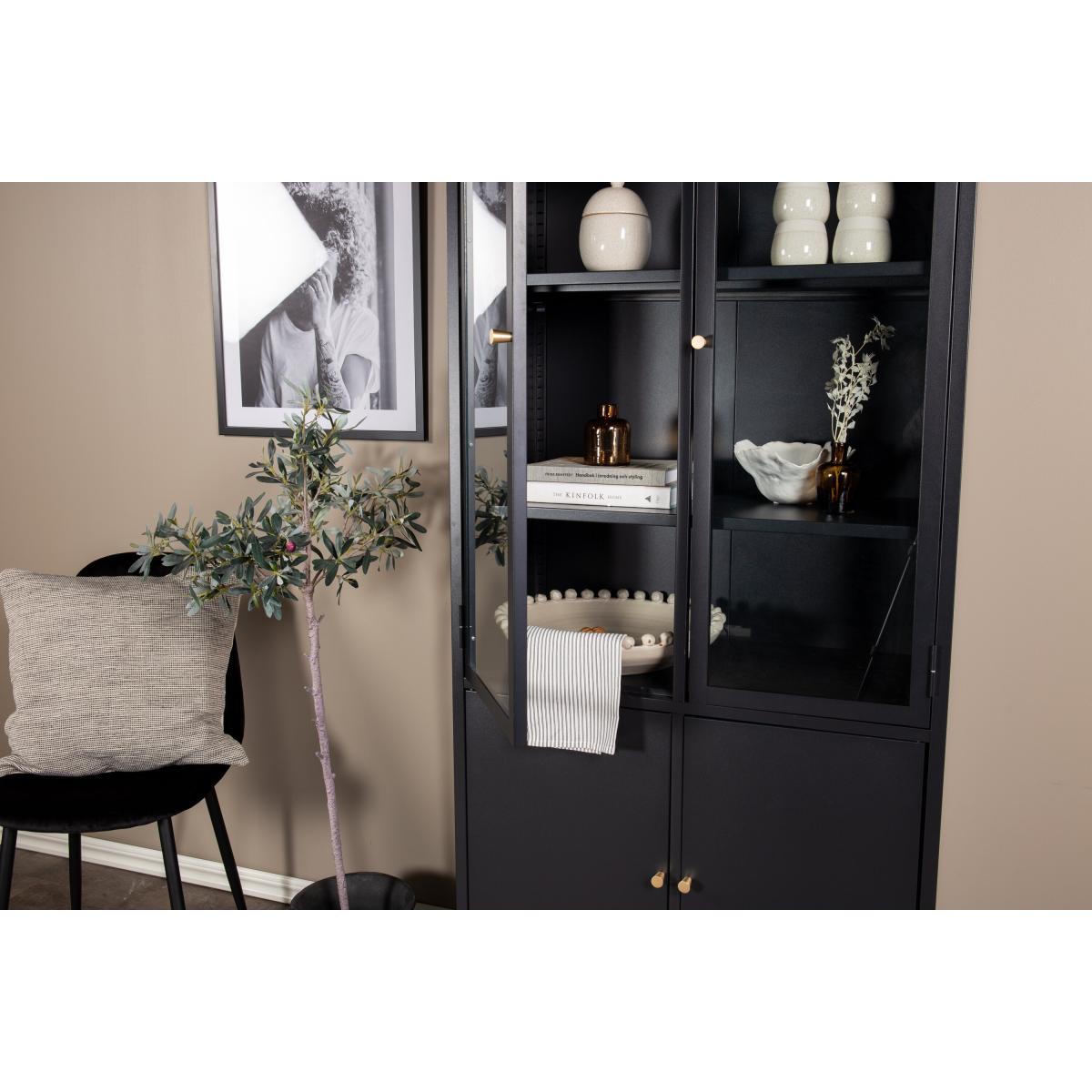 De Noma vitrinekast (80 x 190 cm) combineert zwart staal met glazen en dichte deuren voor een stijlvolle balans tussen open en gesloten opbergruimte. Deze elegante kast is een praktische blikvanger in elke keuken, woonkamer of kantoor.