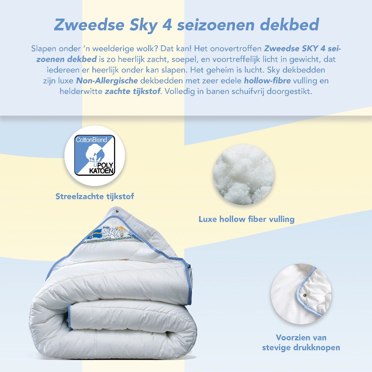 Slapen onder een weelderige wolk? Dat kan! Het onovertroffen Zweedse dubbele SKY 4-seizoenen dekbed is zo heerlijk zacht en soepel, zo voortreffelijk licht in gewicht en zo luxueus, dat iedereen eindelijk heerlijk kan slapen. Het geheim is lucht. Sky dekbedden zijn luxe non-allergische dekbedden met zeer edele hollow-fibre vulling en zachte eco-tex helderwitte polykatoenen tijk. Volledig in banen schuifvrij doorgestikt.