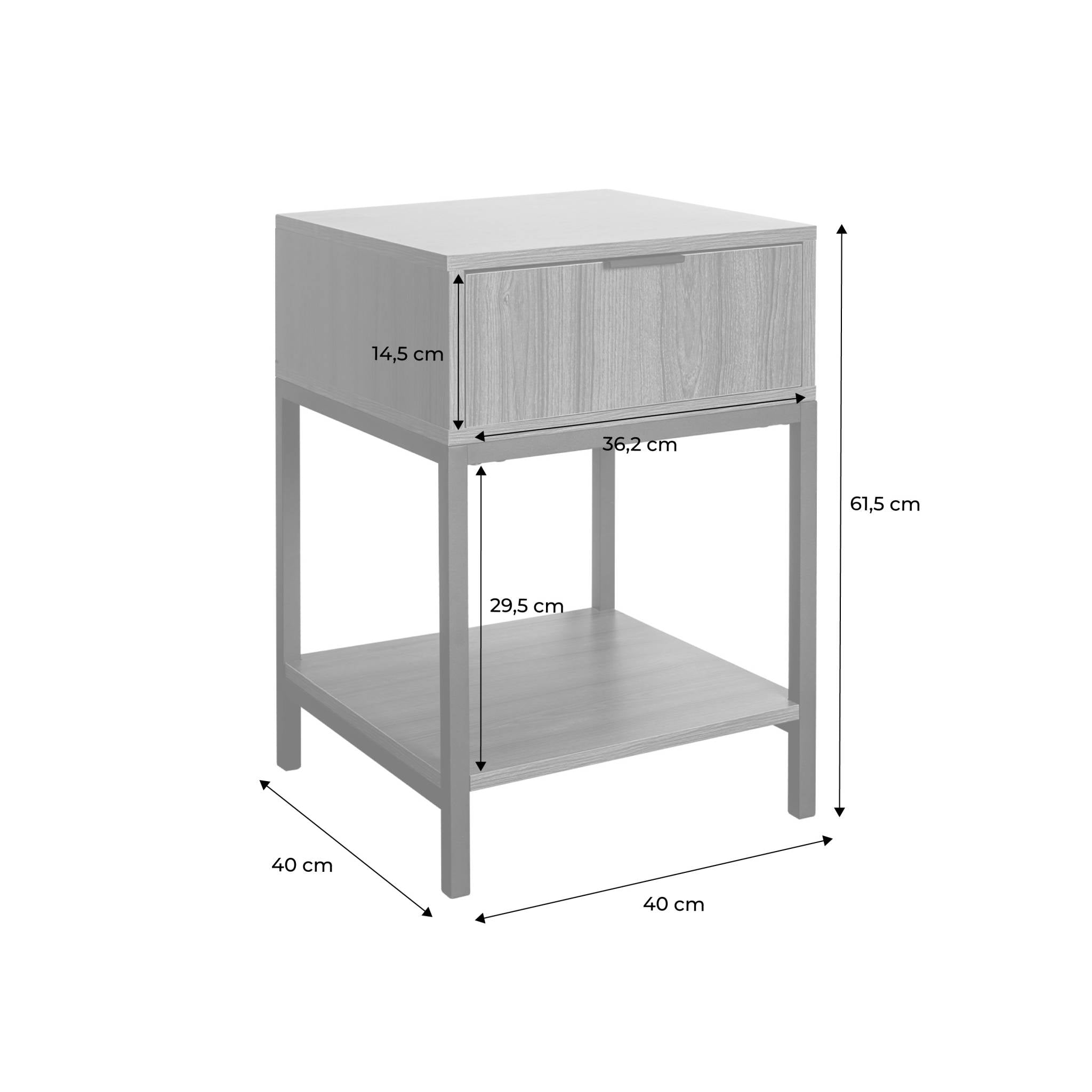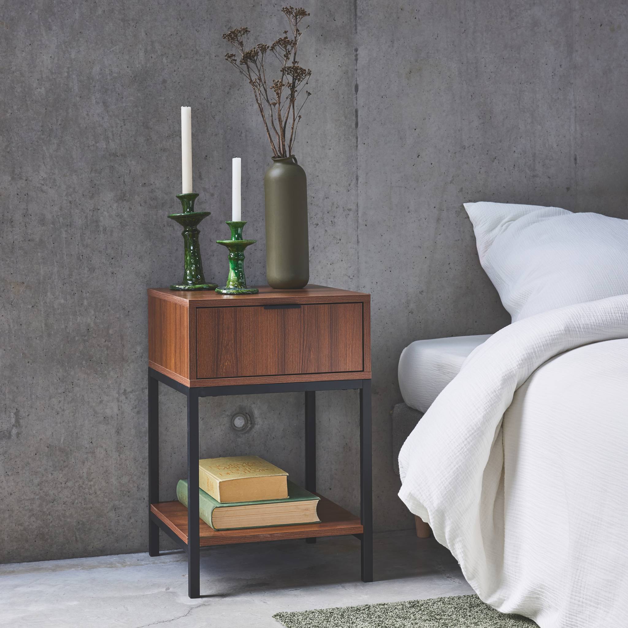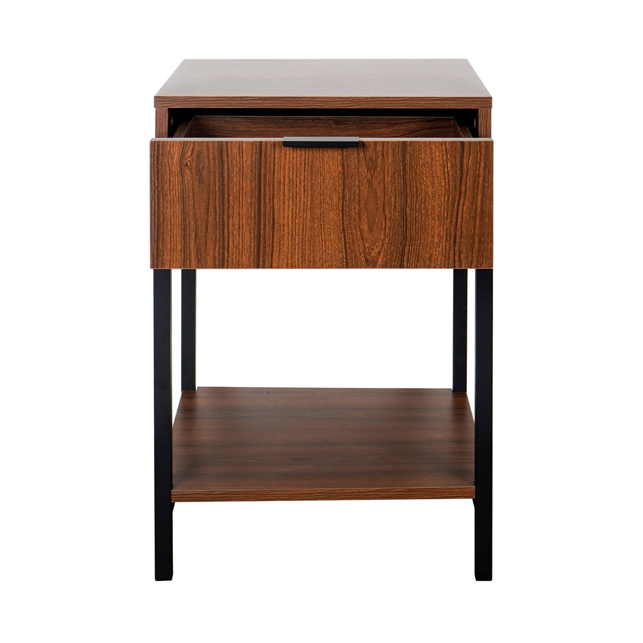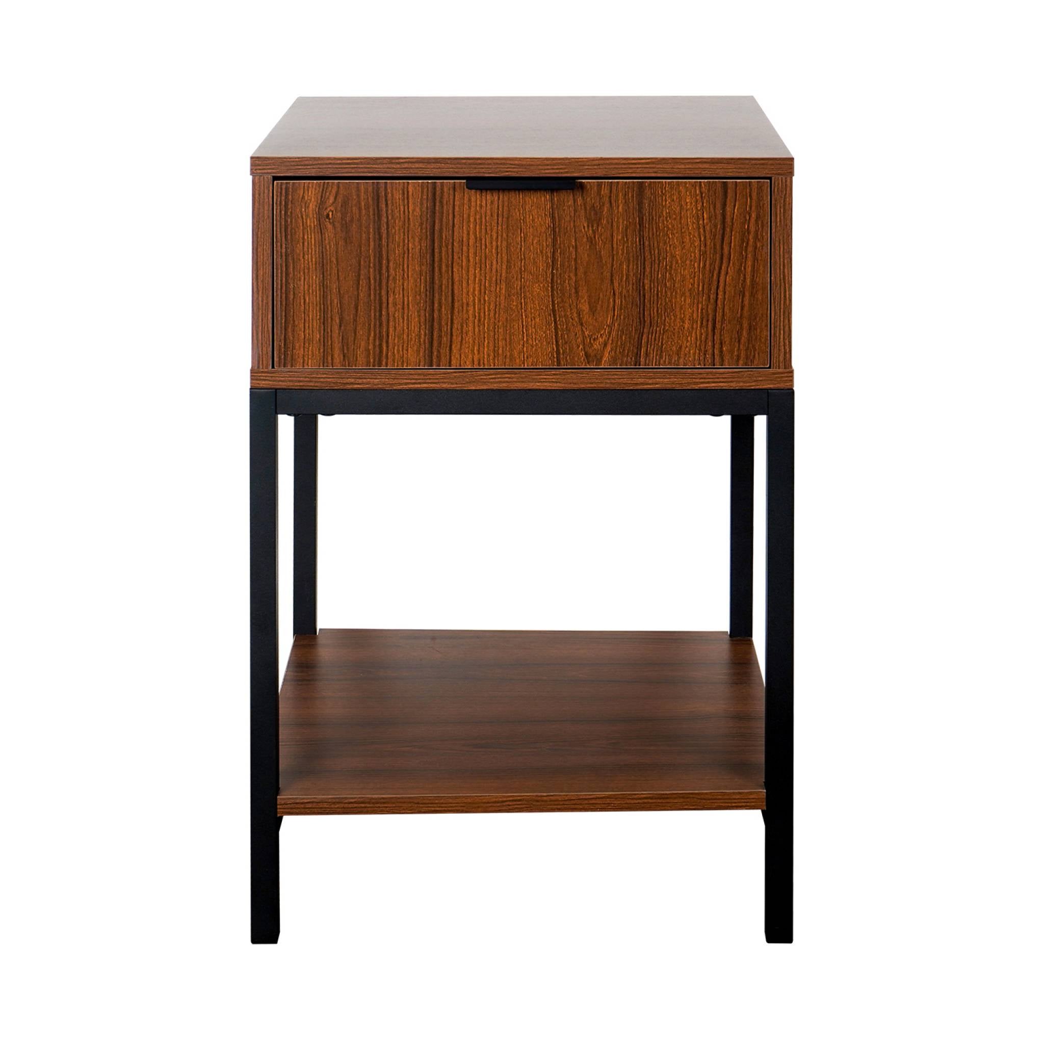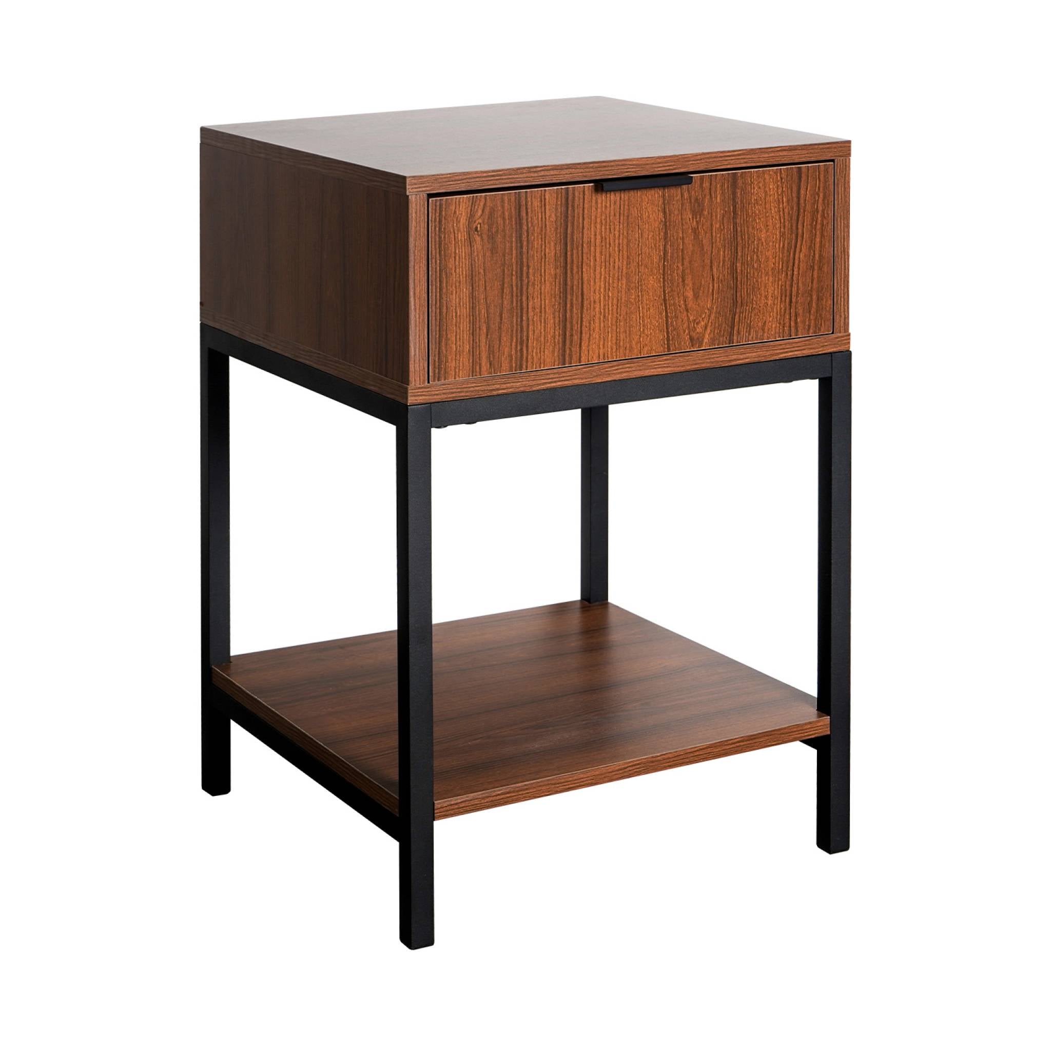 sweeek - Nachtkastje van walnootkleurig hout en zwart metaal, 1 lade