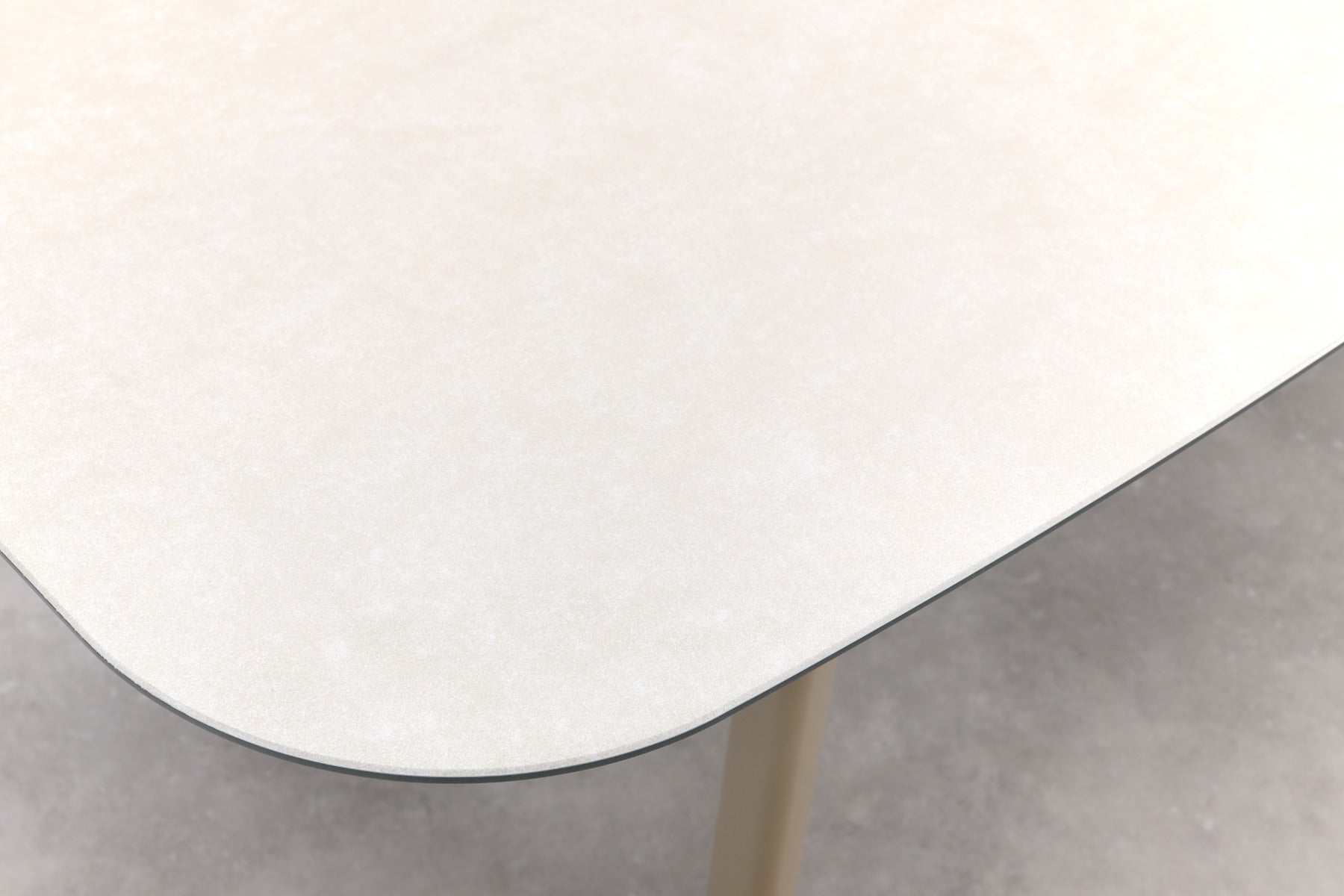Het frame van de Manolo tuintafel van Taste is gemaakt van aluminium. Dit is een geschikt materiaal voor tuinmeubelen doordat het niet gaat roesten en licht van gewicht is. Bovenop het aluminium frame is een keramiek blad in de vorm 'Deens ovaal' geplaatst. Een tafelblad van keramiek is een perfecte keus doordat het niet gaat vlekken en eenvoudig te onderhouden is. Het keramiek heeft een print gekregen die het beste omschreven kan worden als een betonlook. De strakke vormgeving van deze tafel maakt hem een echte eyecatcher!