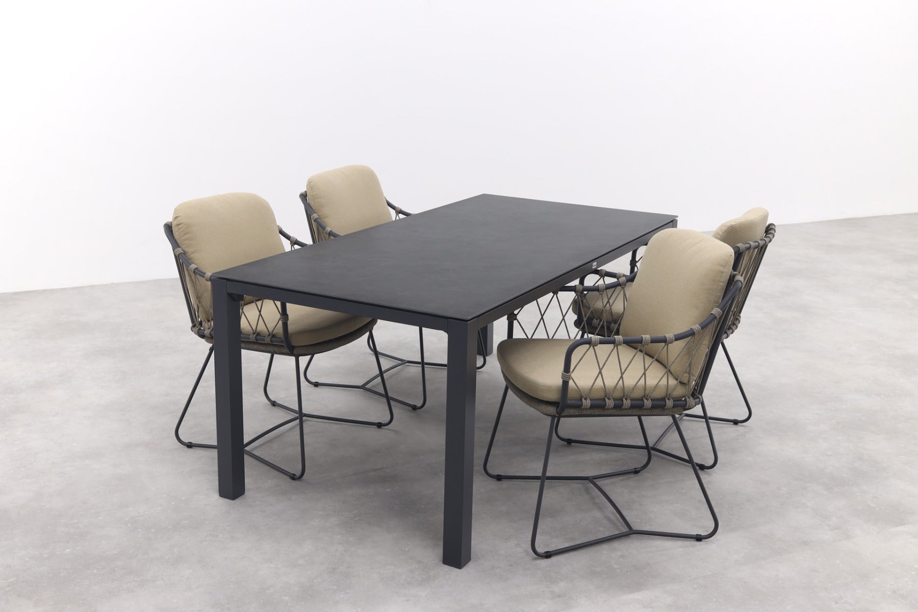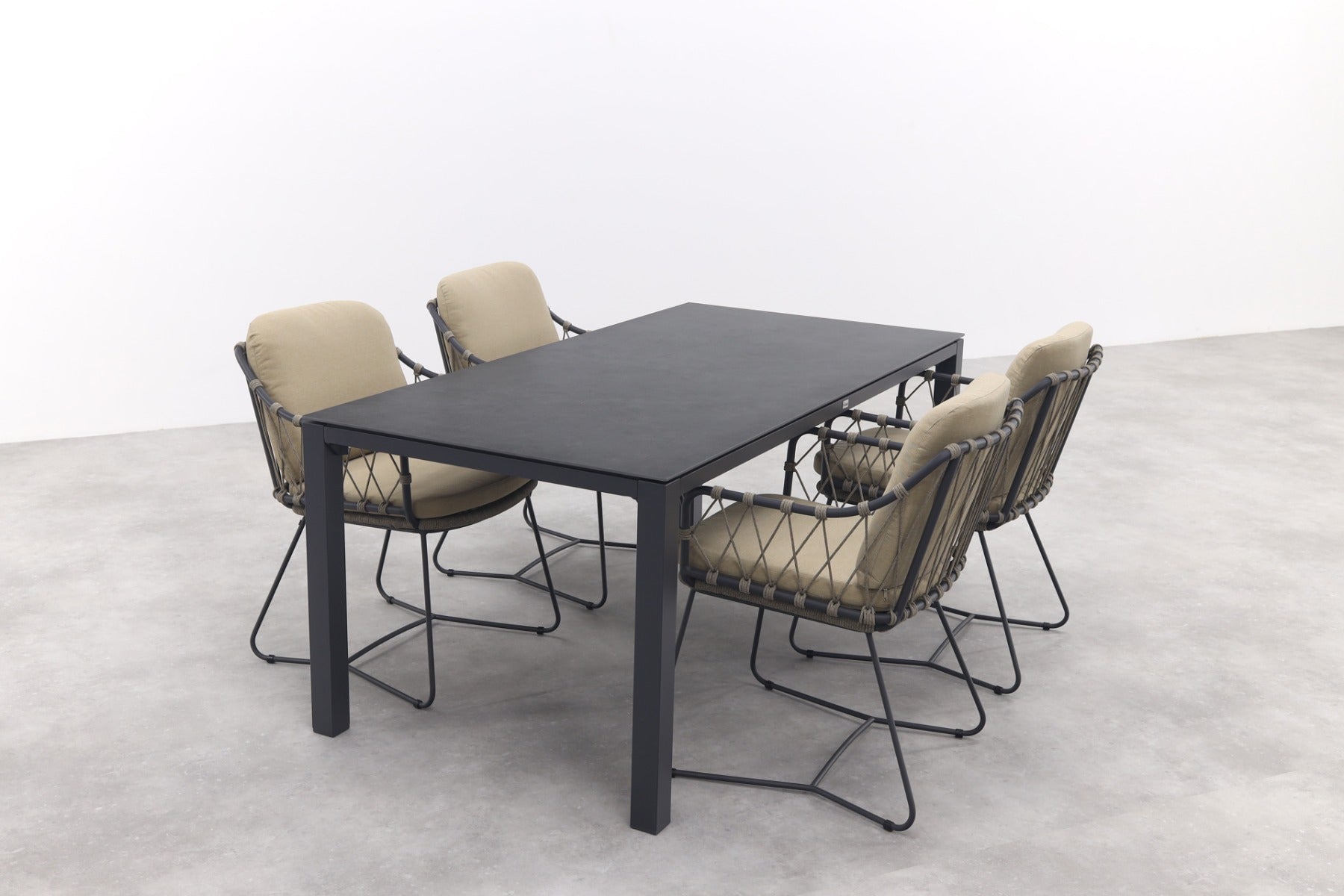 De Taste Prego/Chaneo tuinset is een échte blikvanger voor jouw buitenruimte. De Taste Prego tuinstoel met een slanke lijn in het frame met dunne rope details wordt gecombineerd met een robuuste keramische tafe. De Prego tuinstoel is een echte one of a kind door het unieke zandkleurige rope patroon. Zandkleur is dé perfecte combinatie met het antraciet van de Chaneo tuintafel. Het tafelblad heeft een subtiel betonlook motief. Ontdek zelf het comfort van de bijgeleverde kussens in onze showrooms in Opheusden, Duiven en Apeldoorn. Kom langs, neem plaats en laat je inspireren voor de perfecte buitenruimte.