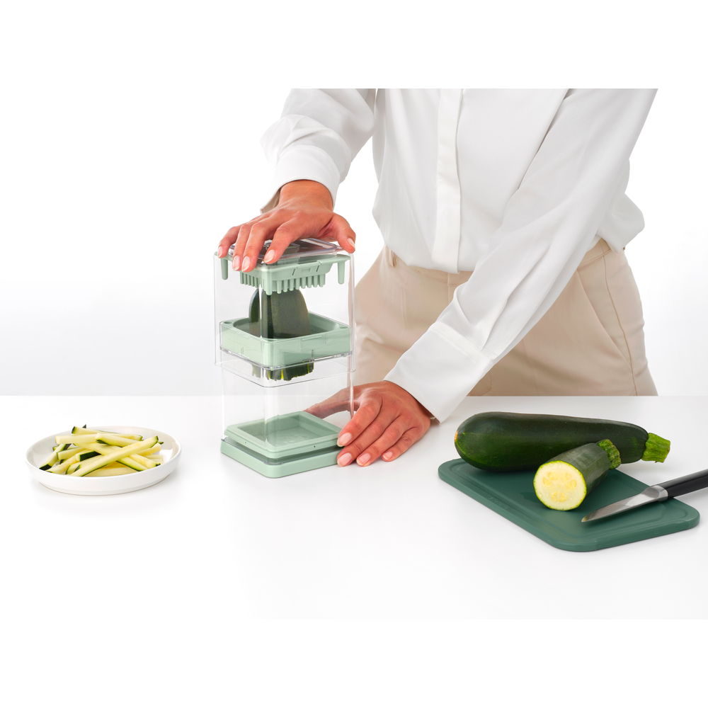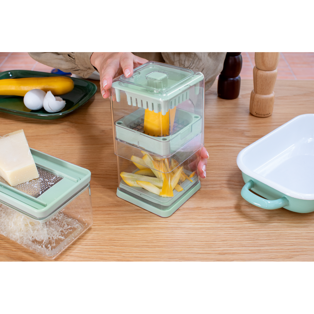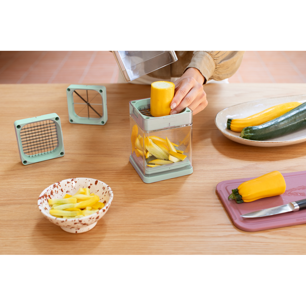 - Multitalent - simpel en snel snijden in 3 maten: 7 mm, 10 mm en partjes.