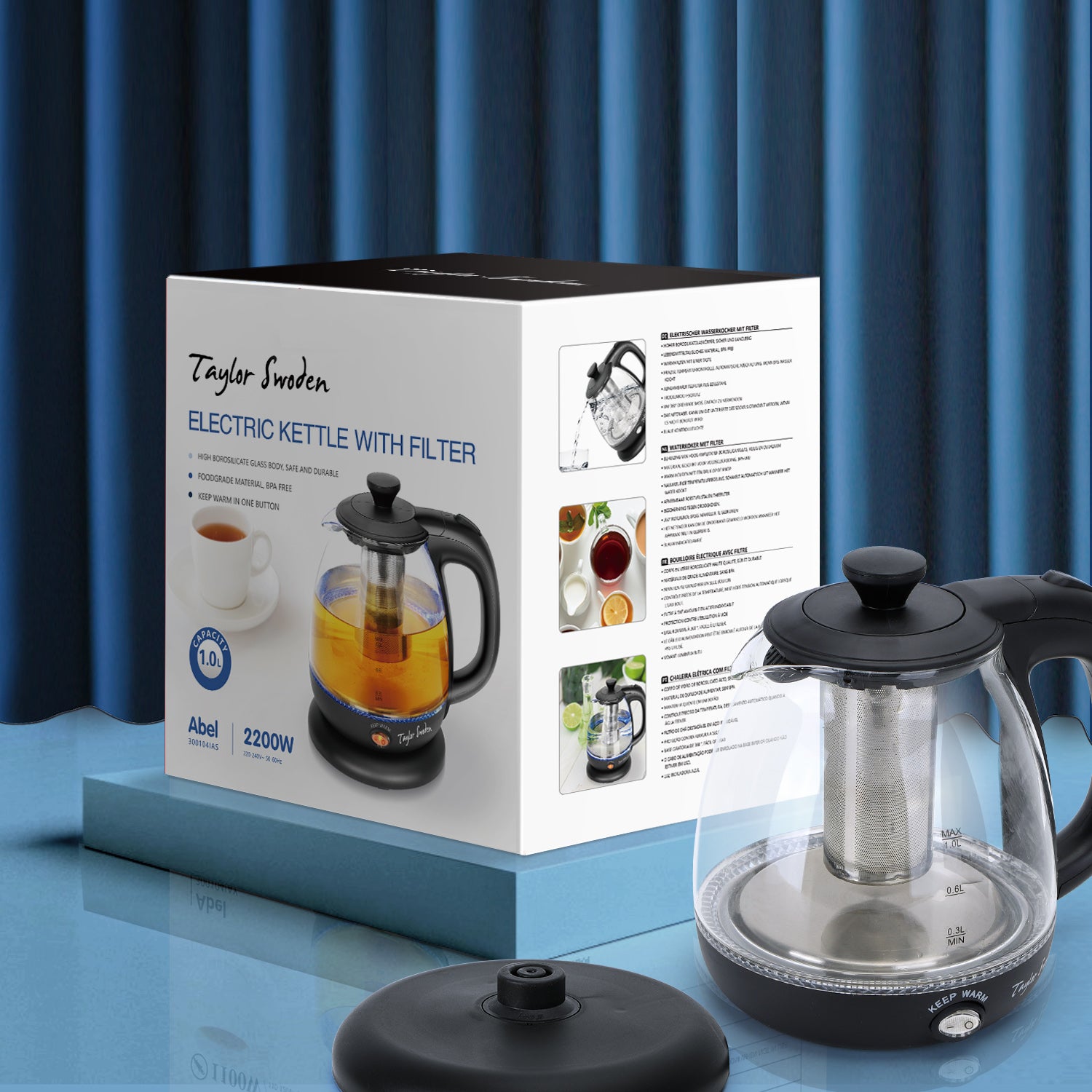 Veilig in gebruikOok deze waterkoker is gemaakt van hoge kwaliteit boroscilicaatglas en voorzien van een stijlvolle geïntegreerde blauwe LED-verlichting. Het glas is dik waardoor het veiliger, vrij van geuren, bestand tegen hoge temperaturen en corrosiebestendig is. Door het transparante glas kun je controleren hoe snel het water beschikt over een perfecte temperatuur. Het oppervlak van het glas is glad waardoor het voor bacteriën niet makkelijk is om zicht te nestelen, waardoor de waterkoker ook makkelijk schoon te maken is.Kleine inhoudMet een inhoud van 1L zet je snel en eenvoudig voor 3-4 personen thee. Met de handige waterniveaumarkering, meet je eenvoudig de juiste hoeveelheid water voor thee, soep of pasta af.KenmerkenVermogen: 2200 wattInhoud: 1 literSnoerlengte: 0,75 meterLED verlichtingUitneembaar theefilterAutomatische uitschakeling bij bereikte temperatuurWarmhoudfunctieDroogkookbeveiligingPirouette-aansluiting: 360 graden draaibaarWaterniveauaanduidingIndicatielampjeIngebouwde thermostaatHoogwaardige glaskwaliteit